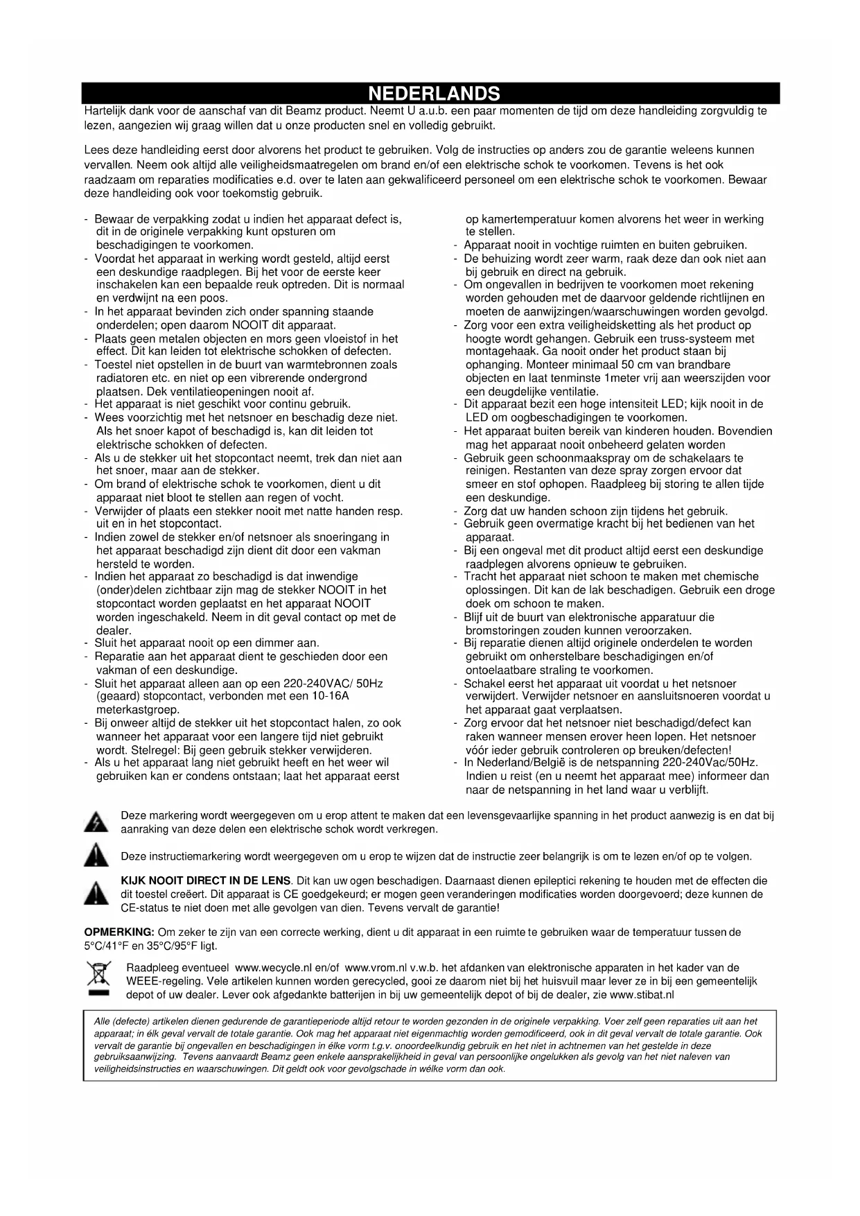 Run clean procedure in a well-ventilated area!NEDERLANDS Hartelijk dank voor de aanschaf van dit Beamz product. Neemt U a.u.b. een paar momenten de tijd om deze handleiding zorgvuldig te lezen, aangezien wij graag willen dat u onze producten snel en volledig gebruikt. Lees deze handleiding eerst door alvorens het product te gebruiken. Volg de instructies op anders zou de garantie weleens kunnen vervallen. Neem ook altijd alle veiligheidsmaatregelen om brand en/of een elektrische schok te voorkomen. Tevens is het ook raadzaam om reparaties modificaties e.d. over te laten aan gekwalificeerd personeel om een elektrische schok te voorkomen. Bewaar deze handleiding ook voor toekomstig gebruik. - Bewaar de verpakking zodat u indien het apparaat defect is, dit in de originele verpakking kunt opsturen om beschadigingen te voorkomen. - Voordat het apparaat in werking wordt gesteld, altijd eerst een deskundige raadplegen. Bij het voor de eerste keer inschakelen kan een bepaalde reuk optreden. Dit is normaal en verdwijnt na een poos. - In het apparaat bevinden zich onder spanning staande onderdelen; open daarom NOOIT dit apparaat. - Plaats geen metalen objecten en mors geen vloeistof in het effect. Dit kan leiden tot elektrische schokken of defecten. - Toestel niet opstellen in de buurt van warmtebronnen zoals radiatoren etc. en niet op een vibrerende ondergrond plaatsen. Dek ventilatieopeningen nooit af. - Het apparaat is niet geschikt voor continu gebruik. - Wees voorzichtig met het netsnoer en beschadig deze niet. Als het snoer kapot of beschadigd is, kan dit leiden tot elektrische schokken of defecten. - Als u de stekker uit het stopcontact neemt, trek dan niet aan het snoer, maar aan de stekker. - Om brand of elektrische schok te voorkomen, dient u dit apparaat niet bloot te stellen aan regen of vocht. - Verwijder of plaats een stekker nooit met natte handen resp. uit en in het stopcontact. - Indien zowel de stekker en/of netsnoer als snoeringang in het apparaat beschadigd zijn dient dit door een vakman hersteld te worden. - Indien het apparaat zo beschadigd is dat inwendige (onder)delen zichtbaar zijn mag de stekker NOOIT in het stopcontact worden geplaatst en het apparaat NOOIT worden ingeschakeld. Neem in dit geval contact op met de dealer. - Sluit het apparaat nooit op een dimmer aan. - Reparatie aan het apparaat dient te geschieden door een vakman of een deskundige. - Sluit het apparaat alleen aan op een 220-240VAC/ 50Hz (geaard) stopcontact, verbonden met een 10-16A meterkastgroep. - Bij onweer altijd de stekker uit het stopcontact halen, zo ook wanneer het apparaat voor een langere tijd niet gebruikt wordt. Stelregel: Bij geen gebruik stekker verwijderen. - Als u het apparaat lang niet gebruikt heeft en het weer wil gebruiken kan er condens ontstaan; laat het apparaat eerst op kamertemperatuur komen alvorens het weer in werking te stellen. - Apparaat nooit in vochtige ruimten en buiten gebruiken. - De behuizing wordt zeer warm, raak deze dan ook niet aan bij gebruik en direct na gebruik. - Om ongevallen in bedrijven te voorkomen moet rekening worden gehouden met de daarvoor geldende richtlijnen en moeten de aanwijzingen/waarschuwingen worden gevolgd. - Zorg voor een extra veiligheidsketting als het product op hoogte wordt gehangen. Gebruik een truss-systeem met montagehaak. Ga nooit onder het product staan bij ophanging. Monteer minimaal 50 cm van brandbare objecten en laat tenminste 1meter vrij aan weerszijden voor een deugdelijke ventilatie. - Dit apparaat bezit een hoge intensiteit LED; kijk nooit in de LED om oogbeschadigingen te voorkomen. - Het apparaat buiten bereik van kinderen houden. Bovendien mag het apparaat nooit onbeheerd gelaten worden - Gebruik geen schoonmaakspray om de schakelaars te reinigen. Restanten van deze spray zorgen ervoor dat smeer en stof ophopen. Raadpleeg bij storing te allen tijde een deskundige. - Zorg dat uw handen schoon zijn tijdens het gebruik. - Gebruik geen overmatige kracht bij het bedienen van het apparaat. - Bij een ongeval met dit product altijd eerst een deskundige raadplegen alvorens opnieuw te gebruiken. - Tracht het apparaat niet schoon te maken met chemische oplossingen. Dit kan de lak beschadigen. Gebruik een droge doek om schoon te maken. - Blijf uit de buurt van elektronische apparatuur die bromstoringen zouden kunnen veroorzaken. - Bij reparatie dienen altijd originele onderdelen te worden gebruikt om onherstelbare beschadigingen en/of ontoelaatbare straling te voorkomen. - Schakel eerst het apparaat uit voordat u het netsnoer verwijdert. Verwijder netsnoer en aansluitsnoeren voordat u het apparaat gaat verplaatsen. - Zorg ervoor dat het netsnoer niet beschadigd/defect kan raken wanneer mensen erover heen lopen. Het netsnoer vóór ieder gebruik controleren op breuken/defecten! - In Nederland/België is de netspanning 220-240Vac/50Hz. Indien u reist (en u neemt het apparaat mee) informeer dan naar de netspanning in het land waar u verblijft. Deze markering wordt weergegeven om u erop attent te maken dat een levensgevaarlijke spanning in het product aanwezig is en dat bij aanraking van deze delen een elektrische schok wordt verkregen. Deze instructiemarkering wordt weergegeven om u erop te wijzen dat de instructie zeer belangrijk is om te lezen en/of op te volgen. KIJK NOOIT DIRECT IN DE LENS. Dit kan uw ogen beschadigen. Daarnaast dienen epileptici rekening te houden met de effecten die dit toestel creëert. Dit apparaat is CE goedgekeurd; er mogen geen veranderingen modificaties worden doorgevoerd; deze kunnen de CE-status te niet doen met alle gevolgen van dien. Tevens vervalt de garantie! OPMERKING: Om zeker te zijn van een correcte werking, dient u dit apparaat in een ruimte te gebruiken waar de temperatuur tussen de 5°C/41°F en 35°C/95°F ligt. Raadpleeg eventueel www.wecycle.nl en/of www.vrom.nl v.w.b. het afdanken van elektronische apparaten in het kader van de WEEE-regeling. Vele artikelen kunnen worden gerecycled, gooi ze d