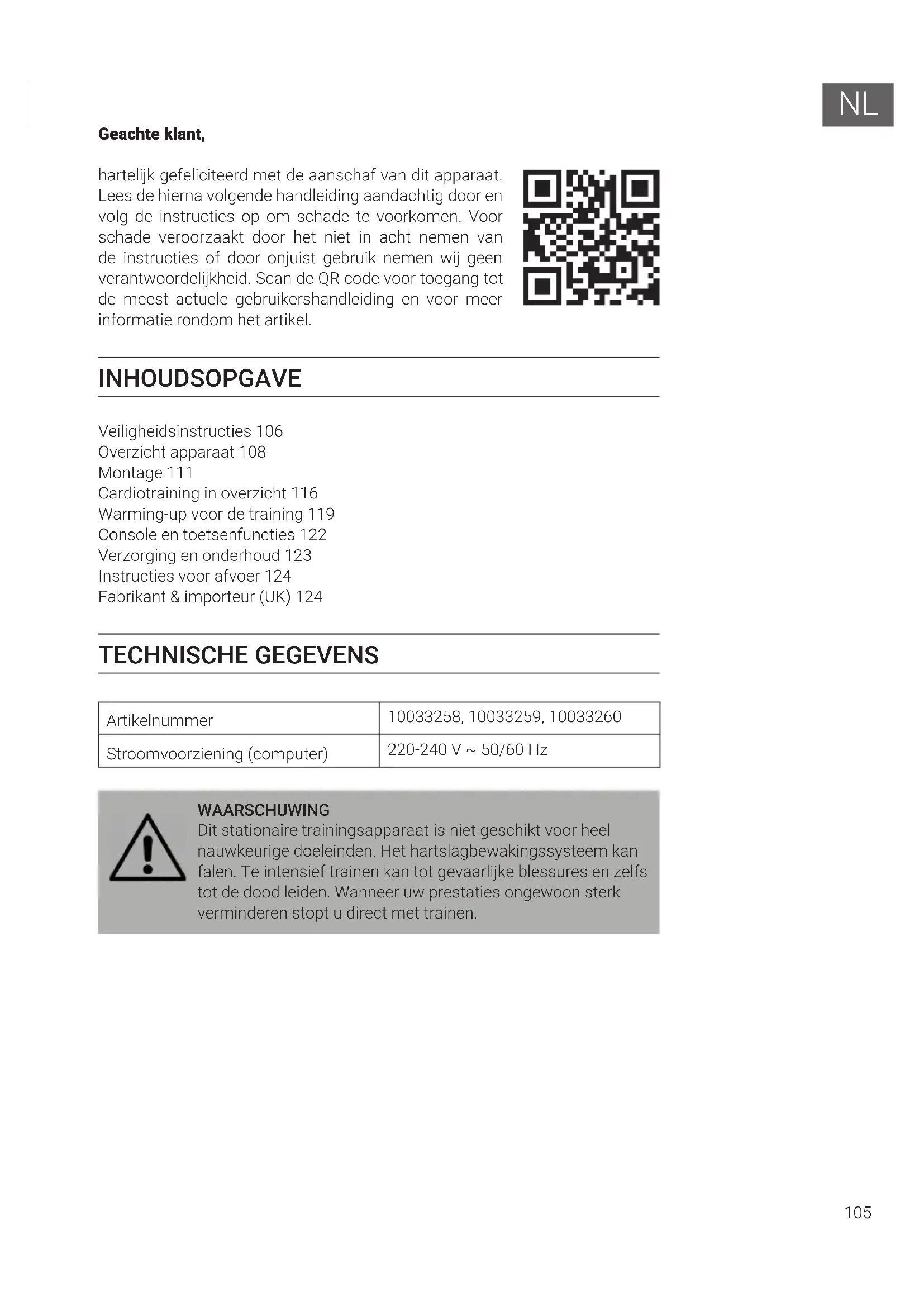 Geachte klant, hartelijk gefeliciteerd met de aanschaf van dit apparaat. Lees de hierna volgende handleiding aandachtig door en volg de instructies op om schade te voorkomen. Voor schade veroorzaakt door het niet in acht nemen van de instructies of door onjuist gebruik nemen wij geen verantwoordelijkheid. Scan de QR code voor toegang tot de meest actuele gebruikershandleiding en voor meer informatie rondom het artikel. INHOUDSOPGAVE Veiligheidsinstructies 106 Overzicht apparaat 108 Montage 111 Cardiotraining in overzicht 116 Warming-up voor de training 119 Console en toetsenfuncties 122 Verzorging en onderhoud 123 Instructies voor afvoer 124 Fabrikant & importeur (UK) 124 TECHNISCHE GEGEVENS Artikelnummer 10033258, 10033259, 10033260 Stroomvoorziening (computer) 220-240 V ~ 50/60 Hz WAARSCHUWING Dit stationaire trainingsapparaat is niet geschikt voor heel nauwkeurige doeleinden. Het hartslagbewakingssysteem kan falen. Te intensief trainen kan tot gevaarlijke blessures en zelfs tot de dood leiden. Wanneer uw prestaties ongewoon sterk verminderen stopt u direct met trainen.106