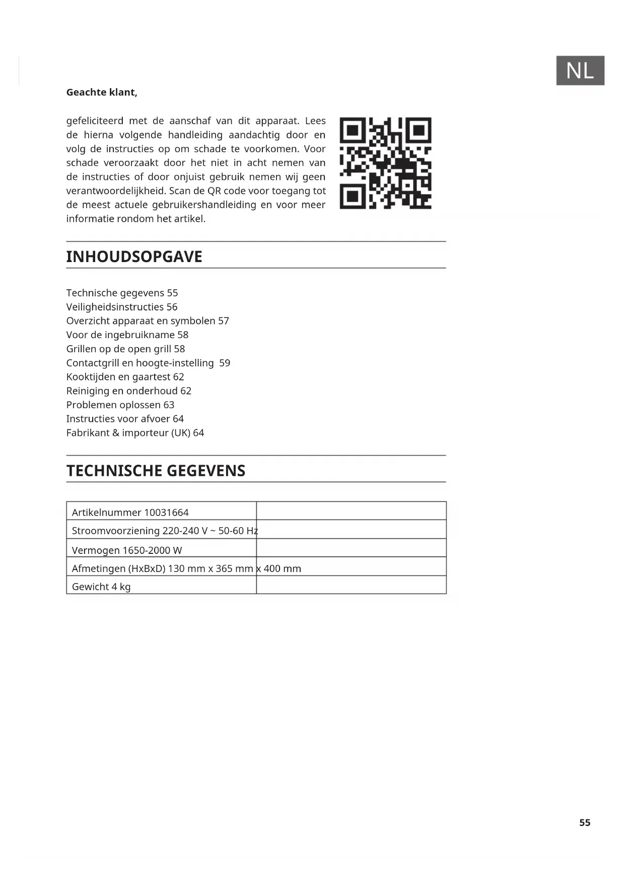 Geachte klant, gefeliciteerd met de aanschaf van dit apparaat. Lees de hierna volgende handleiding aandachtig door en volg de instructies op om schade te voorkomen. Voor schade veroorzaakt door het niet in acht nemen van de instructies of door onjuist gebruik nemen wij geen verantwoordelijkheid. Scan de QR code voor toegang tot de meest actuele gebruikershandleiding en voor meer informatie rondom het artikel. INHOUDSOPGAVE Technische gegevens 55 Veiligheidsinstructies 56 Overzicht apparaat en symbolen 57 Voor de ingebruikname 58 Grillen op de open grill 58 Contactgrill en hoogte-instelling 59 Kooktijden en gaartest 62 Reiniging en onderhoud 62 Problemen oplossen 63 Instructies voor afvoer 64 Fabrikant & importeur (UK) 64 TECHNISCHE GEGEVENS Artikelnummer 10031664 Stroomvoorziening 220-240 V ~ 50-60 Hz Vermogen 1650-2000 W Afmetingen (HxBxD) 130 mm x 365 mm x 400 mm Gewicht 4 kg56