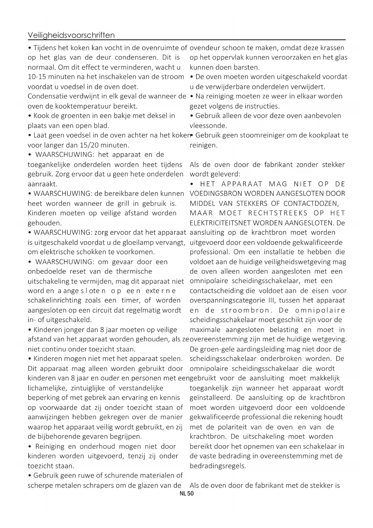 MIDDEL VAN STEKKERS OF CONTACTDOZEN, M A A R M O E T R E C H T S T R E EKS O P H E T ELEKTRICITEITSNET WORDEN AANGESLOTEN. De aansluiting op de krachtbron moet worden uitgevoerd door een voldoende gekwalificeerde professional. Om een installatie te hebben die voldoet aan de huidige veiligheidswetgeving mag de oven alleen worden aangesloten met een omnipolaire scheidingsschakelaar, met een contactscheiding die voldoet aan de eisen voor overspanningscategorie III, tussen het apparaat e n d e s t ro o m b r o n . D e o m n i p o l a i r e scheidingsschakelaar moet geschikt zijn voor de maximale aangesloten belasting en moet in overeenstemming zijn met de huidige wetgeving. De groen-gele aardingsleiding mag niet door de scheidingsschakelaar onderbroken worden. De omnipolaire scheidingsschakelaar die wordt gebruikt voor de aansluiting moet makkelijk toegankelijk zijn wanneer het apparaat wordt geïnstalleerd. De aansluiting op de krachtbron moet worden uitgevoerd door een voldoende gekwalificeerde professional die rekening houdt met de polariteit van de oven en van de krachtbron. De uitschakeling moet worden bereikt door het opnemen van een schakelaar in de vaste bedrading in overeenstemming met de bedradingsregels. Als de oven door de fabrikant met de stekker is NL 50geleverd: