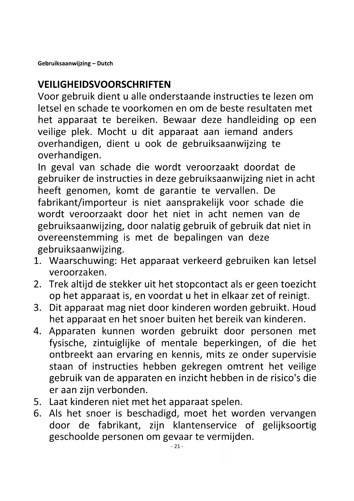 6. Als het snoer is beschadigd, moet het worden vervangen