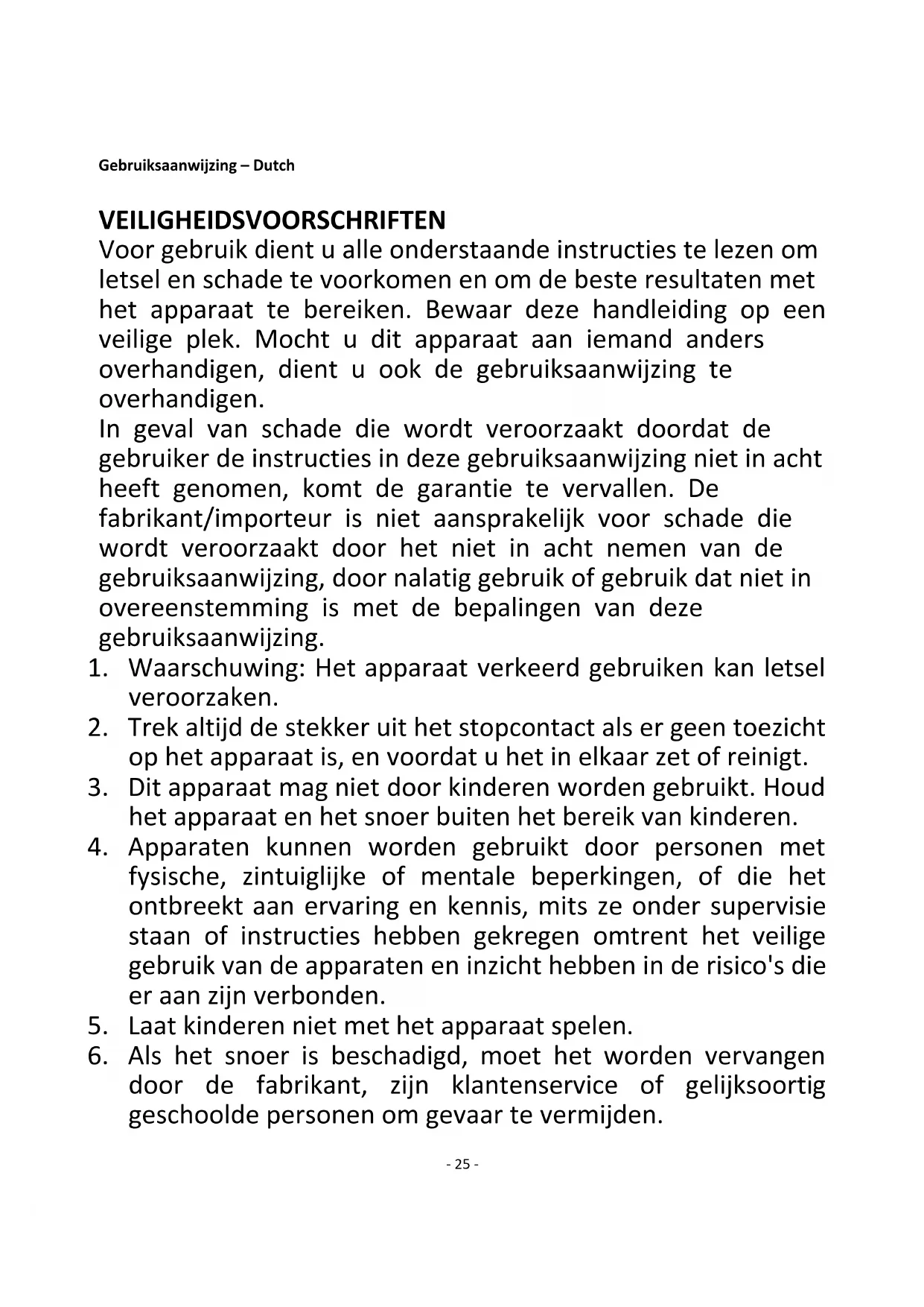 25. Gebruik het apparaat niet zonder deksel.