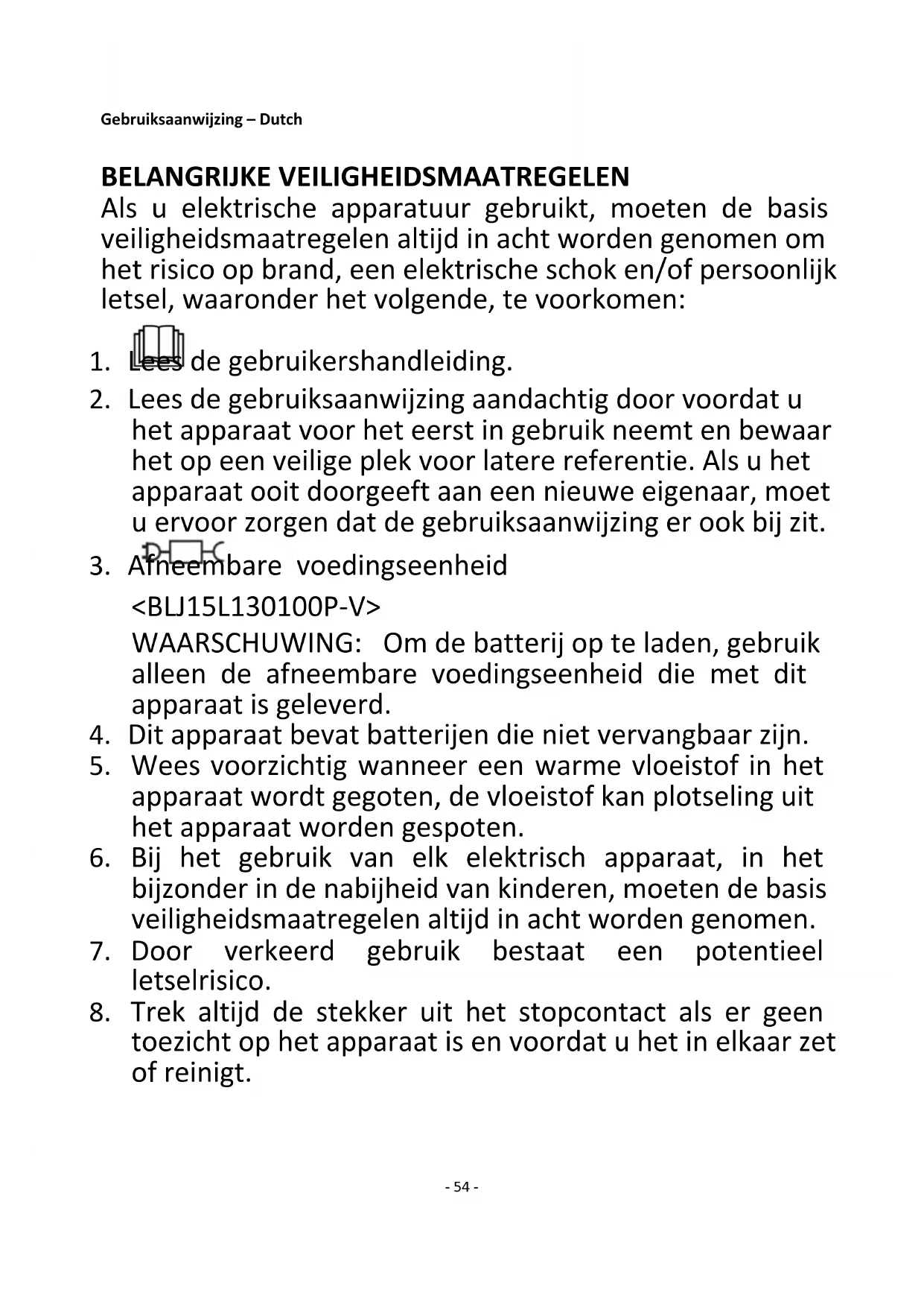 het apparaat voor het eerst in gebruik neemt en bewaar het op een veilige plek voor latere referentie. Als u het apparaat ooit doorgeeft aan een nieuwe eigenaar, moet u ervoor zorgen dat de gebruiksaanwijzing er ook bij zit.