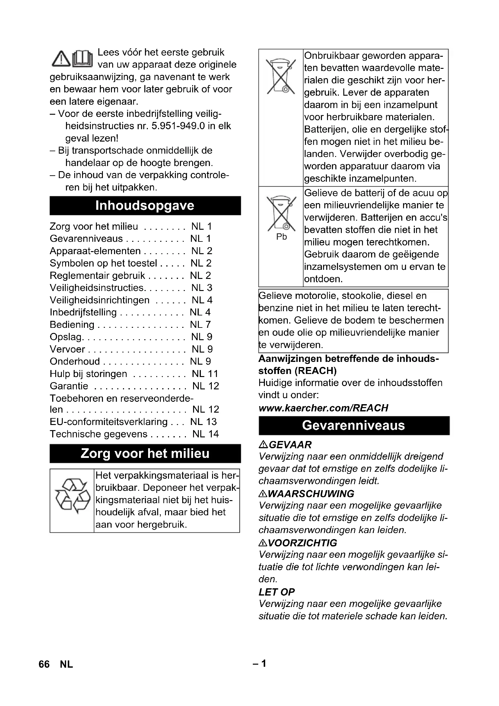 65IT– 1 Lees vóór het eerste gebruik van uw apparaat deze originele gebruiksaanwijzing, ga navenant te werk en bewaar hem voor later gebruik of voor een latere eigenaar. – Voor de eerste inbedrijfstelling veilig- heidsinstructies nr. 5.951-949.0 in elk geval lezen! – Bij transportschade onmiddellijk de handelaar op de hoogte brengen. – De inhoud van de verpakking controle- ren bij het uitpakken. Aanwijzingen betreffende de inhouds- stoffen (REACH) Huidige informatie over de inhoudsstoffen vindt u onder: www.kaercher.com/REACH GEVAAR Verwijzing naar een onmiddellijk dreigend gevaar dat tot ernstige en zelfs dodelijke li- chaamsverwondingen leidt. 몇 WAARSCHUWING Verwijzing naar een mogelijke gevaarlijke situatie die tot ernstige en zelfs dodelijke li- chaamsverwondingen kan leiden. 몇 VOORZICHTIG Verwijzing naar een mogelijk gevaarlijke si- tuatie die tot lichte verwondingen kan lei- den. LET OP Verwijzing naar een mogelijke gevaarlijke situatie die tot materiele schade kan leiden. Inhoudsopgave Zorg voor het milieu . . . . . . . . NL 1 Gevarenniveaus . . . . . . . . . . . NL 1 Apparaat-elementen . . . . . . . . NL 2 Symbolen op het toestel . . . . . NL 2 Reglementair gebruik . . . . . . . NL 2 Veiligheidsinstructies. . . . . . . . NL 3 Veiligheidsinrichtingen . . . . . . NL 4 Inbedrijfstelling . . . . . . . . . . . . NL 4 Bediening . . . . . . . . . . . . . . . . NL 7 Opslag. . . . . . . . . . . . . . . . . . . NL 9 Vervoer . . . . . . . . . . . . . . . . . . NL 9 Onderhoud . . . . . . . . . . . . . . . NL 9 Hulp bij storingen . . . . . . . . . . NL 11 Garantie . . . . . . . . . . . . . . . . . NL 12 Toebehoren en reserveonderde- len . . . . . . . . . . . . . . . . . . . . . . NL 12 EU-conformiteitsverklaring . . . NL 13 Technische gegevens . . . . . . . NL 14 Zorg voor het milieu Het verpakkingsmateriaal is her- bruikbaar. Deponeer het verpak- kingsmateriaal niet bij het huis- houdelijk afval, maar bied het aan voor hergebruik. Onbruikbaar geworden appara- ten bevatten waardevolle mate- rialen die geschikt zijn voor her- gebruik. Lever de apparaten daarom in bij een inzamelpunt voor herbruikbare materialen. Batterijen, olie en dergelijke stof- fen mogen niet in het milieu be- landen. Verwijder overbodig ge- worden apparatuur daarom via geschikte inzamelpunten. Gelieve de batterij of de acuu op een milieuvriendelijke manier te verwijderen. Batterijen en accu's bevatten stoffen die niet in het milieu mogen terechtkomen. Gebruik daarom de geëigende inzamelsystemen om u ervan te ontdoen. Gelieve motorolie, stookolie, diesel en benzine niet in het milieu te laten terecht- komen. Gelieve de bodem te beschermen en oude olie op milieuvriendelijke manier te verwijderen. Gevarenniveaus