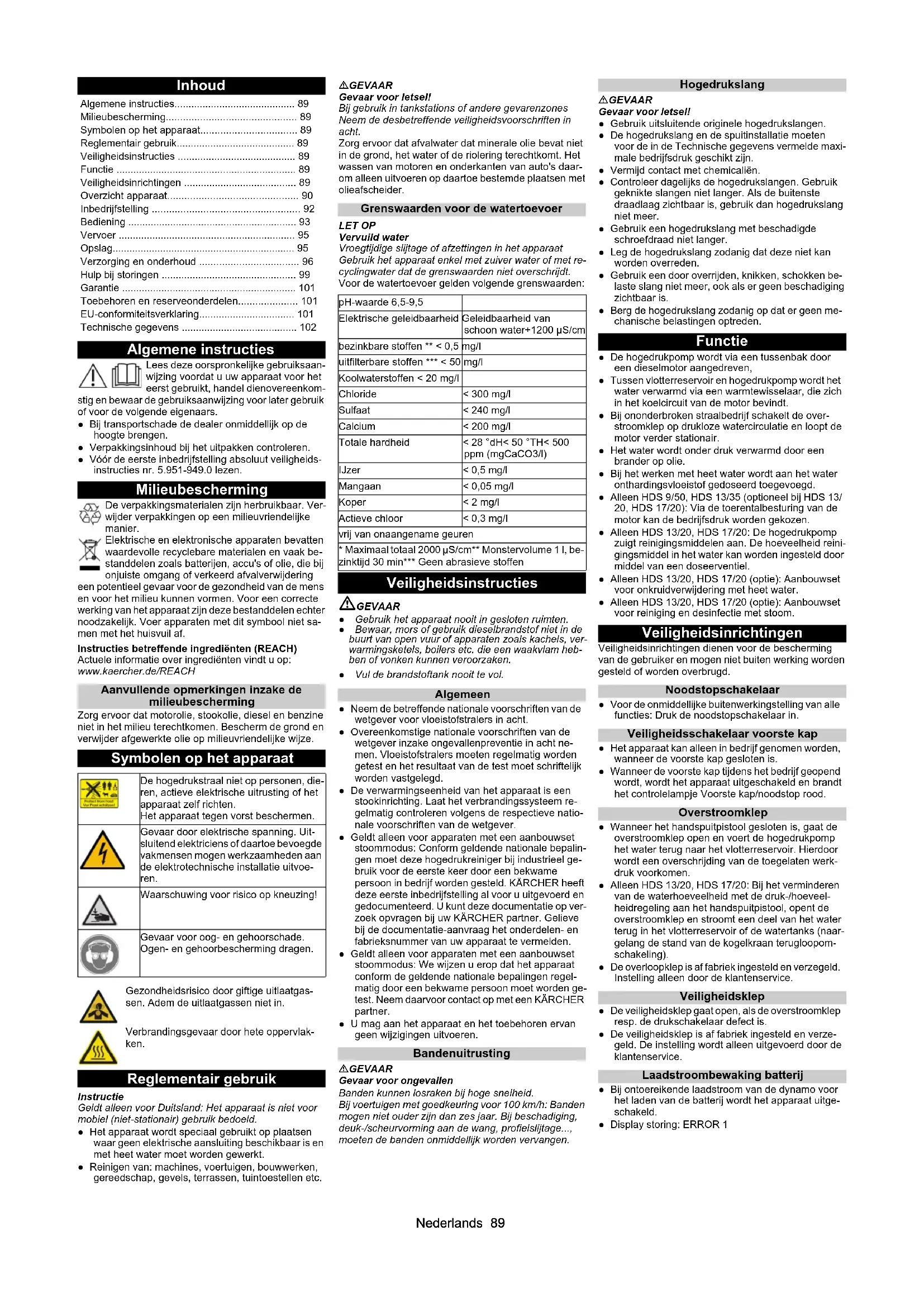 • , moeten de banden onmiddellijk worden vervangen. Hogedrukslang GEVAAR Gevaar voor letsel! ● Gebruik uitsluitende originele hogedrukslangen. ● De hogedrukslang en de spuitinstallatie moeten voor de in de Technische gegevens vermelde maxi- male bedrijfsdruk geschikt zijn. ● Vermijd contact met chemicaliën. ● Controleer dagelijks de hogedrukslangen. Gebruik geknikte slangen niet langer. Als de buitenste draadlaag zichtbaar is, gebruik dan hogedrukslang niet meer. ● Gebruik een hogedrukslang met beschadigde schroefdraad niet langer. ● Leg de hogedrukslang zodanig dat deze niet kan worden overreden. ● Gebruik een door overrijden, knikken, schokken be- laste slang niet meer, ook als er geen beschadiging zichtbaar is. ● Berg de hogedrukslang zodanig op dat er geen me- chanische belastingen optreden. Functie ● De hogedrukpomp wordt via een tussenbak door een dieselmotor aangedreven, ● Tussen vlotterreservoir en hogedrukpomp wordt het water verwarmd via een warmtewisselaar, die zich in het koelcircuit van de motor bevindt. ● Bij ononderbroken straalbedrijf schakelt de over- stroomklep op drukloze watercirculatie en loopt de motor verder stationair. ● Het water wordt onder druk verwarmd door een brander op olie. ● Bij het werken met heet water wordt aan het water onthardingsvloeistof gedoseerd toegevoegd. ● Alleen HDS 9/50, HDS 13/35 (optioneel bij HDS 13/ 20, HDS 17/20): Via de toerentalbesturing van de motor kan de bedrijfsdruk worden gekozen. ● Alleen HDS 13/20, HDS 17/20: De hogedrukpomp zuigt reinigingsmiddelen aan. De hoeveelheid reini- gingsmiddel in het water kan worden ingesteld door middel van een doseerventiel. ● Alleen HDS 13/20, HDS 17/20 (optie): Aanbouwset voor onkruidverwijdering met heet water. ● Alleen HDS 13/20, HDS 17/20 (optie): Aanbouwset voor reiniging en desinfectie met stoom. Veiligheidsinrichtingen Veiligheidsinrichtingen dienen voor de bescherming van de gebruiker en mogen niet buiten werking worden gesteld of worden overbrugd. Noodstopschakelaar ● Voor de onmiddellijke buitenwerkingstelling van alle functies: Druk de noodstopschakelaar in. Veiligheidsschakelaar voorste kap ● Het apparaat kan alleen in bedrijf genomen worden, wanneer de voorste kap gesloten is. ● Wanneer de voorste kap tijdens het bedrijf geopend wordt, wordt het apparaat uitgeschakeld en brandt het controlelampje Voorste kap/noodstop rood. Overstroomklep ● Wanneer het handspuitpistool gesloten is, gaat de overstroomklep open en voert de hogedrukpomp het water terug naar het vlotterreservoir. Hierdoor wordt een overschrijding van de toegelaten werk- druk voorkomen. ● Alleen HDS 13/20, HDS 17/20: Bij het verminderen van de waterhoeveelheid met de druk-/hoeveel- heidregeling aan het handspuitpistool, opent de overstroomklep en stroomt een deel van het water terug in het vlotterreservoir of de watertanks (naar- gelang de stand van de kogelkraan terugloopom- schakeling). ● De overloopklep is af fabriek ingesteld en verzegeld. Instelling alleen door de klantenservice. Veiligheidsklep ● De veiligheidsklep gaat open, als de overstroomklep resp. de drukschakelaar defect is. ● De veiligheidsklep is af fabriek ingesteld en verze- geld. De instelling wordt alleen uitgevoerd door de klantenservice. Laadstroombewaking batterij ● Bij ontoereikende laadstroom van de dynamo voor het laden van de batterij wordt het apparaat uitge- schakeld. ● Display storing: ERROR 1 Algemene instructies p. 89