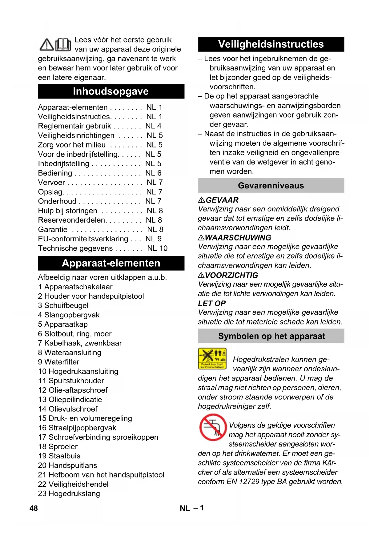 dB(A) 95 93 Carburante e sostanze aggiuntive Quantità olio l 0,4 Tipo di olio: -- 15W40 Dimensioni e pesi Lunghezza mm 700 Larghezza mm 455 Altezza mm 1010 Peso kg 55,4 60,9 Motivo dell’eccezione ai sensi del regolamento (UE) 2019/1781 allegato I sezione 2 (12): j) 47IT– 1 Lees vóór het eerste gebruik van uw apparaat deze originele gebruiksaanwijzing, ga navenant te werk en bewaar hem voor later gebruik of voor een latere eigenaar. Afbeeldig naar voren uitklappen a.u.b. 1 Apparaatschakelaar 2 Houder voor handspuitpistool 3 Schuifbeugel 4 Slangopbergvak 5 Apparaatkap 6 Slotbout, ring, moer 7 Kabelhaak, zwenkbaar 8 Wateraansluiting 9 Waterfilter 10 Hogedrukaansluiting 11 Spuitstukhouder 12 Olie-aftapschroef 13 Oliepeilindicatie 14 Olievulschroef 15 Druk- en volumeregeling 16 Straalpijpopbergvak 17 Schroefverbinding sproeikoppen 18 Sproeier 19 Staalbuis 20 Handspuitlans 21 Hefboom van het handspuitpistool 22 Veiligheidshendel 23 Hogedrukslang – Lees voor het ingebruiknemen de ge- bruiksaanwijzing van uw apparaat en let bijzonder goed op de veiligheids- voorschriften. – De op het apparaat aangebrachte waarschuwings- en aanwijzingsborden geven aanwijzingen voor gebruik zon- der gevaar. – Naast de instructies in de gebruiksaan- wijzing moeten de algemene voorschrif- ten inzake veiligheid en ongevallenpre- ventie van de wetgever in acht geno- men worden. GEVAAR Verwijzing naar een onmiddellijk dreigend gevaar dat tot ernstige en zelfs dodelijke li- chaamsverwondingen leidt. 몇 WAARSCHUWING Verwijzing naar een mogelijke gevaarlijke situatie die tot ernstige en zelfs dodelijke li- chaamsverwondingen kan leiden. 몇 VOORZICHTIG Verwijzing naar een mogelijk gevaarlijke situ- atie die tot lichte verwondingen kan leiden. LET OP Verwijzing naar een mogelijke gevaarlijke situatie die tot materiele schade kan leiden. Hogedrukstralen kunnen ge- vaarlijk zijn wanneer ondeskun- digen het apparaat bedienen. U mag de straal mag niet richten op personen, dieren, onder stroom staande voorwerpen of de hogedrukreiniger zelf. Volgens de geldige voorschriften mag het apparaat nooit zonder sy- steemscheider aangesloten wor- den op het drinkwaternet. Er moet een ge- schikte systeemscheider van de firma Kär- cher of als alternatief een systeemscheider conform EN 12729 type BA gebruikt worden. Inhoudsopgave Apparaat-elementen . . . . . . . . NL 1 Veiligheidsinstructies. . . . . . . . NL 1 Reglementair gebruik . . . . . . . NL 4 Veiligheidsinrichtingen . . . . . . NL 5 Zorg voor het milieu . . . . . . . . NL 5 Voor de inbedrijfstelling. . . . . . NL 5 Inbedrijfstelling . . . . . . . . . . . . NL 5 Bediening . . . . . . . . . . . . . . . . NL 6 Vervoer . . . . . . . . . . . . . . . . . . NL 7 Opslag. . . . . . . . . . . . . . . . . . . NL 7 Onderhoud . . . . . . . . . . . . . . . NL 7 Hulp bij storingen . . . . . . . . . . NL 8 Reserveonderdelen. . . . . . . . . NL 8 Garantie . . . . . . . . . . . . . . . . . NL 8 EU-conformiteitsverklaring . . . NL 9 Technische gegevens . . . . . . . NL 10 Apparaat-elementen Veiligheidsinstructies Gevarenniveaus Symbolen op het apparaat 48 NL– 2 Water dat door een systeemscheider is ge- stroomd, wordt als niet drinkbaar geclassi- ficeerd. Het apparaat bevat hete opper- vlakken die brandwonden kunnen veroorzaken. Gevaar voor elektrische schok. De behuizing mag alleen door ge- kwalificeerde elektriciens worden geopend. – De op het typeplaatje aangegeven spanning moet met de spanning van de stroombron overeenkomen. – Minimumzekering van het stopcontact (zie technische gegevens). – Beschermingsklasse I - Apparaten mogen uitsluitend aangesloten worden aan regle- mentair geaarde stroombronnen. – Er wordt aanbevolen om dit apparaat alleen aan een stopcontact aan te slui- ten dat is beveiligd met een 30 mA ver- liesstroomschakelaar. – De door de fabrikant voorgeschreven stroomleiding moet gebruikt worden, dat geldt ook bij een eventuele vervan- ging van de leiding. Bestelnummer en type zie gebruiksaanwijzing. – Controleer voor ieder gebruik of aan- sluitkabel en netstekker onbeschadigd zijn. Laat beschadigde voedingskabels onmiddellijk vervangen door een be- voegde medewerker van de technische dienst of een elektro-vakman. – Het apparaat mag uitlsuitend aan een elektrische aansluiting aangesloten worden die werd uitgevoerd door een electricien conform IEC 60364-1. – Inschakelprocessen creëren korte spanningdalingen. – Bij ongunstige netomstandigheden kunnen andere apparaten beïnvloed worden. – De stekker nooit met natte handen aan- raken. – Let erop dat netaansluiting en verleng- snoer niet beschadigd raken door er- overheen rijden, knellen, trekken en dergelijke. Bescherm de kabel tegen hitte, olie en scherpe randen. – De verlengingskabel moet de diameter hebben die in het elektrisch schema vermeld is en moet tegen spatwater be- schermd zijn. De verbinding mag niet in het water liggen. – Netstekker en koppeling van een ver- lengkabel moeten waterdicht zijn en mogen niet in water liggen. De koppe- ling mag verder niet op de grond liggen. Er wordt aanbevolen om kabeltrommels te gebruiken die garanderen dat de contactdozen zich minstens 60 mm bo- ven de grond bevinden. – Niet-geschikte elektrische verlengka- bels kunnen gevaarlijk zijn. Gebruik in open lucht enkel daartoe vrijgegeven en overeenkomstig gekenmerkte elek- trische verlengkabels met een voldoen- de grote diameter: – De netaansluitingleiding dient regelma- tig op beschadiging te worden onder- zocht, zoals bv op vorming van scheu- ren of slijtage. Wordt een beschadiging geconstateerd, moet de leiding vóór een verder gebruik worden vervangen. – Als er verbindingen met de netsnoer of de verlengkabel worden vervangen, moet ervoor worden gezorgd dat de spatwaterbescherming en de mechani- sche sterkte behouden blijven. – Het schoonmaken van het apparaat mag niet met een waterslang of hoge- drukstraal gebeuren (gevaar van kort- sluiting of andere schades). – Gebruik het apparaat niet b