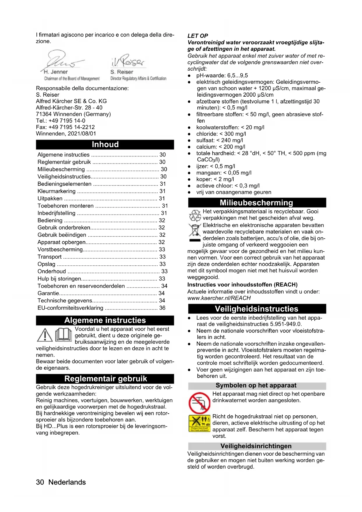 - /l) ● ijzer: < 0,5 mg/l ● mangaan: < 0,05 mg/l ● koper: < 2 mg/l ● actieve chloor: < 0,3 mg/l ● vrij van onaangename geuren Milieubescherming Het verpakkingsmateriaal is recyclebaar. Gooi verpakkingen met het gescheiden afval weg. Elektrische en elektronische apparaten bevatten waardevolle recyclebare materialen en vaak on- derdelen zoals batterijen, accu's of olie, die bij on- juiste omgang of verkeerd weggooien een mogelijk gevaar voor de gezondheid en het milieu kun- nen vormen. Voor een correct gebruik van het apparaat zijn deze onderdelen echter noodzakelijk. Apparaten met dit symbool mogen niet met het huisvuil worden weggegooid. Instructies voor inhoudsstoffen (REACH) Actuele informatie over inhoudsstoffen vindt u onder: www.kaercher.nl/REACH Veiligheidsinstructies ● Lees voor de eerste inbedrijfstelling van het appa- raat de veiligheidsinstructies 5.951-949.0. ● Neem de nationale voorschriften voor vloeistofstra- lers in acht. ● Neem de nationale voorschriften inzake ongevallen- preventie in acht. Vloeistofstralers moeten regelma- tig worden gecontroleerd. Het resultaat van de controle moet schriftelijk worden gedocumenteerd. ● Voer geen wijzigingen aan het apparaat en zijn toe- behoren uit. Symbolen op het apparaat Het apparaat mag niet direct op het openbare drinkwaternet worden aangesloten. Richt de hogedrukstraal niet op personen, dieren, actieve elektrische uitrusting of op het apparaat zelf. Bescherm het apparaat tegen vorst. Veiligheidsinrichtingen Veiligheidsinrichtingen dienen voor de bescherming van de gebruiker en mogen niet buiten werking worden ge- steld of worden overbrugd. Algemene instructies p. 30