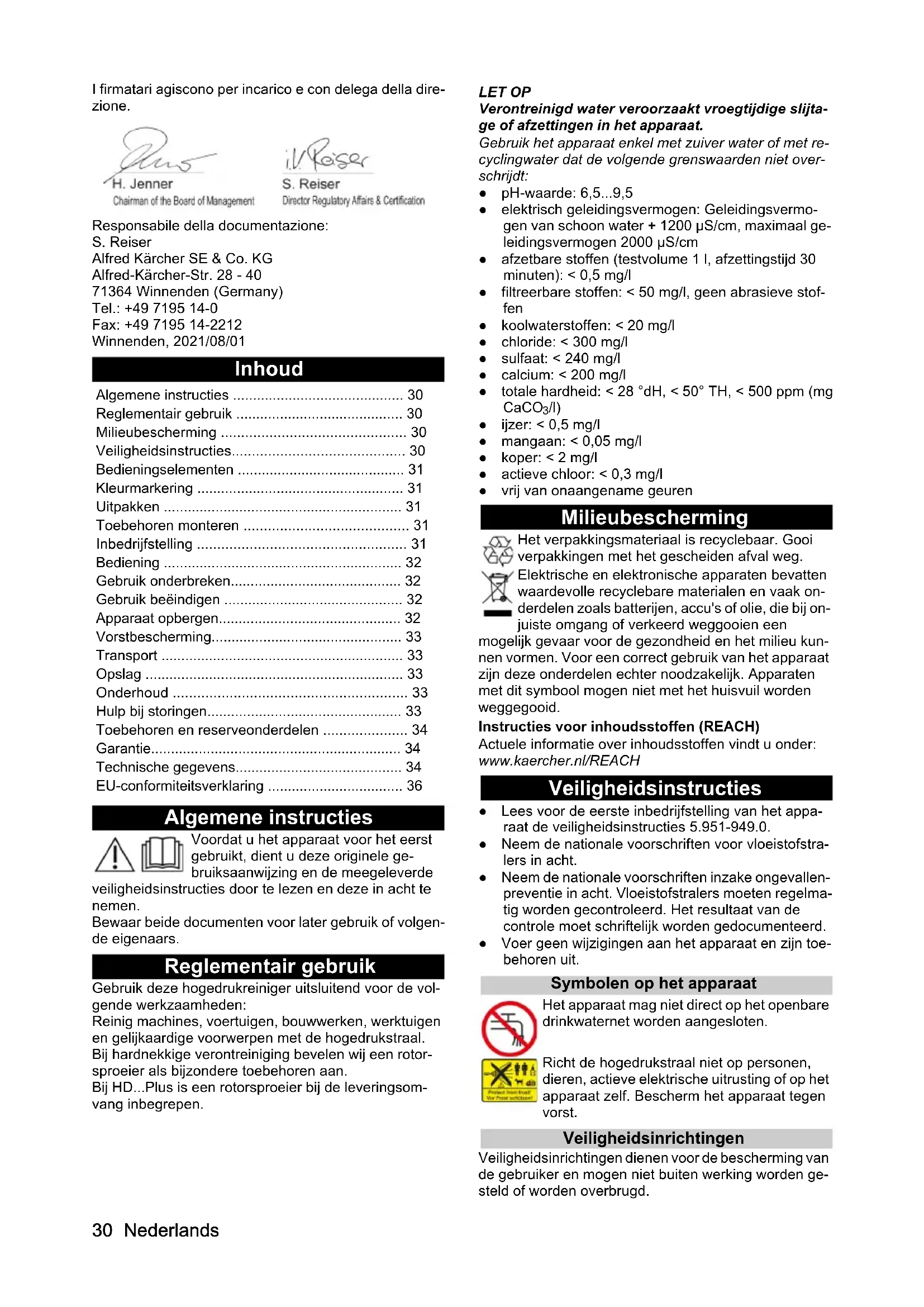 - /l) ● ijzer: < 0,5 mg/l ● mangaan: < 0,05 mg/l ● koper: < 2 mg/l ● actieve chloor: < 0,3 mg/l ● vrij van onaangename geuren Milieubescherming Het verpakkingsmateriaal is recyclebaar. Gooi verpakkingen met het gescheiden afval weg. Elektrische en elektronische apparaten bevatten waardevolle recyclebare materialen en vaak on- derdelen zoals batterijen, accu's of olie, die bij on- juiste omgang of verkeerd weggooien een mogelijk gevaar voor de gezondheid en het milieu kun- nen vormen. Voor een correct gebruik van het apparaat zijn deze onderdelen echter noodzakelijk. Apparaten met dit symbool mogen niet met het huisvuil worden weggegooid. Instructies voor inhoudsstoffen (REACH) Actuele informatie over inhoudsstoffen vindt u onder: www.kaercher.nl/REACH Veiligheidsinstructies ● Lees voor de eerste inbedrijfstelling van het appa- raat de veiligheidsinstructies 5.951-949.0. ● Neem de nationale voorschriften voor vloeistofstra- lers in acht. ● Neem de nationale voorschriften inzake ongevallen- preventie in acht. Vloeistofstralers moeten regelma- tig worden gecontroleerd. Het resultaat van de controle moet schriftelijk worden gedocumenteerd. ● Voer geen wijzigingen aan het apparaat en zijn toe- behoren uit. Symbolen op het apparaat Het apparaat mag niet direct op het openbare drinkwaternet worden aangesloten. Richt de hogedrukstraal niet op personen, dieren, actieve elektrische uitrusting of op het apparaat zelf. Bescherm het apparaat tegen vorst. Veiligheidsinrichtingen Veiligheidsinrichtingen dienen voor de bescherming van de gebruiker en mogen niet buiten werking worden ge- steld of worden overbrugd. Algemene instructies p. 30