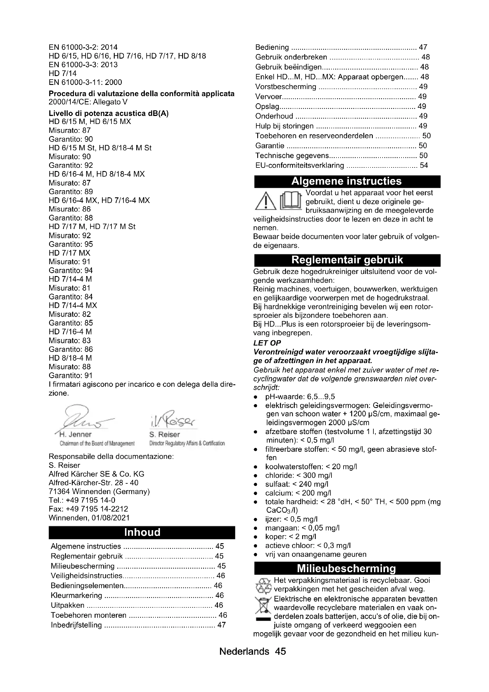 dB(A)939189929295Nederlands 45 EN 61000-3-2: 2014 HD 6/15, HD 6/16, HD 7/16, HD 7/17, HD 8/18 EN 61000-3-3: 2013 HD 7/14 EN 61000-3-11: 2000 Procedura di valutazione della conformità applicata 2000/14/CE: Allegato V Livello di potenza acustica dB(A) HD 6/15 M, HD 6/15 MX Misurato: 87 Garantito: 90 HD 6/15 M St, HD 8/18-4 M St Misurato: 90 Garantito: 92 HD 6/16-4 M, HD 8/18-4 MX Misurato: 87 Garantito: 89 HD 6/16-4 MX, HD 7/16-4 MX Misurato: 86 Garantito: 88 HD 7/17 M, HD 7/17 M St Misurato: 92 Garantito: 95 HD 7/17 MX Misurato: 91 Garantito: 94 HD 7/14-4 M Misurato: 81 Garantito: 84 HD 7/14-4 MX Misurato: 82 Garantito: 85 HD 7/16-4 M Misurato: 83 Garantito: 86 HD 8/18-4 M Misurato: 88 Garantito: 91 I firmatari agiscono per incarico e con delega della dire- zione. Responsabile della documentazione: S. Reiser Alfred Kärcher SE & Co. KG Alfred-Kärcher-Str. 28 - 40 71364 Winnenden (Germany) Tel.: +49 7195 14-0 Fax: +49 7195 14-2212 Winnenden, 01/08/2021 Inhoud Algemene instructies Voordat u het apparaat voor het eerst gebruikt, dient u deze originele ge- bruiksaanwijzing en de meegeleverde veiligheidsinstructies door te lezen en deze in acht te nemen. Bewaar beide documenten voor later gebruik of volgen- de eigenaars. Reglementair gebruik Gebruik deze hogedrukreiniger uitsluitend voor de vol- gende werkzaamheden: Reinig machines, voertuigen, bouwwerken, werktuigen en gelijkaardige voorwerpen met de hogedrukstraal. Bij hardnekkige verontreiniging bevelen wij een rotor- sproeier als bijzondere toebehoren aan. Bij HD...Plus is een rotorsproeier bij de leveringsom- vang inbegrepen. LET OP Verontreinigd water veroorzaakt vroegtijdige slijta- ge of afzettingen in het apparaat. Gebruik het apparaat enkel met zuiver water of met re- cyclingwater dat de volgende grenswaarden niet over- schrijdt: ● pH-waarde: 6,5...9,5 ● elektrisch geleidingsvermogen: Geleidingsvermo- gen van schoon water + 1200 µS/cm, maximaal ge- leidingsvermogen 2000 µS/cm ● afzetbare stoffen (testvolume 1 l, afzettingstijd 30 minuten): < 0,5 mg/l ● filtreerbare stoffen: < 50 mg/l, geen abrasieve stof- fen ● koolwaterstoffen: < 20 mg/l ● chloride: < 300 mg/l ● sulfaat: < 240 mg/l ● calcium: < 200 mg/l ● totale hardheid: < 28 °dH, < 50° TH, < 500 ppm (mg CaCO
