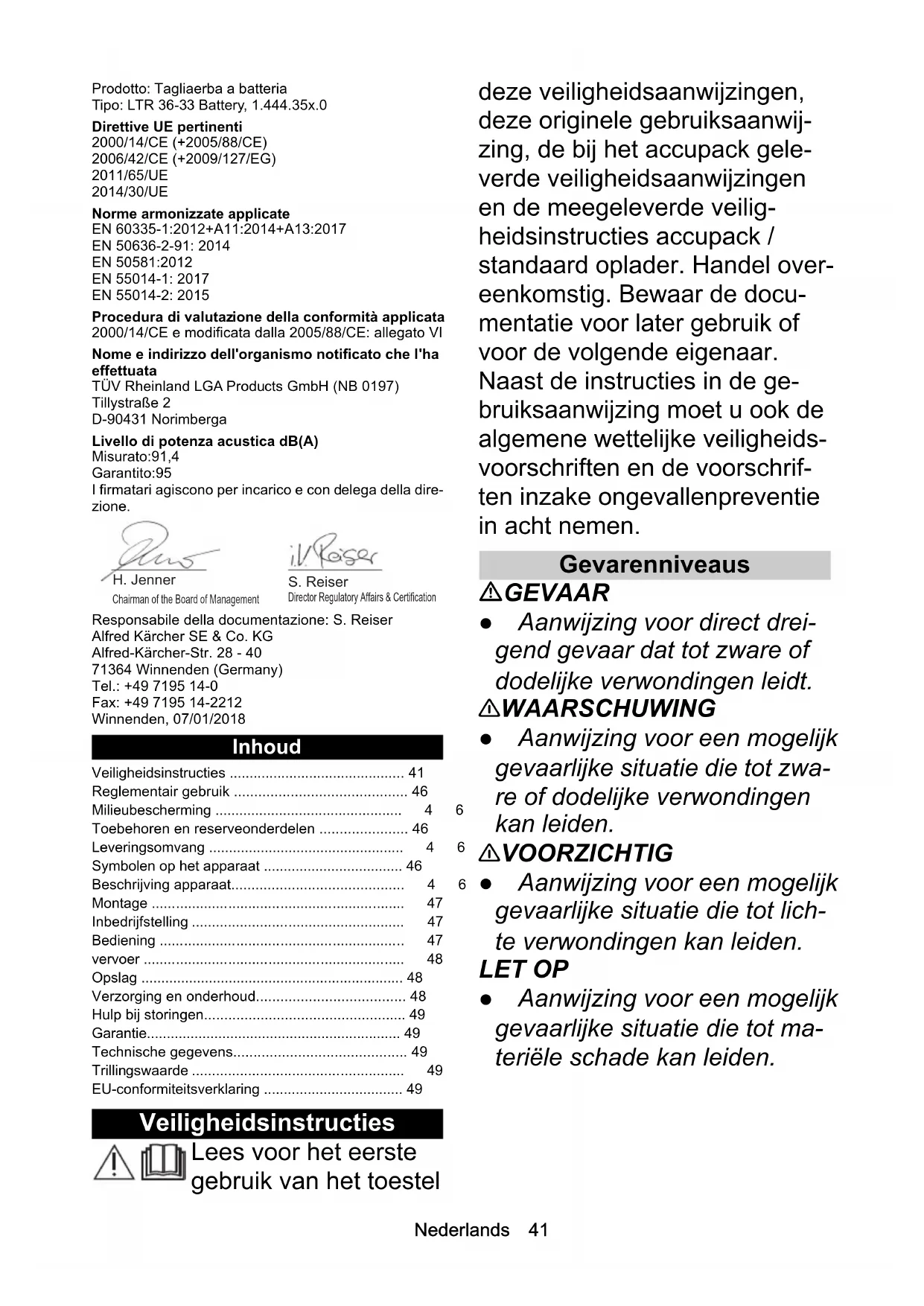 - 3,3 Incertezza K dB(A) 1,5 Dimensioni e pesi Lunghezza x larghezza x altezza mm 1474 x 3 46 x 511 Peso (senza unità accumulatore) kg 2,8Nederlands 41 Prodotto: Tagliaerba a batteria Tipo: LTR 36-33 Battery, 1.444.35x.0 Direttive UE pertinenti 2000/14/CE (+2005/88/CE) 2006/42/CE (+2009/127/EG) 2011/65/UE 2014/30/UE Norme armonizzate applicate EN 60335-1:2012+A11:2014+A13:2017 EN 50636-2-91: 2014 EN 50581:2012 EN 55014-1: 2017 EN 55014-2: 2015 Procedura di valutaz ione della conformità applicata 2000/14/CE e modificata dalla 2005/88/CE: allegato VI Nome e indirizzo dell'organismo notificato che l'ha effettuata TÜV Rheinland LGA Products GmbH (NB 0197) Tillystraße 2 D-90431 Norimberga Livello di potenza acustica dB(A) Misurato:91,4 Garantito:95 I firmatari agiscono per incarico e con delega della dire- zione. Responsabile della documentazione: S. Reiser Alfred Kärcher SE & Co. KG Alfred-Kärcher-Str. 28 - 40 71364 Winnenden (Germany) Tel.: +49 7195 14-0 Fax: +49 7195 14-2212 Winnenden, 07/01/2018 Inhoud Veiligheidsinstructies Lees voor het eerste gebruik van het toestel deze veiligheidsaanwijzingen, deze originele gebruiksaanwij- zing, de bij het accupack gele- verde veiligheidsaanwijzingen en de meegeleverde veilig- heidsinstructies accupack / standaard oplader. Handel over- eenkomstig. Bewaar de docu- mentatie voor later gebruik of voor de volgende eigenaar. Naast de instructies in de ge- bruiksaanwijzing moet u ook de algemene wettelijke veiligheids- voorschriften en de voorschrif- ten inzake ongevallenpreventie in acht nemen. Gevarenniveaus GEVAAR ● Aanwijzing voor direct drei- gend gevaar dat tot zware of dodelijke verwondingen leidt. 몇 WAARSCHUWING ● Aanwijzing voor een mogelijk gevaarlijke situatie die tot zwa- re of dodelijke verwondingen kan leiden. 몇 VOORZICHTIG ● Aanwijzing voor een mogelijk gevaarlijke situatie die tot lich- te verwondingen kan leiden. LET OP ● Aanwijzing voor een mogelijk gevaarlijke situatie die tot ma- teriële schade kan leiden. Veiligheidsinstructies p. 41