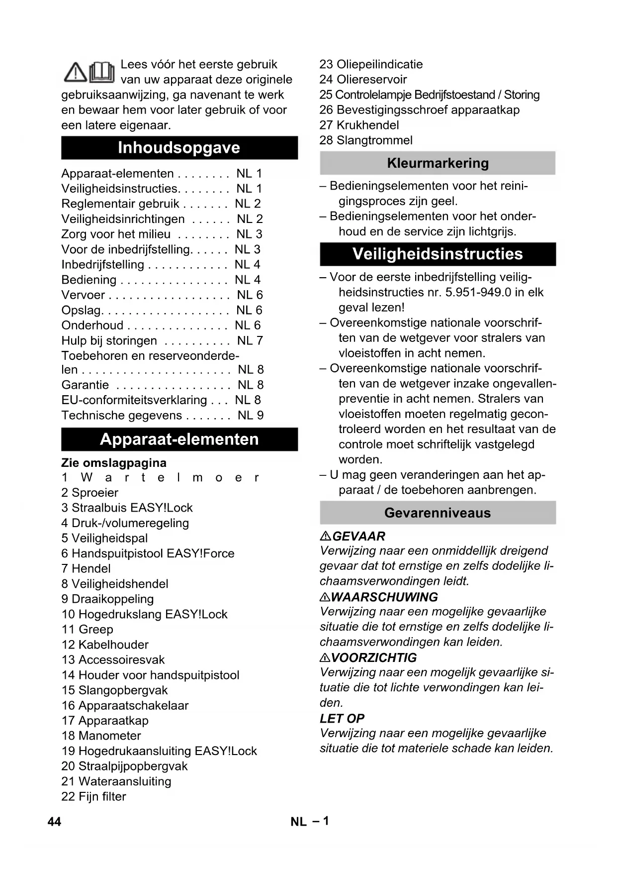dB(A) 96 Carburante e sostanze aggiuntive Quantità olio l 1,2 Tipo di olio: SAE 90 Dimensioni e pesi Lunghezza mm 560 Larghezza mm 500 Altezza mm 1090 Peso d'esercizio tipico (SX) kg 75 (77) Motivo dell’eccezione ai sensi del regolamento (UE) 2019/1781 allegato I sezione 2 (12): j) 43IT– 1 Lees vóór het eerste gebruik van uw apparaat deze originele gebruiksaanwijzing, ga navenant te werk en bewaar hem voor later gebruik of voor een latere eigenaar. Zie omslagpagina 1Wartelmoer 2 Sproeier 3 Straalbuis EASY!Lock 4 Druk-/volumeregeling 5 Veiligheidspal 6 Handspuitpistool EASY!Force 7 Hendel 8 Veiligheidshendel 9 Draaikoppeling 10 Hogedrukslang EASY!Lock 11 Greep 12 Kabelhouder 13 Accessoiresvak 14 Houder voor handspuitpistool 15 Slangopbergvak 16 Apparaatschakelaar 17 Apparaatkap 18 Manometer 19 Hogedrukaansluiting EASY!Lock 20 Straalpijpopbergvak 21 Wateraansluiting 22 Fijn filter 23 Oliepeilindicatie 24 Oliereservoir 25 Controlelampje Bedrijfstoestand / Storing 26 Bevestigingsschroef apparaatkap 27 Krukhendel 28 Slangtrommel – Bedieningselementen voor het reini- gingsproces zijn geel. – Bedieningselementen voor het onder- houd en de service zijn lichtgrijs. – Voor de eerste inbedrijfstelling veilig- heidsinstructies nr. 5.951-949.0 in elk geval lezen! – Overeenkomstige nationale voorschrif- ten van de wetgever voor stralers van vloeistoffen in acht nemen. – Overeenkomstige nationale voorschrif- ten van de wetgever inzake ongevallen- preventie in acht nemen. Stralers van vloeistoffen moeten regelmatig gecon- troleerd worden en het resultaat van de controle moet schriftelijk vastgelegd worden. – U mag geen veranderingen aan het ap- paraat / de toebehoren aanbrengen. GEVAAR Verwijzing naar een onmiddellijk dreigend gevaar dat tot ernstige en zelfs dodelijke li- chaamsverwondingen leidt. 몇 WAARSCHUWING Verwijzing naar een mogelijke gevaarlijke situatie die tot ernstige en zelfs dodelijke li- chaamsverwondingen kan leiden. 몇 VOORZICHTIG Verwijzing naar een mogelijk gevaarlijke si- tuatie die tot lichte verwondingen kan lei- den. LET OP Verwijzing naar een mogelijke gevaarlijke situatie die tot materiele schade kan leiden. Inhoudsopgave Apparaat-elementen . . . . . . . . NL 1 Veiligheidsinstructies. . . . . . . . NL 1 Reglementair gebruik . . . . . . . NL 2 Veiligheidsinrichtingen . . . . . . NL 2 Zorg voor het milieu . . . . . . . . NL 3 Voor de inbedrijfstelling. . . . . . NL 3 Inbedrijfstelling . . . . . . . . . . . . NL 4 Bediening . . . . . . . . . . . . . . . . NL 4 Vervoer . . . . . . . . . . . . . . . . . . NL 6 Opslag. . . . . . . . . . . . . . . . . . . NL 6 Onderhoud . . . . . . . . . . . . . . . NL 6 Hulp bij storingen . . . . . . . . . . NL 7 Toebehoren en reserveonderde- len . . . . . . . . . . . . . . . . . . . . . . NL 8 Garantie . . . . . . . . . . . . . . . . . NL 8 EU-conformiteitsverklaring . . . NL 8 Technische gegevens . . . . . . . NL 9 Apparaat-elementen Kleurmarkering Veiligheidsinstructies Gevarenniveaus 44 NL– 2 Hogedrukstralen kunnen ge- vaarlijk zijn wanneer ondeskun- digen het apparaat bedienen. U mag de straal mag niet richten op personen, dieren, onder stroom staande voorwerpen of de hogedrukreiniger zelf. Conform de geldige voorschriften mag het apparaat nooit zonder sy- steemscheider aan het drinkwater- net gebruikt worden. Er moet een geschikte systeemscheider van de firma KÄRCHER of alternatief een systeem- scheider conform EN 12729 type BA ge- bruikt worden. Water dat door een systeemscheider is ge- stroomd, wordt als niet-drinkbaar be- schouwd. 몇 VOORZICHTIG Sluit de systeemscheider altijd aan de water- toevoer en nooit direct aan het apparaat aan. Deze hogedrukreiniger uitsluitend gebruiken – voor het reinigen met de lagedrukstraal en reinigingsmiddel (bv. reinigen van machines, voertuigen, bouwwerken, werktuigen), – voor reinigen met hogedrukstraal zon- der reinigingsmiddel (bv. reinigen van gevels, terrassen, tuingereedschap). Eisen aan de waterkwaliteit: LET OP Als hogedrukmedium mag uitsluitend schoon water worden gebruikt. Verontreini- gingen geven aanleiding tot vroegtijdige slijtage of afzettingen in het apparaat. Als gerecycleerd water wordt gebruikt, mo- gen de volgende grenswaarden niet over- schreden worden. Beveiligingselementen dienen ter bescher- ming van de gebruiker en mogen niet bui- ten gebruik gesteld worden of in de functie omgaan worden. Bij het verlagen van de waterhoeveelheid met de druk-/volumeregeling gaat de over- stroomklep open en stroomt een deel van het water terug naar de zuigkant van de pomp. Als de bedieningshendel aan het hand- spuitpistool losgelaten wordt, schakelt de drukschakelaar de pomp uit, de hogedruk- straal stopt. Als de bedieningshendel aan- getrokken wordt, schakelt de pomp op- nieuw in. Overstroomklep en drukschakelaar zijn in de fabriek ingesteld en verzegeld. Instelling uitsluitend door de klantendienst. Symbolen op het apparaat Reglementair gebruik pH-waarde 6,5...9,5 elektrische geleidbaarheid
