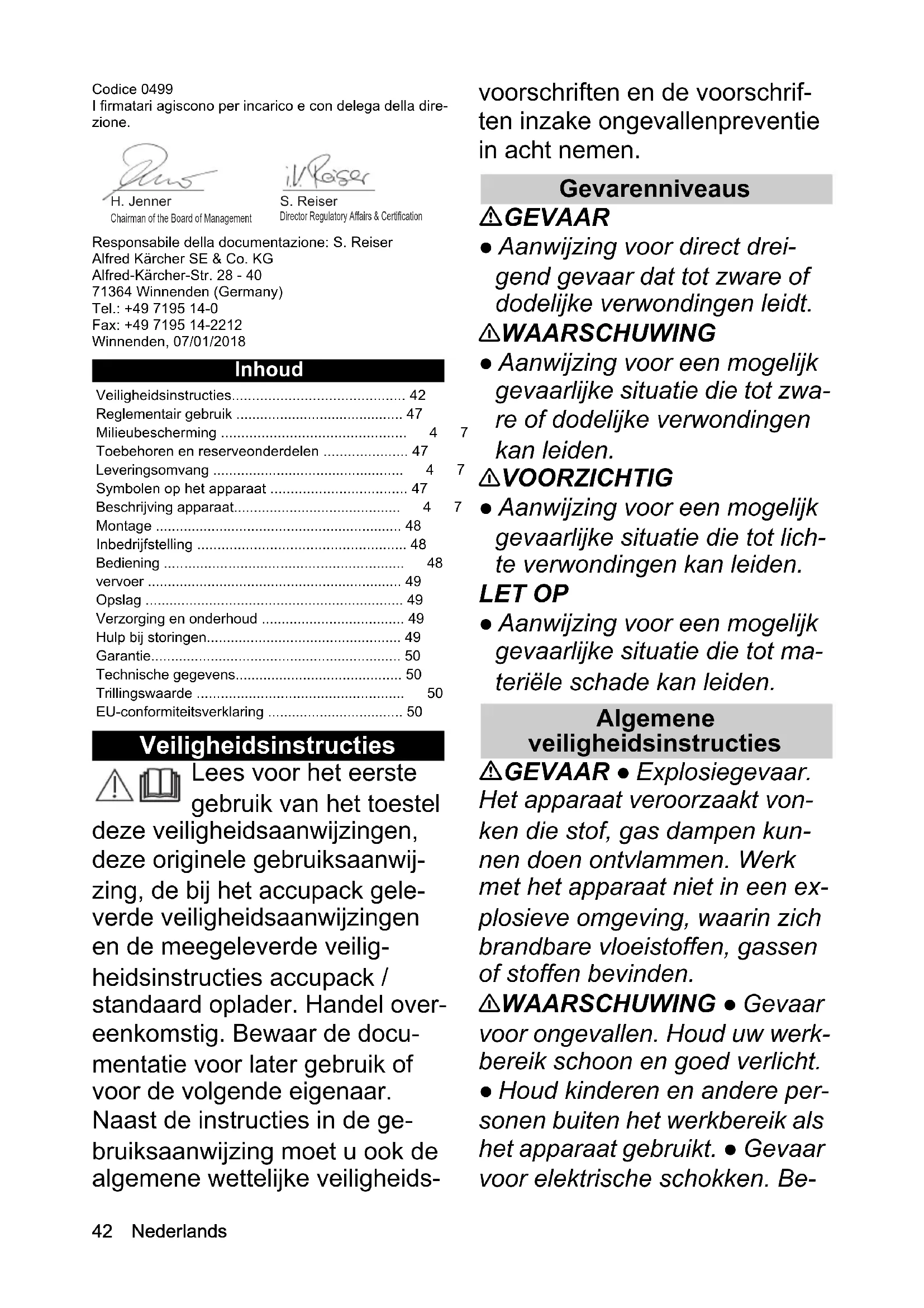 - 1,5 Dimensioni e pesi Lunghezza x larghezza x altezza mm 1329 x 3 12 x 327 Peso (senza unità accumulatore) kg 2,242 Nederlands Codice 0499 I firmatari agiscono per incarico e con delega della dire- zione. Responsabile della documentazione: S. Reiser Alfred Kärcher SE & Co. KG Alfred-Kärcher-Str. 28 - 40 71364 Winnenden (Germany) Tel.: +49 7195 14-0 Fax: +49 7195 14-2212 Winnenden, 07/01/2018 Inhoud Veiligheidsinstructies Lees voor het eerste gebruik van het toestel deze veiligheidsaanwijzingen, deze originele gebruiksaanwij- zing, de bij het accupack gele- verde veiligheidsaanwijzingen en de meegeleverde veilig- heidsinstructies accupack / standaard oplader. Handel over- eenkomstig. Bewaar de docu- mentatie voor later gebruik of voor de volgende eigenaar. Naast de instructies in de ge- bruiksaanwijzing moet u ook de algemene wettelijke veiligheids- voorschriften en de voorschrif- ten inzake ongevallenpreventie in acht nemen. Gevarenniveaus GEVAAR ● Aanwijzing voor direct drei- gend gevaar dat tot zware of dodelijke verwondingen leidt. 몇 WAARSCHUWING ● Aanwijzing voor een mogelijk gevaarlijke situatie die tot zwa- re of dodelijke verwondingen kan leiden. 몇 VOORZICHTIG ● Aanwijzing voor een mogelijk gevaarlijke situatie die tot lich- te verwondingen kan leiden. LET OP ● Aanwijzing voor een mogelijk gevaarlijke situatie die tot ma- teriële schade kan leiden. Algemene veiligheidsinstructies GEVAAR ● Explosiegevaar. Het apparaat veroorzaakt von- ken die stof, gas dampen kun- nen doen ontvlammen. Werk met het apparaat niet in een ex- plosieve omgeving, waarin zich brandbare vloeistoffen, gassen of stoffen bevinden. 몇 WAARSCHUWING ● Gevaar voor ongevallen. Houd uw werk- bereik schoon en goed verlicht. ● Houd kinderen en andere per- sonen buiten het werkbereik als het apparaat gebruikt. ● Gevaar voor elektrische schokken. Be- Veiligheidsinstructies p. 42