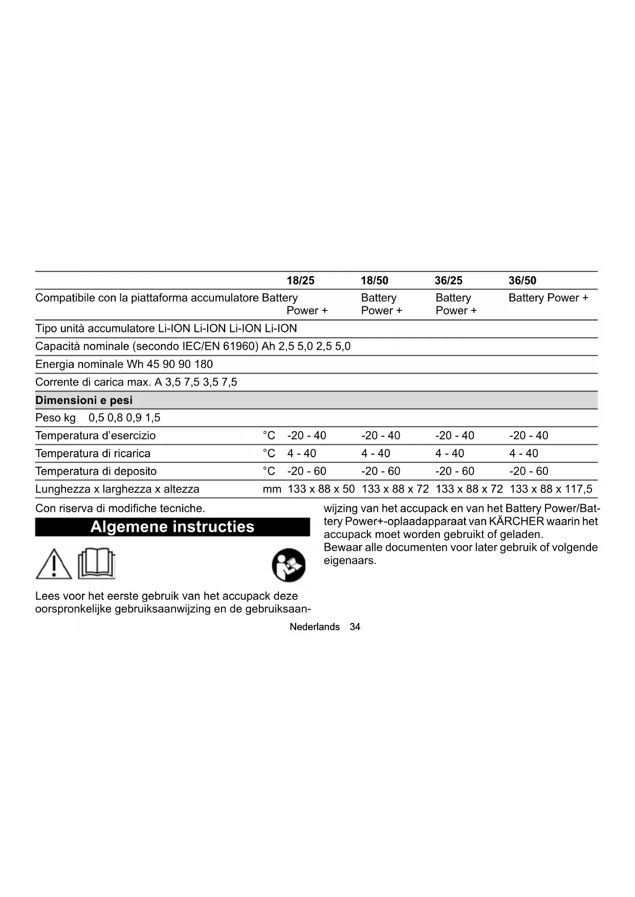 del successivo utilizzo. Dati tecnici 18/25 18/50 36/25 36/50 Collegamento elettrico Tensione nominale unità accumulatore V 18 18 36 36 Piattaforma accumulatore Battery Power Battery Power Battery Power Battery PowerNederlands 34 Con riserva di modifiche tecniche. Algemene instructies Lees voor het eerste gebruik van het accupack deze oorspronkelijke gebruiksaanwijzing en de gebruiksaan- wijzing van het accupack en van het Battery Power/Bat- tery Power+-oplaadapparaat van KÄRCHER waarin het accupack moet worden gebruikt of geladen. Bewaar alle documenten voor later gebruik of volgende eigenaars. Compatibile con la piattaforma accumulatore Battery Power + Battery Power + Battery Power + Battery Power + Tipo unità accumulatore Li-ION Li-ION Li-ION Li-ION Capacità nominale (secondo IEC/EN 61960) Ah 2,5 5,0 2,5 5,0 Energia nominale Wh 45 90 90 180 Corrente di carica max. A 3,5 7,5 3,5 7,5 Dimensioni e pesi Peso kg 0,5 0,8 0,9 1,5 Temperatura d’esercizio °C -20 - 40 -20 - 40 -20 - 40 -20 - 40 Temperatura di ricarica °C 4 - 40 4 - 40 4 - 40 4 - 40 Temperatura di deposito °C -20 - 60 -20 - 60 -20 - 60 -20 - 60 Lunghezza x larghezza x altezza mm 133 x 88 x 50 133 x 88 x 72 133 x 88 x 72 133 x 88 x 117,5 18/25 18/50 36/25 36/5035 Nederlands Gevarenniveaus GEVAAR ● Aanwijzing voor direct dreigend gevaar dat tot zware of dodelijke verwondingen leidt. 몇 WAARSCHUWING ● Aanwijzing voor een mogelijk gevaarlijke situatie die tot zware of dodelijke verwondingen kan leiden. 몇 VOORZICHTIG ● Aanwijzing voor een mogelijk gevaarlijke situatie die tot lichte verwondingen kan leiden. LET OP ● Aanwijzing voor een mogelijk gevaarlijke situatie die tot materiële schade kan leiden. Veiligheidsinstructies ● Controleer het accupack voor elk gebruik op scha- de. Gebruik geen beschadigde accupacks. ● Haal het accupack vóór alle onderhoudswerkzaam- heden uit het apparaat. ● Stel het accupack niet bloot aan mechanische be- lastingen. ● Laat het accupack niet vallen. ● Dompel het accupack niet onder in water en houd het niet onder een waterstraal. ● Gebruik, laad of bewaar het accupack niet in natte of verontreinigde toestand. ● Droog het accupack onmiddellijk, als het nat wordt. Zorg ervoor dat er geen vocht op de contacten ach- terblijft. ● Bewaar of laad het accupack niet op in een vochtige of natte omgeving. ● Laad het accupack alleen met de toegestane op- laadapparaten. ● Laad het accupack niet op in een explosieve omge- ving. Controleer tijdens het opladen regelmatig de toestand van het accupack en de oplader. ● Als u tijdens het opladen een storing, ongebruikelij- ke geur of warmteontwikkeling opmerkt, koppelt u de oplader los van het lichtnet en het accupack van de oplader. Gooi het accupack en lader onmiddellijk weg en volg de geldende voorschriften voor trans- port en afvoer. ● Gebruik, laad of bewaar het accupack niet in een ex- plosieve omgeving of in de buurt van brandbare voorwerpen. ● Gooi het accupack niet in het vuur. ● Bescherm het accupack tegen hitte, scherpe ran- den, olie, oplosmiddelen, reinigingsmiddelen en be- wegende apparaatdelen.Nederlands 36 ● Kortsluitingsgevaar. Bescherm de contacten van het accupack tegen metalen onderdelen en bewaar het niet samen met metalen onderdelen. ● Accupack niet openen. Laat reparaties alleen door vakpersoneel uitvoeren. ● Vermijd contact met vloeistof die uit defecte accu's komt. Spoel de vloeistof bij contact direct met water af en raadpleeg bij contact met de ogen ook een arts. ● Gooi het accupack aan het einde van zijn levens- duur weg in overeenstemming met de geldende voorschriften. Veiligheidsinstructies voor het transport De Lithium-Ion-accu valt onder de vereisten van het recht m.b.t. gevaarlijke goederen. Een onbeschadigd en functioneel accupack kan door de gebruiker zonder bijkomende voorwaarden op de openbare weg worden getransporteerd. Neem bij het verzenden door derden (transportonder- neming) de bijzondere vereisten aan verpakking en markering in acht. Verstuur het accupack alleen bij een onbeschadigde behuizing. Plak openliggende contacten af. Verpak het accupack stevig en veilig. Het accupack mag zich niet in de verpakking kunnen bewegen. GEVAAR ● Een defect of niet-functioneel accupack mag niet wor- den opgestuurd en moet ter plaatse worden afge- voerd in overeenstemming met de geldende voorschriften. Neem de nationale voorschriften in acht. Reglementair gebruik 몇 VOORZICHTIG Explosiegevaar! Letsel en beschadiging door exploderend accupack. Laad, gebruik en bewaar alleen onbeschadigde en vol- ledig functionele accupacks. Het ombouwen en niet door de fabrikant goedgekeurde wijzigingen zijn niet toegestaan. Elk ander gebruik is niet toegestaan. Voor risico's die ontstaan door gebruik dat niet is toegestaan, is de ge- bruiker verantwoordelijk. Laad en gebruik het accupack alleen met apparaten van het KÄRCHER 18 V / 36 V Battery Power / Battery Po- wer+ systeem. LET OP Accupacks kunnen alleen worden gebruikt met appara- ten van hetzelfde spanningstype (18 V of 36 V)! Ge- bruik of laad geen accupacks op met apparaten met een ander spanningstype.37 Nederlands Controleer voor gebruik of het spanningstype (18 V / 36 V) van het accupack en het apparaat overeenko- men. De spanningsinformatie is te vinden op het apparaat, op het accupack en het naamplaatje. Milieubescherming De verpakkingsmaterialen zijn herbruikbaar. Werp de verpakkingen niet bij het huisvuil, maar zorg dat ze gerecycled worden. Oude apparaten bevatten waardevolle, herbruik- bare materialen die gerecycled moeten worden. Batterijen en accupacks bevatten stoffen die niet in het milieu mogen terechtkomen. Voer oude ap- paraten, batterijen en accupacks daarom af via geschik- te inzamelsystemen. Neem de aanbevelingen van de wetgever m.b.t. de om- gang met lithium-ionen-accu's in acht. Voer verbruikte en defecte accupacks af conform de geldende voor- schriften. Instructies betreffende inhoudsstoffen (REACH) Actuele informatie over i