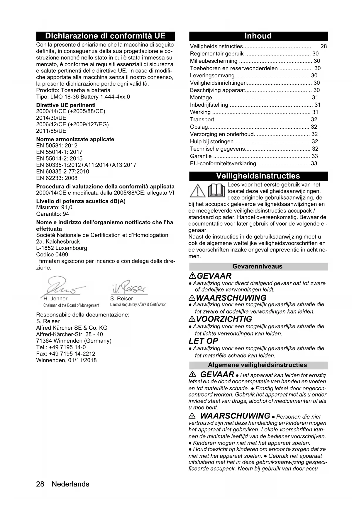 • Peso (senza unità accumulatore) kg 13,428 Nederlands Dichiarazione di conformità UE Con la presente dichiariamo che la macchina di seguito definita, in conseguenza della sua progettazione e co- struzione nonché nello stato in cui è stata immessa sul mercato, è conforme ai requisiti essenziali di sicurezza e salute pertinenti delle direttive UE. In caso di modifi- che apportate alla macchina senza il nostro consenso, la presente dichiarazione perde ogni validità. Prodotto: Tosaerba a batteria Tipo: LMO 18-36 Battery 1.444-4xx.0 Direttive UE pertinenti 2000/14/CE (+2005/88/CE) 2014/30/UE 2006/42/CE (+2009/127/EG) 2011/65/UE Norme armonizzate applicate EN 50581: 2012 EN 55014-1: 2017 EN 55014-2: 2015 EN 60335-1:2012+A11:2014+A13:2017 EN 60335-2-77:2010 EN 62233: 2008 Procedura di valutazione della conformità applicata 2000/14/CE e modificata dalla 2005/88/CE: allegato VI Livello di potenza acustica dB(A) Misurato: 91,0 Garantito: 94 Nome e indirizzo dell'organismo notificato che l'ha effettuata Société Nationale de Certification et d’Homologation 2a. Kalchesbruck L-1852 Luxembourg Codice 0499 I firmatari agiscono per incarico e con delega della dire- zione. Responsabile della documentazione: S. Reiser Alfred Kärcher SE & Co. KG Alfred-Kärcher-Str. 28 - 40 71364 Winnenden (Germany) Tel.: +49 7195 14-0 Fax: +49 7195 14-2212 Winnenden, 01/11/2018 Inhoud Veiligheidsinstructies Lees voor het eerste gebruik van het toestel deze veiligheidsaanwijzingen, deze originele gebruiksaanwijzing, de bij het accupack geleverde veiligheidsaanwijzingen en de meegeleverde veiligheidsinstructies accupack / standaard oplader. Handel overeenkomstig. Bewaar de documentatie voor later gebruik of voor de volgende ei- genaar. Naast de instructies in de gebruiksaanwijzing moet u ook de algemene wettelijke veiligheidsvoorschriften en de voorschriften inzake ongevallenpreventie in acht ne- men. Gevarenniveaus GEVAAR ● Aanwijzing voor direct dreigend gevaar dat tot zware of dodelijke verwondingen leidt. 몇 WAARSCHUWING ● Aanwijzing voor een mogelijk gevaarlijke situatie die tot zware of dodelijke verwondingen kan leiden. 몇 VOORZICHTIG ● Aanwijzing voor een mogelijk gevaarlijke situatie die tot lichte verwondingen kan leiden. LET OP ● Aanwijzing voor een mogelijk gevaarlijke situatie die tot materiële schade kan leiden. Algemene veiligheidsinstructies GEVAAR ● Het apparaat kan leiden tot ernstig letsel en de dood door amputatie van handen en voeten en tot materiële schade. ● Ernstig letsel door ongecon- centreerd werken. Gebruik het apparaat niet als u onder invloed staat van drugs, alcohol of medicamenten of als u moe bent. 몇 WAARSCHUWING ● Personen die niet vertrouwd zijn met deze handleiding en kinderen mogen het apparaat niet gebruiken. Lokale voorschriften kun- nen de minimale leeftijd van de bediener voorschrijven. ● Kinderen mogen niet met het apparaat spelen. ● Houd toezicht op kinderen om ervoor te zorgen dat ze niet met het apparaat spelen. ● Gebruik het apparaat uitsluitend met het in deze gebruiksaanwijzing gespeci- ficeerde accupack. Neem bij gebruik van door accu Chairman of the Board of ManagementDirector Regulatory Affairs & Certification H. Jenner S. Reiser Veiligheidsinstructies p. 28