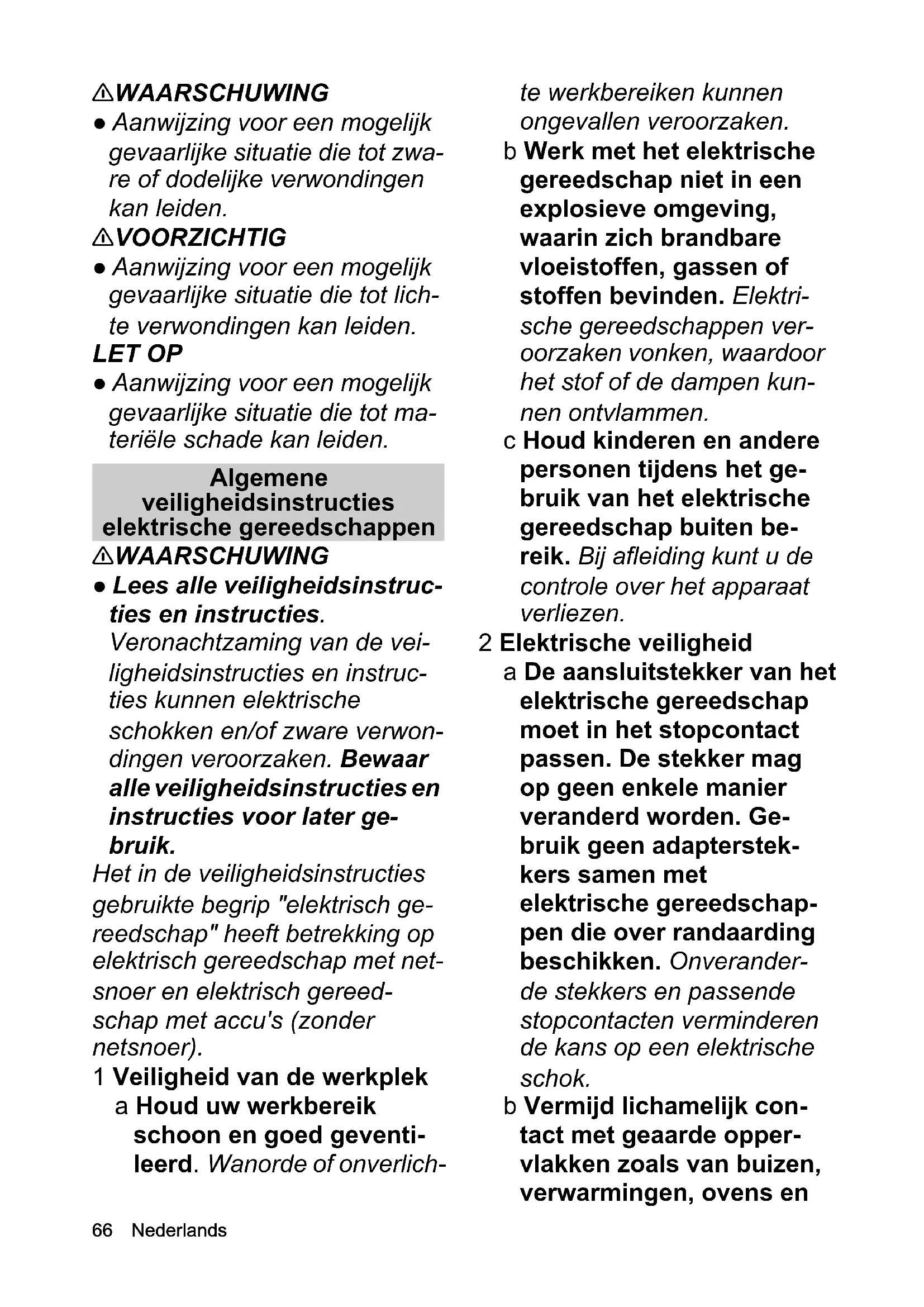 • EU-conformiteitsverklaring Nederlands 몇 WAARSCHUWING ● Aanwijzing voor een mogelijk gevaarlijke situatie die tot zwa- re of dodelijke verwondingen kan leiden. 몇 VOORZICHTIG ● Aanwijzing voor een mogelijk gevaarlijke situatie die tot lich- te verwondingen kan leiden. LET OP ● Aanwijzing voor een mogelijk gevaarlijke situatie die tot ma- teriële schade kan leiden. Algemene veiligheidsinstructies elektrische gereedschappen 몇 WAARSCHUWING ● Lees alle veiligheidsinstruc- ties en instructies. Veronachtzaming van de vei- ligheidsinstructies en instruc- ties kunnen elektrische schokken en/of zware verwon- dingen veroorzaken. Bewaar alle veiligheidsinstructies en instructies voor later ge- bruik. Het in de veiligheidsinstructies gebruikte begrip "elektrisch ge- reedschap" heeft betrekking op elektrisch gereedschap met net- snoer en elektrisch gereed- schap met accu's (zonder netsnoer). 1 Veiligheid van de werkplek a Houd uw werkbereik schoon en goed geventi- leerd. Wanorde of onverlich- te werkbereiken kunnen ongevallen veroorzaken. b Werk met het elektrische gereedschap niet in een explosieve omgeving, waarin zich brandbare vloeistoffen, gassen of stoffen bevinden. Elektri- sche gereedschappen ver- oorzaken vonken, waardoor het stof of de dampen kun- nen ontvlammen. c Houd kinderen en andere personen tijdens het ge- bruik van het elektrische gereedschap buiten be- reik. Bij afleiding kunt u de controle over het apparaat verliezen. 2 Elektrische veiligheid a De aansluitstekker van het elektrische gereedschap moet in het stopcontact passen. De stekker mag op geen enkele manier veranderd worden. Ge- bruik geen adapterstek- kers samen met elektrische gereedschap- pen die over randaarding beschikken. Onverander- de stekkers en passende stopcontacten verminderen de kans op een elektrische schok. b Vermijd lichamelijk con- tact met geaarde opper- vlakken zoals van buizen, verwarmingen, ovens enNederlands 67 koelkasten. Er bestaat ver- hoogde kans op een elektri- sche schok als uw lichaam geaard is. c Houd elektrische gereed- schappen uit de buurt van regen en vocht. Het indrin- gen van water in een elek- trisch gereedschap verhoogt de kans op een elektrische schok. d Gebruik de kabel niet voor andere doeleinden, bijv. om het elektrische gereed- schap te dragen of op te hangen of om de stekker uit het stopcontact te trek- ken. Houd de kabel uit de buurt van hitte, olie, scher- pe randen of bewegende apparaatonderdelen. Be- schadigde of in elkaar ge- wikkelde aansluitkabels verhogen de kans op een elektrische schok. e Als u met een elektrisch gereedschap in de open lucht werkt, gebruik dan alleen verlengsnoeren die ook voor buiten geschikt zijn. Het gebruik van een voor buiten geschikt ver- lengsnoer vermindert de kans op een elektrische schok. f Als het gebruik van het elektrische gereedschap in vochtige omgeving niet te vermijden is, gebruik dan een aardlekschake- laar. Het gebruik van een aardlekschakelaar vermin- dert de kans op een elektri- sche schok. 3 Veiligheid van personen a Wees aandachtig, let op wat u doet en ga verstan- dig te werk met een elek- trisch gereedschap. Gebruik geen elektrisch gereedschap als u moe bent of onder invloed staat van drugs, alcohol of me- dicijnen. Een moment van onachtzaamheid bij het ge- bruik van het elektrische ge- reedschap kan tot ernstig letsel leiden. b Draag een persoonlijke veiligheidsuitrusting en altijd een veiligheidsbril. Het dragen van een per- soonlijke veiligheidsuitrus- ting, zoals stofmasker, slipvaste veiligheidsschoe- nen, veiligheidshelm of ge- hoorbescherming, vermindert afhankelijk van het soort en het gebruik van het elektrische gereedschap de kans op letsels. c Vermijd een onbedoelde inbedrijfstelling. Contro- leer of het elektrisch ge- reedschap uitgeschakeld is, voordat u het op de stroomvoorziening en/of de accu aansluit, optilt of68 Nederlands draagt. Als u bij het dragen van het elektrisch gereed- schap uw vinger op de scha- kelaar hebt of het apparaat in ingeschakelde toestand op de schakelaar aansluit, kan dit tot ongevallen leiden. d Verwijder instelgereed- schappen of schroefsleu- tels, voordat u het elektrische gereedschap inschakelt. Gereedschap- pen of sleutels die zich in een draaiend apparaaton- derdeel bevinden, kunnen tot verwondingen leiden. e Vermijd een abnormale li- chaamshouding. Zorg voor stabiliteit en blijf al- tijd in evenwicht. Daardoor kunt u het elektrische ge- reedschap in onverwachte situaties beter controleren. f Draag geschikte kleding. Draag geen wijde kleding of sieraden. Houd uw haar, kleding en handschoenen uit de buurt van bewegen- de onderdelen. Losse kle- ding, handschoenen, sieraden of lang haar kun- nen vast komen te zitten in bewegende delen. g Als stofafzuig- en opvan- ginrichtingen gemonteerd kunnen worden, contro- leer dan of deze aangeslo- ten zijn en juist gebruikt worden. Gebruik van een stofafzuiging kan gevaren door stof verminderen. 4 Gebruik en behandeling van het elektrische gereed- schap a Vermijd overbelasting van het apparaat. Gebruik voor uw werk het daarvoor be- stemde elektrische ge- reedschap. Met het passende elektrische ge- reedschap werkt u beter en veiliger in het opgegeven vermogensbereik. b Gebruik geen elektrisch gereedschap waarvan de schakelaar defect is. Een elektrisch gereedschap dat niet meer in- of uitgescha- keld kan worden, is gevaar- lijk en moet worden gerepareerd. c Trek de stekker uit het stopcontact en/of verwij- der de accu, voordat u in- stellingen aan het apparaat uitvoert, toebe- horen vervangt of het ap- paraat weglegt. Deze voorzorgsmaatregel verhin- dert het per ongeluk starten van het elektrische gereed- schap. d Bewaar ongebruikte elek- trische gereedschappen buiten het bereik van kin- deren. Laat het apparaat niet gebruiken door perso- nen die hiermee niet ver-Nederlands 69 trouwd zijn of die deze instructies niet gelezen hebben. Elektrische ge- reedschappen zijn gevaarlijk als ze door onervaren perso- nen gebruikt worden. e 
