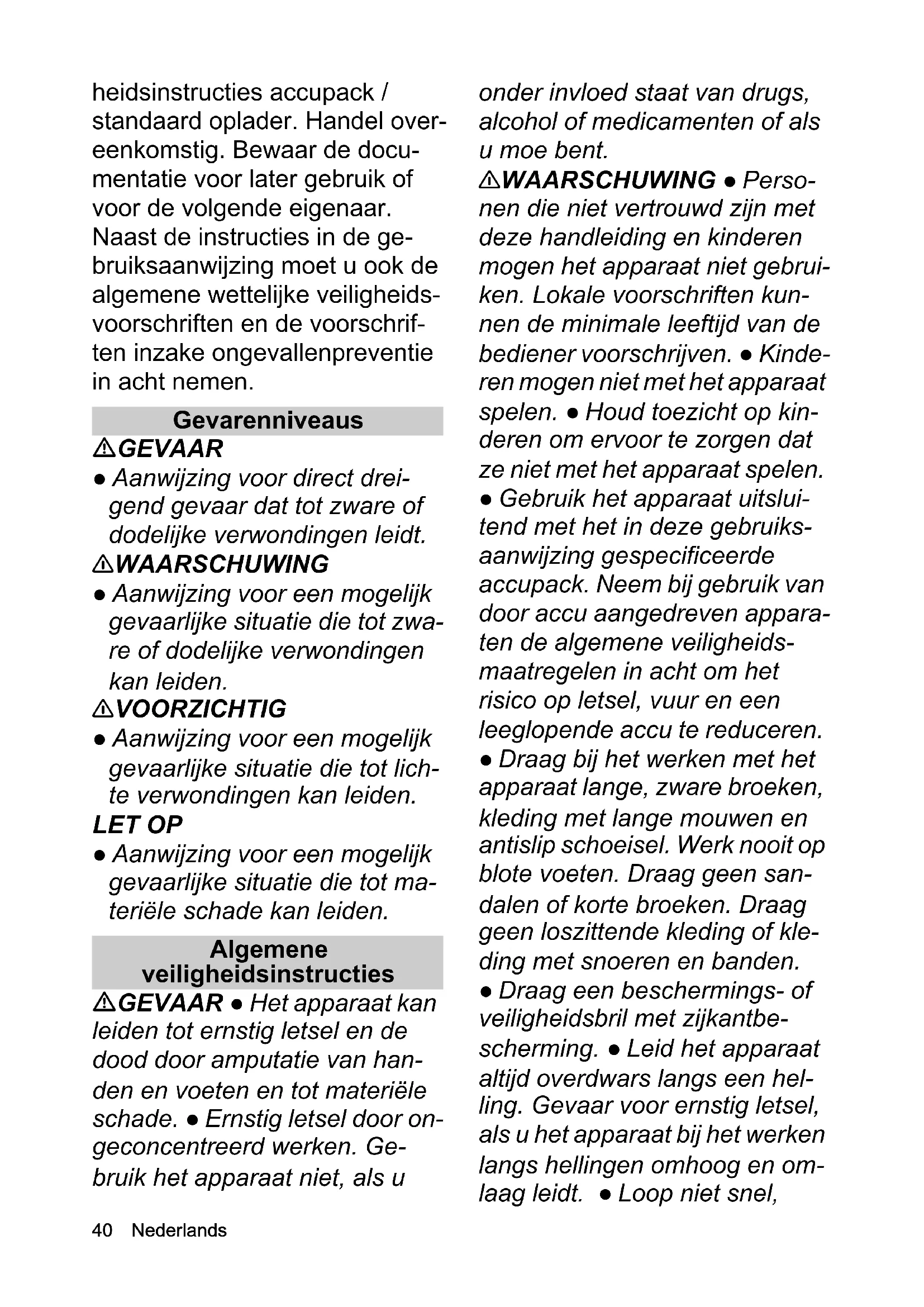 - EU-conformiteitsverklaring Chairman of the Board of ManagementDirector Regulatory Affairs & Certification H. Jenner S. Reiser40 Nederlands heidsinstructies accupack / standaard oplader. Handel over- eenkomstig. Bewaar de docu- mentatie voor later gebruik of voor de volgende eigenaar. Naast de instructies in de ge- bruiksaanwijzing moet u ook de algemene wettelijke veiligheids- voorschriften en de voorschrif- ten inzake ongevallenpreventie in acht nemen. Gevarenniveaus GEVAAR ● Aanwijzing voor direct drei- gend gevaar dat tot zware of dodelijke verwondingen leidt. 몇 WAARSCHUWING ● Aanwijzing voor een mogelijk gevaarlijke situatie die tot zwa- re of dodelijke verwondingen kan leiden. 몇 VOORZICHTIG ● Aanwijzing voor een mogelijk gevaarlijke situatie die tot lich- te verwondingen kan leiden. LET OP ● Aanwijzing voor een mogelijk gevaarlijke situatie die tot ma- teriële schade kan leiden. Algemene veiligheidsinstructies GEVAAR ● Het apparaat kan leiden tot ernstig letsel en de dood door amputatie van han- den en voeten en tot materiële schade. ● Ernstig letsel door on- geconcentreerd werken. Ge- bruik het apparaat niet, als u onder invloed staat van drugs, alcohol of medicamenten of als u moe bent. 몇 WAARSCHUWING ● Perso- nen die niet vertrouwd zijn met deze handleiding en kinderen mogen het apparaat niet gebrui- ken. Lokale voorschriften kun- nen de minimale leeftijd van de bediener voorschrijven. ● Kinde- ren mogen niet met het apparaat spelen. ● Houd toezicht op kin- deren om ervoor te zorgen dat ze niet met het apparaat spelen. ● Gebruik het apparaat uitslui- tend met het in deze gebruiks- aanwijzing gespecificeerde accupack. Neem bij gebruik van door accu aangedreven appara- ten de algemene veiligheids- maatregelen in acht om het risico op letsel, vuur en een leeglopende accu te reduceren. ● Draag bij het werken met het apparaat lange, zware broeken, kleding met lange mouwen en antislip schoeisel. Werk nooit op blote voeten. Draag geen san- dalen of korte broeken. Draag geen loszittende kleding of kle- ding met snoeren en banden. ● Draag een beschermings- of veiligheidsbril met zijkantbe- scherming. ● Leid het apparaat altijd overdwars langs een hel- ling. Gevaar voor ernstig letsel, als u het apparaat bij het werken langs hellingen omhoog en om- laag leidt. ● Loop niet snel,Nederlands 41 maar alleen langzaam bij het werken met het apparaat. Zorg voor een stevige basis en be- houd van uw evenwicht, in het bijzonder bij hellingen. ● Gevaar voor ongevallen door uitglijden. Gebruik het apparaat niet langs hellingen, kuilen, zeer steile hel- lingen of dijken. 몇 VOORZICHTIG ● Maak u vertrouwd met de bedienele- menten en het correcte gebruik van het apparaat. Veiligheid van de werkplek GEVAAR ● Ernstig letsel, als van het snijmes voorwerpen worden geslingerd of draden of snoeren in het snijwerktuig ver- strikt raken. Controleer het werkbereik voor gebruik grondig op voorwerpen zoals stenen, stokken, metaal, draden, botten of speelgoed en verwijder dit. ● Gebruik het apparaat nooit, als personen, in het bijzonder kinderen of dieren, zich binnen een straal van 15 m bevinden, omdat er gevaar bestaat dat voorwerpen door het snijmes worden weggeslingerd. ● Explo- siegevaar. Het apparaat veroor- zaakt vonken die stof, gas dampen kunnen doen ontvlam- men. Werk met het apparaat niet in een explosieve omge- ving, waarin zich brandbare vloeistoffen, gassen of stoffen bevinden. ● Ernstig letsel bij kin- deren. Kinderen kunnen door het apparaat en de bewegingen ervan worden aangetrokken. Let steeds op kinderen, omdat ze zich vrij bewegen. 몇 WAARSCHUWING ● Ge- bruik het apparaat niet in nat gras of in de regen. ● Gebruik het apparaat niet bij bliksemge- vaar. ● Maai altijd bij daglicht of bij goed kunstlicht. ● Houd kin- deren uit de buurt van de maai- omgeving en onder toezicht van een volwassene die niet de be- diener is; pas goed open scha- kel het apparaat uit, als een kind de maaiomgeving betreedt. ● Wees voorzichtig hoe blinde hoeken, struiken, bomen of ob- jecten uw zicht negatief kunnen beïnvloeden. LET OP ● De bediener van het apparaat is voor ongevallen met andere personen of hun eigen- dom verantwoordelijk. Veilig gebruik GEVAAR ● Controleer voor gebruik van het apparaat of messen, mespennen en me- seenheid noch versleten noch beschadigd zijn. ● Vergrendel de in-/uitschakelaar nooit in de AAN-positie; dit is extreem ge- vaarlijk. ● Trek het apparaat al- leen achteruit, als dit absoluut noodzakelijk is. Het apparaat van een wand of een hindernis moet worden weggetrokken, kijk42 Nederlands dan eerst omlaag, om te voorko- men dat u struikelt of met appa- raat over uw voeten rijdt. ● Gevaar in contact met het vrijliggende mes te komen of door weggeslingerde voorwer- pen te worden getroffen. Kantel het apparaat niet, als u de motor start of terwijl de motor loopt. Als kantelen toch noodzakelijk is, bijvoorbeeld om het starten te vereenvoudigen, kunt u de voor- zijde van het apparaat met 5 cm optillen. Druk hiervoor de hand- greep voorzichtig omlaag. U moet het apparaat in de normale bedrijfsstand brengen (d.w.z. Al- le vier wielen op de grond), alvo- rens met het maaien te beginnen. ● Messen die met een stroomvoerende kabel in contact komen, kunnen vrijlig- gende metalen onderdelen van het apparaat onder stroom zet- ten en een elektrische schok veroorzaken. 몇 WAARSCHUWING ● De messen van het apparaat zijn scherp. Draag stevige hand- schoenen en werk voorzichtig, als u monteert, vervangt, reinigt of de bevestiging van schroeven controleert. ● Vervang versleten of beschadigde delen steeds per set, om de balans te garande- ren. ● Zorg ervoor dat het appa- raat in een veilige toestand is door regelmatig te controleren of bouten, moeren en schroeven vast zijn aangedraaid. ● Ver- vang versleten of beschadigde delen, alvorens het apparaat in bedrijf te nemen. ● Gebruik het apparaat nooit, als de in-/uit- schakelaar aan 