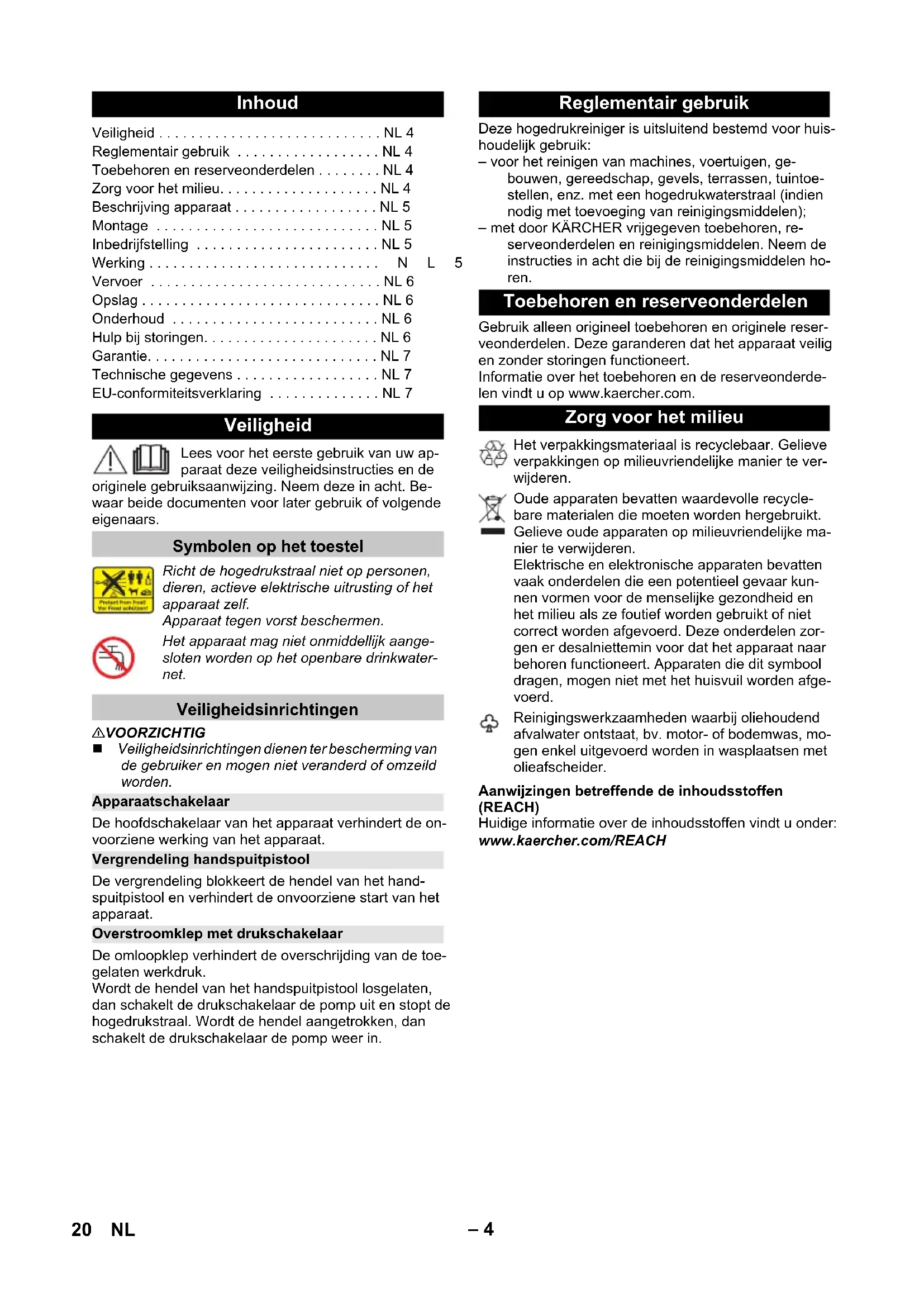 91 dB(A) Dichiarazione di conformità UE Prodotto: Idropulitrice Modello: 1.600-xxx Direttive UE pertinenti 2006/42/CE (+2009/127/CE) 2014/30/UE 2011/65/UE 2000/14/CE Norme armonizzate applicate EN 60335–1 EN 60335–2–79 EN 62233: 2008 EN 55014–1: 2017 EN 55014–2: 2015 EN 61000–3–2: 2014 EN 61000–3–3: 2013 EN 50581 Procedura di valutazione della conformità applicata 2000/14/CE: Allegato V Livello di potenza sonora dB(A) Misurato: 89 Garantito: 91 Winnenden, 2020/08/01 Chairman of the Board of Management Director Regulatory Affairs & Certification 19IT– 4 Lees voor het eerste gebruik van uw ap- paraat deze veiligheidsinstructies en de originele gebruiksaanwijzing. Neem deze in acht. Be- waar beide documenten voor later gebruik of volgende eigenaars. 몇 VOORZICHTIG Veiligheidsinrichtingen dienen ter bescherming van de gebruiker en mogen niet veranderd of omzeild worden. De hoofdschakelaar van het apparaat verhindert de on- voorziene werking van het apparaat. De vergrendeling blokkeert de hendel van het hand- spuitpistool en verhindert de onvoorziene start van het apparaat. De omloopklep verhindert de overschrijding van de toe- gelaten werkdruk. Wordt de hendel van het handspuitpistool losgelaten, dan schakelt de drukschakelaar de pomp uit en stopt de hogedrukstraal. Wordt de hendel aangetrokken, dan schakelt de drukschakelaar de pomp weer in. Deze hogedrukreiniger is uitsluitend bestemd voor huis- houdelijk gebruik: – voor het reinigen van machines, voertuigen, ge- bouwen, gereedschap, gevels, terrassen, tuintoe- stellen, enz. met een hogedrukwaterstraal (indien nodig met toevoeging van reinigingsmiddelen); – met door KÄRCHER vrijgegeven toebehoren, re- serveonderdelen en reinigingsmiddelen. Neem de instructies in acht die bij de reinigingsmiddelen ho- ren. Gebruik alleen origineel toebehoren en originele reser- veonderdelen. Deze garanderen dat het apparaat veilig en zonder storingen functioneert. Informatie over het toebehoren en de reserveonderde- len vindt u op www.kaercher.com. Aanwijzingen betreffende de inhoudsstoffen (REACH) Huidige informatie over de inhoudsstoffen vindt u onder: www.kaercher.com/REACH Inhoud Veiligheid . . . . . . . . . . . . . . . . . . . . . . . . . . . . NL 4 Reglementair gebruik . . . . . . . . . . . . . . . . . . NL 4 Toebehoren en reserveonderdelen . . . . . . . . NL 4 Zorg voor het milieu. . . . . . . . . . . . . . . . . . . . NL 4 Beschrijving apparaat . . . . . . . . . . . . . . . . . . NL 5 Montage . . . . . . . . . . . . . . . . . . . . . . . . . . . . NL 5 Inbedrijfstelling . . . . . . . . . . . . . . . . . . . . . . . NL 5 Werking . . . . . . . . . . . . . . . . . . . . . . . . . . . . .NL5 Vervoer . . . . . . . . . . . . . . . . . . . . . . . . . . . . . NL 6 Opslag . . . . . . . . . . . . . . . . . . . . . . . . . . . . . . NL 6 Onderhoud . . . . . . . . . . . . . . . . . . . . . . . . . . NL 6 Hulp bij storingen. . . . . . . . . . . . . . . . . . . . . . NL 6 Garantie. . . . . . . . . . . . . . . . . . . . . . . . . . . . . NL 7 Technische gegevens . . . . . . . . . . . . . . . . . . NL 7 EU-conformiteitsverklaring . . . . . . . . . . . . . . NL 7 Veiligheid Symbolen op het toestel Richt de hogedrukstraal niet op personen, dieren, actieve elektrische uitrusting of het apparaat zelf. Apparaat tegen vorst beschermen. Het apparaat mag niet onmiddellijk aange- sloten worden op het openbare drinkwater- net. Veiligheidsinrichtingen Apparaatschakelaar Vergrendeling handspuitpistool Overstroomklep met drukschakelaar Reglementair gebruik Toebehoren en reserveonderdelen Zorg voor het milieu Het verpakkingsmateriaal is recyclebaar. Gelieve verpakkingen op milieuvriendelijke manier te ver- wijderen. Oude apparaten bevatten waardevolle recycle- bare materialen die moeten worden hergebruikt. Gelieve oude apparaten op milieuvriendelijke ma- nier te verwijderen. Elektrische en elektronische apparaten bevatten vaak onderdelen die een potentieel gevaar kun- nen vormen voor de menselijke gezondheid en het milieu als ze foutief worden gebruikt of niet correct worden afgevoerd. Deze onderdelen zor- gen er desalniettemin voor dat het apparaat naar behoren functioneert. Apparaten die dit symbool dragen, mogen niet met het huisvuil worden afge- voerd. Reinigingswerkzaamheden waarbij oliehoudend afvalwater ontstaat, bv. motor- of bodemwas, mo- gen enkel uitgevoerd worden in wasplaatsen met olieafscheider. 20 NL– 5 Het leveringspakket van het apparaat staat op de ver- pakking afgebeeld. Controleer bij het uitpakken of de in- houd volledig is. Mochten er eventueel accessoires ontbreken of mocht u transportschade constateren, neem dan contact op met uw leverancier. Afbeeldingen zie pagina 2 1 Wateraansluiting met ingebouwde zeef 2 Koppelinggedeelte voor wateraansluiting 3 Hogedrukaansluiting 4 Accessoiresvak 5 Handgreep 6 Stroomleiding met stekker 7 Kabelclip 8 Bewaarplaats voor stroomkabel 9 Hoofdschakelaar „0/OFF“ / „I/ON“ 10 Handpistool 11 Vergrendeling handspuitpistool 12 Klemmen voor hogedrukslang 13 Veiligheidshuls 14 Straalpijpverlenging 15 Spuitlans met drukregeling (Vario Power) De werkdruk kan traploos van „SOFT“ tot „HARD“ worden verhoogd. Om de werkdruk te wijzigen, hendel van het hogedrukpistool loslaten en straal- buis in de gewenste stand draaien. 16 Hogedrukslang Losse onderdelen die bij het apparaat geleverd werden, moeten voor de inbedrijfstelling gemonteerd worden. Afbeeldingen: zie pagina 3 Afbeelding De meegeleverde koppeling aan het wateraansluit- punt van het apparaat schroeven. Afbeelding Klem voor hogedrukslang uit het handspuitpistool trekken. Afbeelding Hogedrukslang in handspuitpistool steken. Klem indrukken tot hij vastklikt. Veilige verbinding controleren door aan de hogedrukslang te trekken. Zet het apparaat op een effen oppervlak. Afbeelding Hogedrukslang met de hogedrukaansluiting van het apparaat verbinden. Veilige verbinding controleren door aan de hoge- drukslang te trekken. Netstekker in het sto