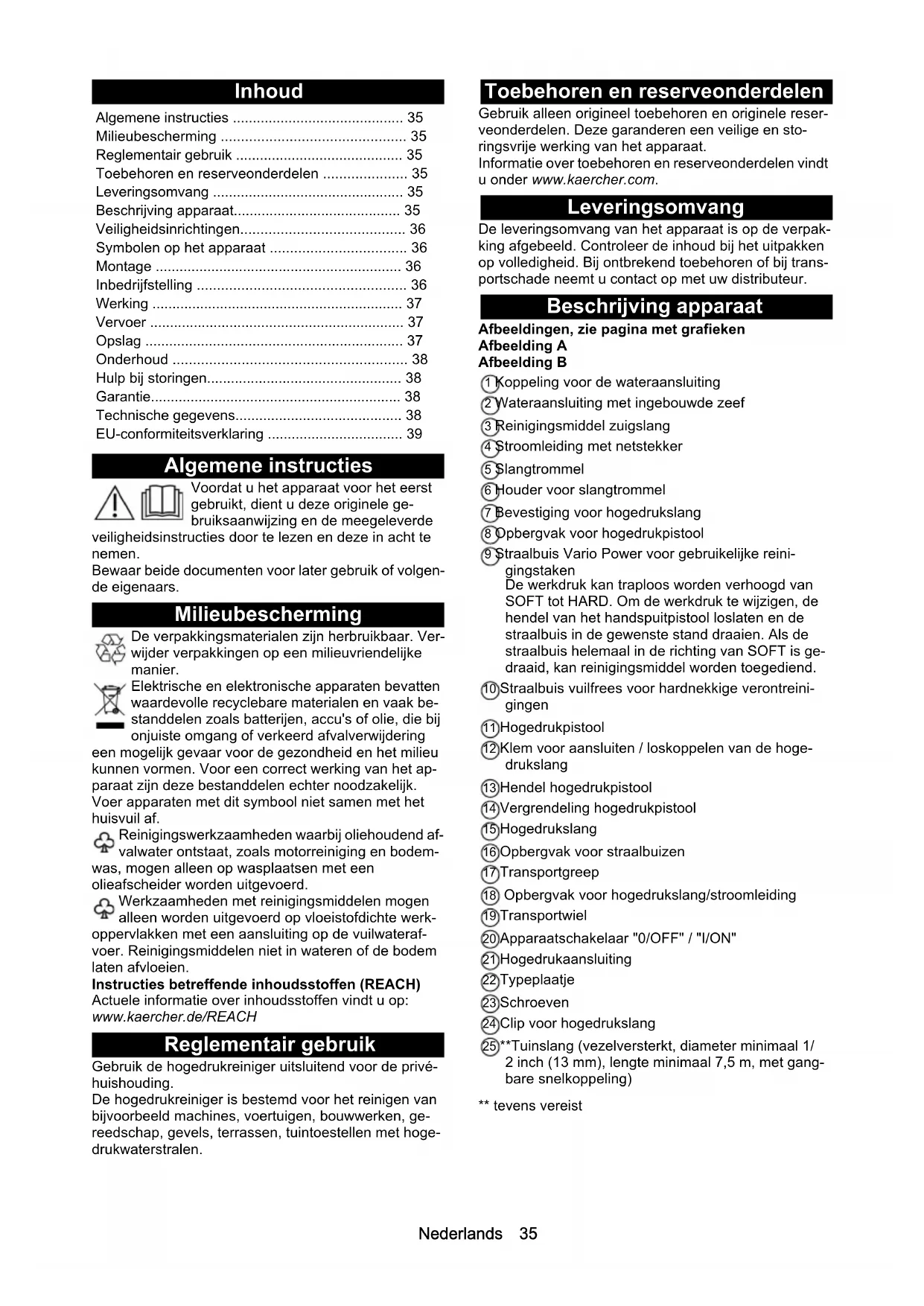 - dB(A) 90 90 K 3 Premium K 3Nederlands 35 Inhoud Algemene instructies Voordat u het apparaat voor het eerst gebruikt, dient u deze originele ge- bruiksaanwijzing en de meegeleverde veiligheidsinstructies door te lezen en deze in acht te nemen. Bewaar beide documenten voor later gebruik of volgen- de eigenaars. Milieubescherming De verpakkingsmaterialen zijn herbruikbaar. Ver- wijder verpakkingen op een milieuvriendelijke manier. Elektrische en elektronische apparaten bevatten waardevolle recyclebare materialen en vaak be- standdelen zoals batterijen, accu's of olie, die bij onjuiste omgang of verkeerd afvalverwijdering een mogelijk gevaar voor de gezondheid en het milieu kunnen vormen. Voor een correct werking van het ap- paraat zijn deze bestanddelen echter noodzakelijk. Voer apparaten met dit symbool niet samen met het huisvuil af. Reinigingswerkzaamheden waarbij oliehoudend af- valwater ontstaat, zoals motorreiniging en bodem- was, mogen alleen op wasplaatsen met een olieafscheider worden uitgevoerd. Werkzaamheden met reinigingsmiddelen mogen alleen worden uitgevoerd op vloeistofdichte werk- oppervlakken met een aansluiting op de vuilwateraf- voer. Reinigingsmiddelen niet in wateren of de bodem laten afvloeien. Instructies betreffende inhoudsstoffen (REACH) Actuele informatie over inhoudsstoffen vindt u op: www.kaercher.de/REACH Reglementair gebruik Gebruik de hogedrukreiniger uitsluitend voor de privé- huishouding. De hogedrukreiniger is bestemd voor het reinigen van bijvoorbeeld machines, voertuigen, bouwwerken, ge- reedschap, gevels, terrassen, tuintoestellen met hoge- drukwaterstralen. Toebehoren en reserveonderdelen Gebruik alleen origineel toebehoren en originele reser- veonderdelen. Deze garanderen een veilige en sto- ringsvrije werking van het apparaat. Informatie over toebehoren en reserveonderdelen vindt u onder www.kaercher.com. Leveringsomvang De leveringsomvang van het apparaat is op de verpak- king afgebeeld. Controleer de inhoud bij het uitpakken op volledigheid. Bij ontbrekend toebehoren of bij trans- portschade neemt u contact op met uw distributeur. Beschrijving apparaat Afbeeldingen, zie pagina met grafieken Afbeelding A Afbeelding B 1 Koppeling voor de wateraansluiting 2 Wateraansluiting met ingebouwde zeef 3 Reinigingsmiddel zuigslang 4 Stroomleiding met netstekker 5 Slangtrommel 6 Houder voor slangtrommel 7 Bevestiging voor hogedrukslang 8 Opbergvak voor hogedrukpistool 9 Straalbuis Vario Power voor gebruikelijke reini- gingstaken De werkdruk kan traploos worden verhoogd van SOFT tot HARD. Om de werkdruk te wijzigen, de hendel van het handspuitpistool loslaten en de straalbuis in de gewenste stand draaien. Als de straalbuis helemaal in de richting van SOFT is ge- draaid, kan reinigingsmiddel worden toegediend. 10 Straalbuis vuilfrees voor hardnekkige verontreini- gingen 11 Hogedrukpistool 12 Klem voor aansluiten / loskoppelen van de hoge- drukslang 13 Hendel hogedrukpistool 14 Vergrendeling hogedrukpistool 15 Hogedrukslang 16 Opbergvak voor straalbuizen 17 Transportgreep 18 Opbergvak voor hogedrukslang/stroomleiding 19 Transportwiel 20 Apparaatschakelaar "0/OFF" / "I/ON" 21 Hogedrukaansluiting 22 Typeplaatje 23 Schroeven 24 Clip voor hogedrukslang 25 **Tuinslang (vezelversterkt, diameter minimaal 1/ 2 inch (13 mm), lengte minimaal 7,5 m, met gang- bare snelkoppeling) ** tevens vereist Algemene instructies p. 35