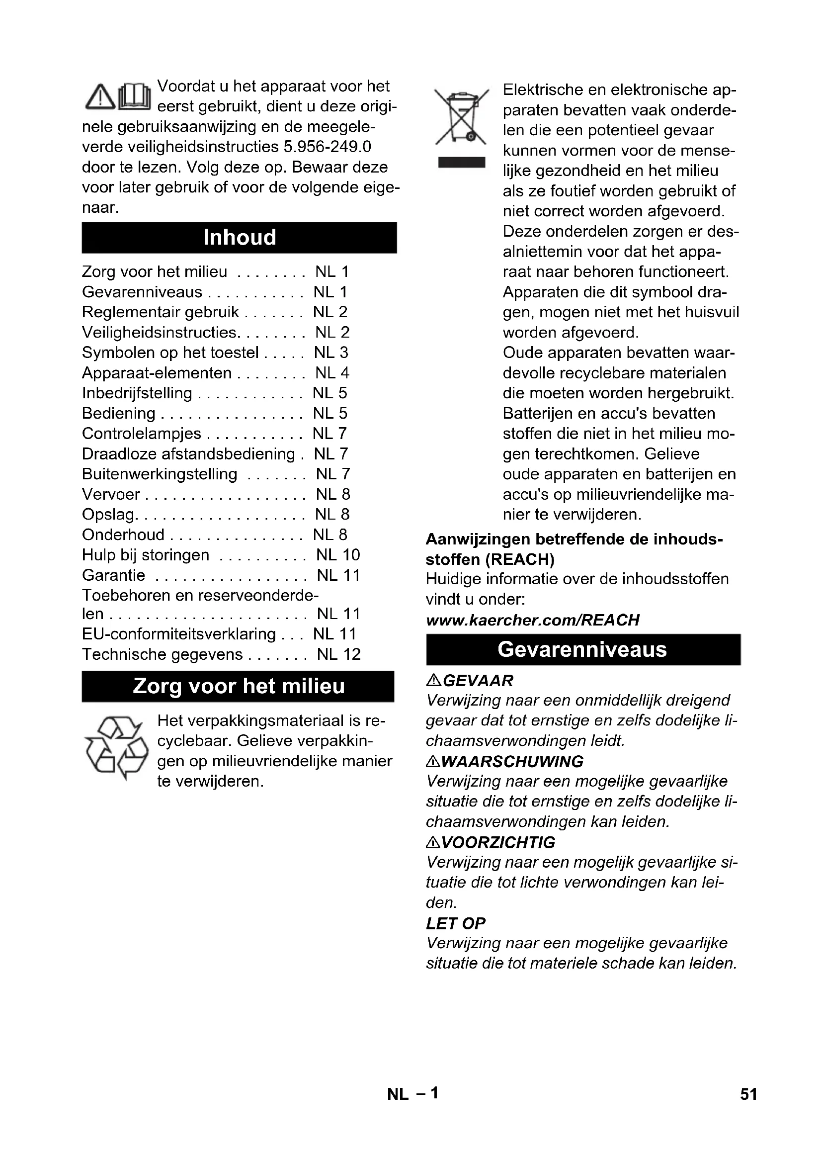 50 IT– 1 Voordat u het apparaat voor het eerst gebruikt, dient u deze origi- nele gebruiksaanwijzing en de meegele- verde veiligheidsinstructies 5.956-249.0 door te lezen. Volg deze op. Bewaar deze voor later gebruik of voor de volgende eige- naar. Aanwijzingen betreffende de inhouds- stoffen (REACH) Huidige informatie over de inhoudsstoffen vindt u onder: www.kaercher.com/REACH GEVAAR Verwijzing naar een onmiddellijk dreigend gevaar dat tot ernstige en zelfs dodelijke li- chaamsverwondingen leidt. 몇 WAARSCHUWING Verwijzing naar een mogelijke gevaarlijke situatie die tot ernstige en zelfs dodelijke li- chaamsverwondingen kan leiden. 몇 VOORZICHTIG Verwijzing naar een mogelijk gevaarlijke si- tuatie die tot lichte verwondingen kan lei- den. LET OP Verwijzing naar een mogelijke gevaarlijke situatie die tot materiele schade kan leiden. Inhoud Zorg voor het milieu . . . . . . . . NL 1 Gevarenniveaus . . . . . . . . . . . NL 1 Reglementair gebruik . . . . . . . NL 2 Veiligheidsinstructies. . . . . . . . NL 2 Symbolen op het toestel . . . . . NL 3 Apparaat-elementen . . . . . . . . NL 4 Inbedrijfstelling . . . . . . . . . . . . NL 5 Bediening . . . . . . . . . . . . . . . . NL 5 Controlelampjes . . . . . . . . . . . NL 7 Draadloze afstandsbediening . NL 7 Buitenwerkingstelling . . . . . . . NL 7 Vervoer . . . . . . . . . . . . . . . . . . NL 8 Opslag. . . . . . . . . . . . . . . . . . . NL 8 Onderhoud . . . . . . . . . . . . . . . NL 8 Hulp bij storingen . . . . . . . . . . NL 10 Garantie . . . . . . . . . . . . . . . . . NL 11 Toebehoren en reserveonderde- len . . . . . . . . . . . . . . . . . . . . . . NL 11 EU-conformiteitsverklaring . . . NL 11 Technische gegevens . . . . . . . NL 12 Zorg voor het milieu Het verpakkingsmateriaal is re- cyclebaar. Gelieve verpakkin- gen op milieuvriendelijke manier te verwijderen. Elektrische en elektronische ap- paraten bevatten vaak onderde- len die een potentieel gevaar kunnen vormen voor de mense- lijke gezondheid en het milieu als ze foutief worden gebruikt of niet correct worden afgevoerd. Deze onderdelen zorgen er des- alniettemin voor dat het appa- raat naar behoren functioneert. Apparaten die dit symbool dra- gen, mogen niet met het huisvuil worden afgevoerd. Oude apparaten bevatten waar- devolle recyclebare materialen die moeten worden hergebruikt. Batterijen en accu's bevatten stoffen die niet in het milieu mo- gen terechtkomen. Gelieve oude apparaten en batterijen en accu's op milieuvriendelijke ma- nier te verwijderen. Gevarenniveaus 51NL– 2 – Deze zuiger is voor de natte en droge reiniging van bodem- en wandopper- vlakken geschikt. – Dit apparaat is geschikt voor het afzui- gen van droge, niet brandbare soorten stof uit machines. – Het apparaat is geschikt voor het opzui- gen van vochtige of vloeibare substan- ties. – Het apparaat is geschikt voor het opzui- gen van droge, niet brandbare, voor de gezondheid schadelijke stoffen; stof- klasse M conform EN 60 335–2–69. Beperking: Er mogen geen kankerver- wekkende stoffen opgezogen worden. – Dit apparaat is alleen geschikt voor in- dustrieel gebruik. – In de standaardaflevering zit geen toe- behoren. Het toebehoren moet naarge- lang aanwending apart besteld worden. – De perfecte werking van het apparaat wordt alleen door de nominale zuig- slangwijdtes DN42, DN52 en DN72 ge- garandeerd. De IV 100/40 M mag alleen met toebe- horen DN 42 en DN 52 worden ge- bruikt. – Ieder ander gebruik is onjuist. Lees vóór de eerste inbedrijfstelling in elk geval de bijgevoegde veiligheidsinstructies voor stofzuigers voor natte/droge bestand- delen! GEVAAR – Indien de retourlucht in de ruimte terug- geblazen wordt, moet een voldoende ventilatiegraad L in de ruimte voorhan- den zijn. Om de vereiste grenswaarden na te leven, mag de teruggevoerde vo- lumestroom maximaal 50 % van de vo- lumestroom verse lucht (ruimtevolume