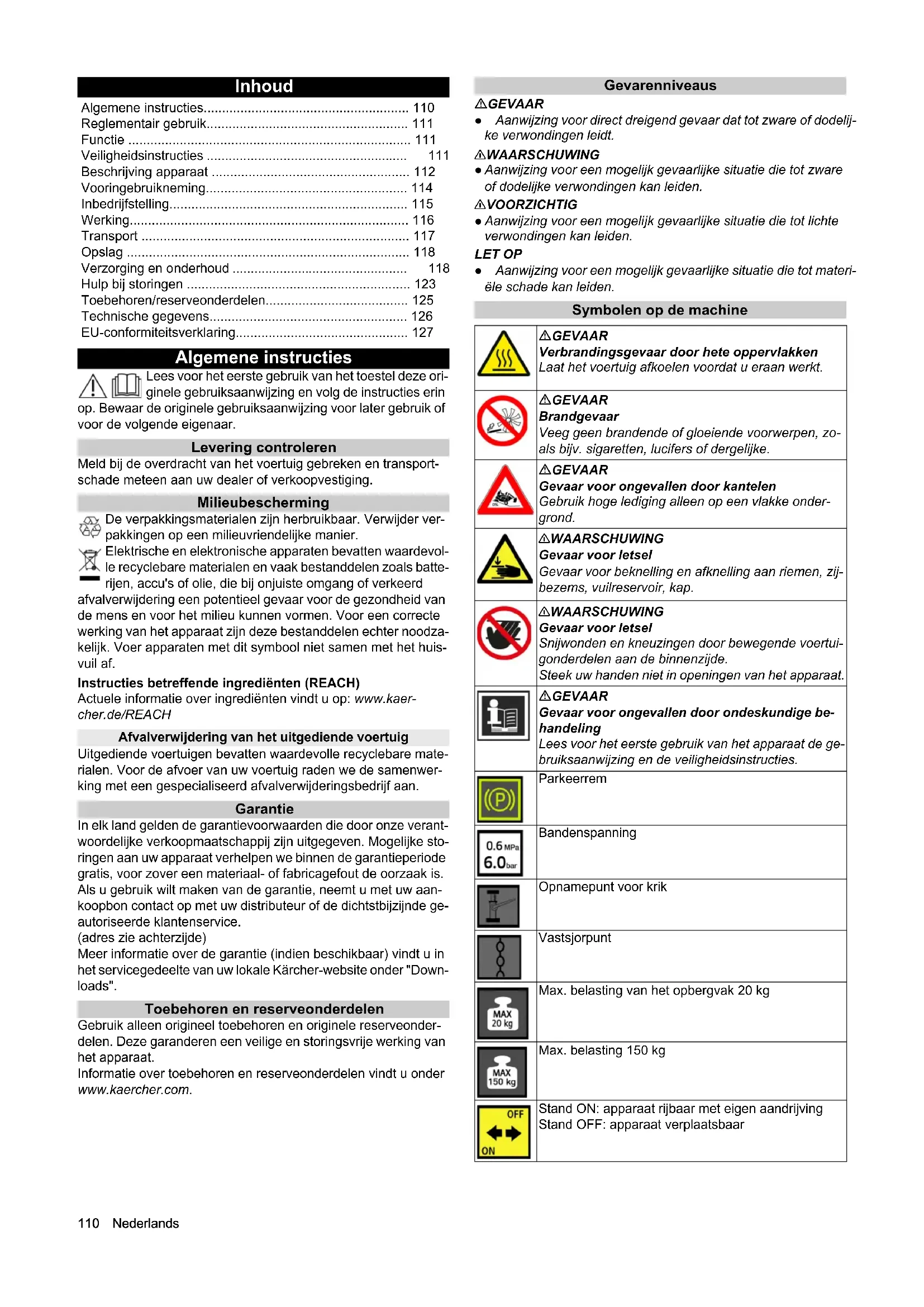 - dB(A) 95 95 KM 100/120 R G KM 100/120 R G 2SB110 Nederlands Inhoud Algemene instructies Lees voor het eerste gebruik van het toestel deze ori- ginele gebruiksaanwijzing en volg de instructies erin op. Bewaar de originele gebruiksaanwijzing voor later gebruik of voor de volgende eigenaar. Levering controleren Meld bij de overdracht van het voertuig gebreken en transport- schade meteen aan uw dealer of verkoopvestiging. Milieubescherming De verpakkingsmaterialen zijn herbruikbaar. Verwijder ver- pakkingen op een milieuvriendelijke manier. Elektrische en elektronische apparaten bevatten waardevol- le recyclebare materialen en vaak bestanddelen zoals batte- rijen, accu's of olie, die bij onjuiste omgang of verkeerd afvalverwijdering een potentieel gevaar voor de gezondheid van de mens en voor het milieu kunnen vormen. Voor een correcte werking van het apparaat zijn deze bestanddelen echter noodza- kelijk. Voer apparaten met dit symbool niet samen met het huis- vuil af. Instructies betreffende ingrediënten (REACH) Actuele informatie over ingrediënten vindt u op: www.kaer- cher.de/REACH Afvalverwijdering van het uitgediende voertuig Uitgediende voertuigen bevatten waardevolle recyclebare mate- rialen. Voor de afvoer van uw voertuig raden we de samenwer- king met een gespecialiseerd afvalverwijderingsbedrijf aan. Garantie In elk land gelden de garantievoorwaarden die door onze verant- woordelijke verkoopmaatschappij zijn uitgegeven. Mogelijke sto- ringen aan uw apparaat verhelpen we binnen de garantieperiode gratis, voor zover een materiaal- of fabricagefout de oorzaak is. Als u gebruik wilt maken van de garantie, neemt u met uw aan- koopbon contact op met uw distributeur of de dichtstbijzijnde ge- autoriseerde klantenservice. (adres zie achterzijde) Meer informatie over de garantie (indien beschikbaar) vindt u in het servicegedeelte van uw lokale Kärcher-website onder "Down- loads". Toebehoren en reserveonderdelen Gebruik alleen origineel toebehoren en originele reserveonder- delen. Deze garanderen een veilige en storingsvrije werking van het apparaat. Informatie over toebehoren en reserveonderdelen vindt u onder www.kaercher.com. Gevarenniveaus GEVAAR ● Aanwijzing voor direct dreigend gevaar dat tot zware of dodelij- ke verwondingen leidt. 몇 WAARSCHUWING ● Aanwijzing voor een mogelijk gevaarlijke situatie die tot zware of dodelijke verwondingen kan leiden. 몇 VOORZICHTIG ● Aanwijzing voor een mogelijk gevaarlijke situatie die tot lichte verwondingen kan leiden. LET OP ● Aanwijzing voor een mogelijk gevaarlijke situatie die tot materi- ële schade kan leiden. Symbolen op de machine Algemene instructies p. 110