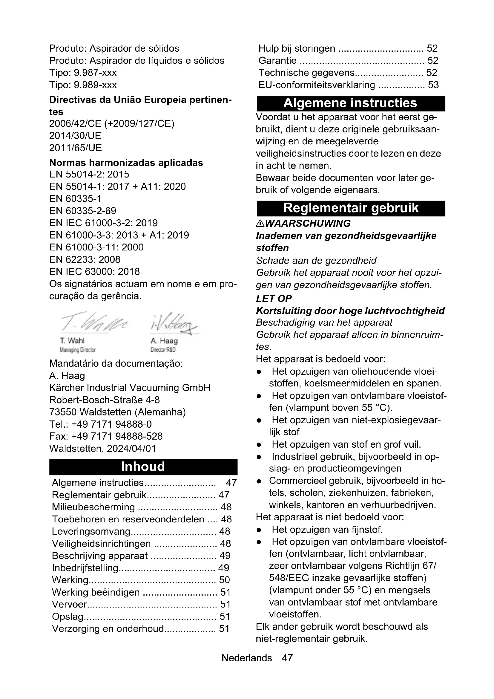 EN 61000-3-3: 2013 + A1: 2019 EN 61000-3-11: 2000 EN 62233: 2008 EN IEC 63000: 2018 Os signatários actuam em nome e em pro- curação da gerência. Mandatário da documentação: A. Haag Kärcher Industrial Vacuuming GmbH Robert-Bosch-Straße 4-8 73550 Waldstetten (Alemanha) Tel.: +49 7171 94888-0 Fax: +49 7171 94888-528 Waldstetten, 2024/04/01 Inhoud Algemene instructies Voordat u het apparaat voor het eerst ge- bruikt, dient u deze originele gebruiksaan- wijzing en de meegeleverde veiligheidsinstructies door te lezen en deze in acht te nemen. Bewaar beide documenten voor later ge- bruik of volgende eigenaars. Reglementair gebruik 몇 WAARSCHUWING Inademen van gezondheidsgevaarlijke stoffen Schade aan de gezondheid Gebruik het apparaat nooit voor het opzui- gen van gezondheidsgevaarlijke stoffen. LET OP Kortsluiting door hoge luchtvochtigheid Beschadiging van het apparaat Gebruik het apparaat alleen in binnenruim- tes. Het apparaat is bedoeld voor: ● Het opzuigen van oliehoudende vloei- stoffen, koelsmeermiddelen en spanen. ● Het opzuigen van ontvlambare vloeistof- fen (vlampunt boven 55 °C). ● Het opzuigen van niet-explosiegevaar- lijk stof ● Het opzuigen van stof en grof vuil. ● Industrieel gebruik, bijvoorbeeld in op- slag- en productieomgevingen