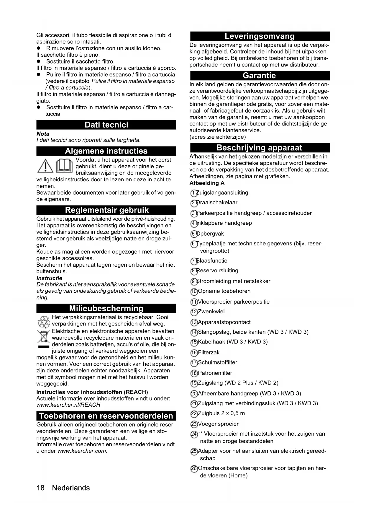 Figura T Guida alla risoluzione dei guasti I guasti hanno spesso cause semplici che possono es- sere risolte con l’ausilio della panoramica seguente. In caso di dubbi o di guasti qui non menzionati si consiglia di rivolgersi al servizio assistenza autorizzato. Diminuzione della potenza di aspirazione18 Nederlands Gli accessori, il tubo flessibile di aspirazione o i tubi di aspirazione sono intasati. Rimuovere l’ostruzione con un ausilio idoneo. Il sacchetto filtro è pieno. Sostituire il sacchetto filtro. Il filtro in materiale espanso / filtro a cartuccia è sporco. Pulire il filtro in materiale espanso / filtro a cartuccia (vedere il capitolo Pulire il filtro in materiale espanso / filtro a cartuccia). Il filtro in materiale espanso / filtro a cartuccia è danneg- giato. Sostituire il filtro in materiale espanso / filtro a car- tuccia. Dati tecnici Nota I dati tecnici sono riportati sulla targhetta. Algemene instructies Voordat u het apparaat voor het eerst gebruikt, dient u deze originele ge- bruiksaanwijzing en de meegeleverde veiligheidsinstructies door te lezen en deze in acht te nemen. Bewaar beide documenten voor later gebruik of volgen- de eigenaars. Reglementair gebruik Gebruik het apparaat uitsluitend voor de privé-huishouding. Het apparaat is overeenkomstig de beschrijvingen en veiligheidsinstructies in deze gebruiksaanwijzing be- stemd voor gebruik als veelzijdige natte en droge zui- ger. Koude as mag alleen worden opgezogen met hiervoor geschikte accessoires. Bescherm het apparaat tegen regen en bewaar het niet buitenshuis. Instructie De fabrikant is niet aansprakelijk voor eventuele schade als gevolg van ondeskundig gebruik of verkeerde bedie- ning. Milieubescherming Het verpakkingsmateriaal is recyclebaar. Gooi verpakkingen met het gescheiden afval weg. Elektrische en elektronische apparaten bevatten waardevolle recyclebare materialen en vaak on- derdelen zoals batterijen, accu's of olie, die bij on- juiste omgang of verkeerd weggooien een mogelijk gevaar voor de gezondheid en het milieu kun- nen vormen. Voor een correct gebruik van het apparaat zijn deze onderdelen echter noodzakelijk. Apparaten met dit symbool mogen niet met het huisvuil worden weggegooid. Instructies voor inhoudsstoffen (REACH) Actuele informatie over inhoudsstoffen vindt u onder: www.kaercher.nl/REACH Toebehoren en reserveonderdelen Gebruik alleen origineel toebehoren en originele reser- veonderdelen. Deze garanderen een veilige en sto- ringsvrije werking van het apparaat. Informatie over toebehoren en reserveonderdelen vindt u onder www.kaercher.com. Leveringsomvang De leveringsomvang van het apparaat is op de verpak- king afgebeeld. Controleer de inhoud bij het uitpakken op volledigheid. Bij ontbrekend toebehoren of bij trans- portschade neemt u contact op met uw distributeur. Garantie In elk land gelden de garantievoorwaarden die door on- ze verantwoordelijke verkoopmaatschappij zijn uitgege- ven. Mogelijke storingen aan uw apparaat verhelpen we binnen de garantieperiode gratis, voor zover een mate- riaal- of fabricagefout de oorzaak is. Als u gebruik wilt maken van de garantie, neemt u met uw aankoopbon contact op met uw distributeur of de dichtstbijzijnde ge- autoriseerde klantenservice. (adres zie achterzijde) Beschrijving apparaat Afhankelijk van het gekozen model zijn er verschillen in de uitrusting. De specifieke apparatuur wordt beschre- ven op de verpakking van het desbetreffende apparaat. Afbeeldingen, zie pagina met grafieken. Afbeelding A 1 Zuigslangaansluiting 2 Draaischakelaar 3 Parkeerpositie handgreep / accessoirehouder 4 Inklapbare handgreep 5 Opbergvak 6 Typeplaatje met technische gegevens (bijv. reser- voirgrootte) 7 Blaasfunctie 8 Reservoirsluiting 9 Stroomleiding met netstekker 10 Opname toebehoren 11 Vloersproeier parkeerpositie 12 Zwenkwiel 13 Apparaatstopcontact 14 Slangopslag, beide kanten (WD 3 / KWD 3) 15 Kabelhaak (WD 3 / KWD 3) 16 Filterzak 17 Schuimstoffilter 18 Patronenfilter 19 Zuigslang (WD 2 Plus / KWD 2) 20 Afneembare handgreep (WD 3 / KWD 3) 21 Zuigslang met verbindingsstuk (WD 3 / KWD 3) 22 Zuigbuis 2 x 0,5 m 23 Voegensproeier 24 ** Vloersproeier met inzetstuk voor het zuigen van natte en droge bestanddelen 25 Adapter voor het aansluiten van elektrisch gereed- schap 26 Omschakelbare vloersproeier voor tapijten en har- de vloeren (Home)Nederlands 19 27 Kussensproeier (Home) 28 2x filterzakken (Home) 29 Autosproeier (Car) 30 Extra lang voegensproeier (Car) 31 Zuigborstel met harde borstelharen (Car) 32 Zuigborstel met zachte borstelharen (Car / Workshop) 33 Flexibele gereedschapsslang (Workshop) ** Niet inbegrepen bij de Home-versie Zwenkwielen monteren