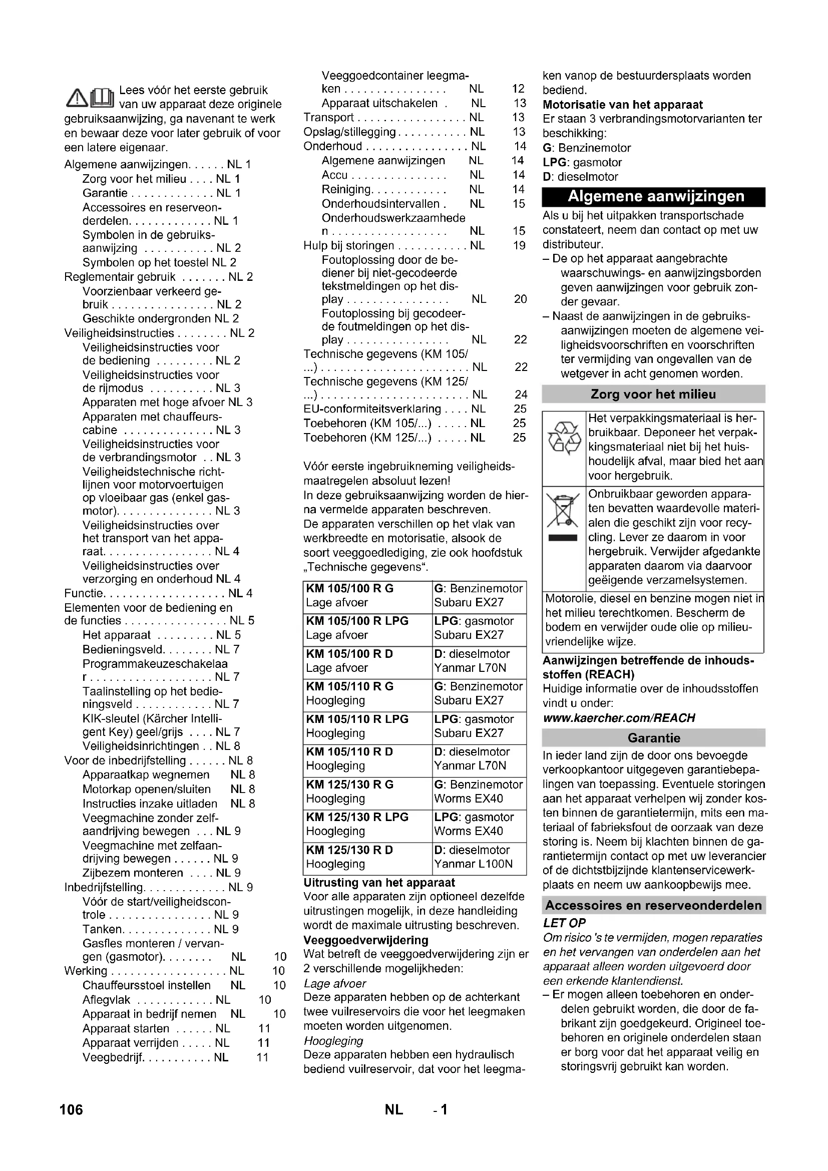 t transport van het appa- raat. . . . . . . . . . . . . . . . . NL 4 Veiligheidsinstructies over verzorging en onderhoud NL 4 Functie. . . . . . . . . . . . . . . . . . . NL 4 Elementen voor de bediening en de functies . . . . . . . . . . . . . . . . NL 5 Het apparaat . . . . . . . . . NL 5 Bedieningsveld. . . . . . . . NL 7 Programmakeuzeschakelaa r . . . . . . . . . . . . . . . . . . . NL 7 Taalinstelling op het bedie- ningsveld . . . . . . . . . . . . NL 7 KIK-sleutel (Kärcher Intelli- gent Key) geel/grijs . . . . NL 7 Veiligheidsinrichtingen . . NL 8 Voor de inbedrijfstelling . . . . . . NL 8 Apparaatkap wegnemen NL 8 Motorkap openen/sluiten NL 8 Instructies inzake uitladen NL 8 Veegmachine zonder zelf- aandrijving bewegen . . . NL 9 Veegmachine met zelfaan- drijving bewegen . . . . . . NL 9 Zijbezem monteren . . . . NL 9 Inbedrijfstelling. . . . . . . . . . . . . NL 9 Vóór de start/veiligheidscon- trole . . . . . . . . . . . . . . . . NL 9 Tanken. . . . . . . . . . . . . . NL 9 Gasfles monteren / vervan- gen (gasmotor). . . . . . . . NL 10 Werking . . . . . . . . . . . . . . . . . . NL 10 Chauffeursstoel instellen NL 10 Aflegvlak . . . . . . . . . . . . NL 10 Apparaat in bedrijf nemen NL 10 Apparaat starten . . . . . . NL 11 Apparaat verrijden . . . . . NL 11 Veegbedrijf. . . . . . . . . . . NL 11 Veeggoedcontainer leegma- ken . . . . . . . . . . . . . . . . NL 12 Apparaat uitschakelen . NL 13 Transport . . . . . . . . . . . . . . . . . NL 13 Opslag/stillegging . . . . . . . . . . . NL 13 Onderhoud . . . . . . . . . . . . . . . . NL 14 Algemene aanwijzingen NL 14 Accu . . . . . . . . . . . . . . . NL 14 Reiniging. . . . . . . . . . . . NL 14 Onderhoudsintervallen . NL 15 Onderhoudswerkzaamhede n . . . . . . . . . . . . . . . . . . NL 15 Hulp bij storingen . . . . . . . . . . . NL 19 Foutoplossing door de be- diener bij niet-gecodeerde tekstmeldingen op het dis- play . . . . . . . . . . . . . . . . NL 20 Foutoplossing bij gecodeer- de foutmeldingen op het dis- play . . . . . . . . . . . . . . . . NL 22 Technische gegevens (KM 105/ ...) . . . . . . . . . . . . . . . . . . . . . . . NL 22 Technische gegevens (KM 125/ ...) . . . . . . . . . . . . . . . . . . . . . . . NL 24 EU-conformiteitsverklaring . . . . NL 25 Toebehoren (KM 105/...) . . . . . NL 25 Toebehoren (KM 125/...) . . . . . NL 25 KM 105/100 R G Lage afvoer G: Benzinemotor Subaru EX27