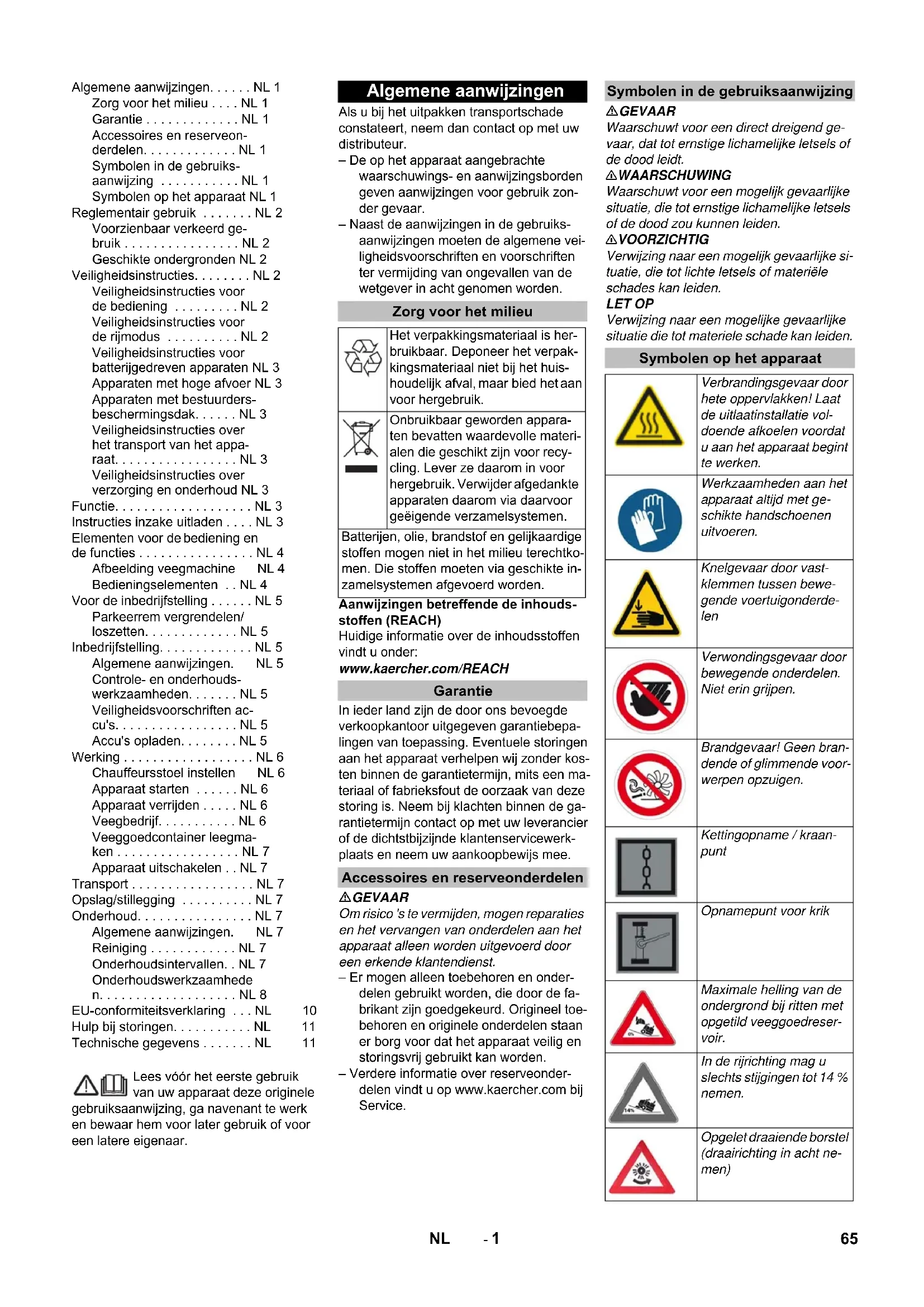 0,1 0,1 Dimensioni e pesi Lunghezza x larghezza x Altezza mm 1847 x 1065 x 1388 1847 x 1065 x 1388 Raggio di inversione destro mm 2470 2470 Raggio di inversione sinistro mm 2470 2470 Peso a vuoto (senza/con batteria) kg 560/860 560/860 Peso totale consentito kg 1224 1224 Carico assiale anteriore consentito kg 734 734 Carico assiale posteriore consentito kg 490 490 Con riserva di modifiche tecniche! 64 IT- 1 Lees vóór het eerste gebruik van uw apparaat deze originele gebruiksaanwijzing, ga navenant te werk en bewaar hem voor later gebruik of voor een latere eigenaar. Als u bij het uitpakken transportschade constateert, neem dan contact op met uw distributeur. – De op het apparaat aangebrachte waarschuwings- en aanwijzingsborden geven aanwijzingen voor gebruik zon- der gevaar. – Naast de aanwijzingen in de gebruiks- aanwijzingen moeten de algemene vei- ligheidsvoorschriften en voorschriften ter vermijding van ongevallen van de wetgever in acht genomen worden. Aanwijzingen betreffende de inhouds- stoffen (REACH) Huidige informatie over de inhoudsstoffen vindt u onder: www.kaercher.com/REACH In ieder land zijn de door ons bevoegde verkoopkantoor uitgegeven garantiebepa- lingen van toepassing. Eventuele storingen aan het apparaat verhelpen wij zonder kos- ten binnen de garantietermijn, mits een ma- teriaal of fabrieksfout de oorzaak van deze storing is. Neem bij klachten binnen de ga- rantietermijn contact op met uw leverancier of de dichtstbijzijnde klantenservicewerk- plaats en neem uw aankoopbewijs mee. GEVAAR Om risico 's te vermijden, mogen reparaties en het vervangen van onderdelen aan het apparaat alleen worden uitgevoerd door een erkende klantendienst. – Er mogen alleen toebehoren en onder- delen gebruikt worden, die door de fa- brikant zijn goedgekeurd. Origineel toe- behoren en originele onderdelen staan er borg voor dat het apparaat veilig en storingsvrij gebruikt kan worden. – Verdere informatie over reserveonder- delen vindt u op www.kaercher.com bij Service. GEVAAR Waarschuwt voor een direct dreigend ge- vaar, dat tot ernstige lichamelijke letsels of de dood leidt. 몇 WAARSCHUWING Waarschuwt voor een mogelijk gevaarlijke situatie, die tot ernstige lichamelijke letsels of de dood zou kunnen leiden. 몇 VOORZICHTIG Verwijzing naar een mogelijk gevaarlijke si- tuatie, die tot lichte letsels of materiële schades kan leiden. LET OP Verwijzing naar een mogelijke gevaarlijke situatie die tot materiele schade kan leiden. Algemene aanwijzingen. . . . . . NL 1 Zorg voor het milieu . . . . NL 1 Garantie . . . . . . . . . . . . . NL 1 Accessoires en reserveon- derdelen. . . . . . . . . . . . . NL 1 Symbolen in de gebruiks- aanwijzing . . . . . . . . . . . NL 1 Symbolen op het apparaat NL 1 Reglementair gebruik . . . . . . . NL 2 Voorzienbaar verkeerd ge- bruik . . . . . . . . . . . . . . . . NL 2 Geschikte ondergronden NL 2 Veiligheidsinstructies. . . . . . . . NL 2 Veiligheidsinstructies voor de bediening . . . . . . . . . NL 2 Veiligheidsinstructies voor de rijmodus . . . . . . . . . . NL 2 Veiligheidsinstructies voor batterijgedreven apparaten NL 3 Apparaten met hoge afvoer NL 3 Apparaten met bestuurders- beschermingsdak. . . . . . NL 3 Veiligheidsinstructies over het transport van het appa- raat. . . . . . . . . . . . . . . . . NL 3 Veiligheidsinstructies over verzorging en onderhoud NL 3 Functie. . . . . . . . . . . . . . . . . . . NL 3 Instructies inzake uitladen . . . . NL 3 Elementen voor de bediening en de functies . . . . . . . . . . . . . . . . NL 4 Afbeelding veegmachine NL 4 Bedieningselementen . . NL 4 Voor de inbedrijfstelling . . . . . . NL 5 Parkeerrem vergrendelen/ losz etten. . . . . . . . . . . . . NL 5 Inbedrijfstelling. . . . . . . . . . . . . NL 5 Algemene aanwijzingen. NL 5 Controle- en onderhouds- werkzaamheden. . . . . . . NL 5 Veiligheidsvoorschriften ac- cu's. . . . . . . . . . . . . . . . . NL 5 Accu's opladen. . . . . . . . NL 5 Werking . . . . . . . . . . . . . . . . . . NL 6 Chauffeursstoel instellen NL 6 Apparaat starten . . . . . . NL 6 Apparaat verrijden . . . . . NL 6 Veegbedrijf. . . . . . . . . . . NL 6 Veeggoedcontainer leegma- ken . . . . . . . . . . . . . . . . . NL 7 Apparaat uitschakelen . . NL 7 Transport . . . . . . . . . . . . . . . . . NL 7 Opslag/stillegging . . . . . . . . . . NL 7 Onderhoud. . . . . . . . . . . . . . . . NL 7 Algemene aanwijzingen. NL 7 Reiniging . . . . . . . . . . . . NL 7 Onderhoudsintervallen. . NL 7 Onderhoudswerkzaamhede n. . . . . . . . . . . . . . . . . . . NL 8 EU-conformiteitsverklaring . . . NL 10 Hulp bij storingen. . . . . . . . . . . NL 11 Technische gegevens . . . . . . . NL 11 Algemene aanwijzingen Zorg voor het milieu Het verpakkingsmateriaal is her- bruikbaar. Deponeer het verpak- kingsmateriaal niet bij het huis- houdelijk afval, maar bied het aan voor hergebruik. Onbruikbaar geworden appara- ten bevatten waardevolle materi- alen die geschikt zijn voor recy- cling. Lever ze daarom in voor hergebruik. Verwijder afgedankte apparaten daarom via daarvoor geëigende verzamelsystemen. Batterijen, olie, brandstof en gelijkaardige stoffen mogen niet in het milieu terechtko- men. Die stoffen moeten via geschikte in- zamelsystemen afgevoerd worden. Garantie Accessoires en reserveonderdelen Symbolen in de gebruiksaanwijzing Symbolen op het apparaat Verbrandingsgevaar door hete oppervlakken! Laat de uitlaatinstallatie vol- doende afkoelen voordat u aan het apparaat begint te werken. Werkzaamheden aan het apparaat altijd met ge- schikte handschoenen uitvoeren. Knelgevaar door vast- klemmen tussen bewe- gende voertuigonderde- len Verwondingsgevaar door bewegende onderdelen. Niet erin grijpen. Brandgevaar! Geen bran- dende of glimmende voor- werpen opzuigen. Kettingopname / kraan- punt Opnamepunt voor krik Maximale helling van de ondergrond bij ritten met opgetild veeggoedreser- voir. In de rijrichting mag u slechts stijgingen tot 14 % nemen. Opgelet draaiende borstel (draairichting in acht ne- men) 65NL- 2 D