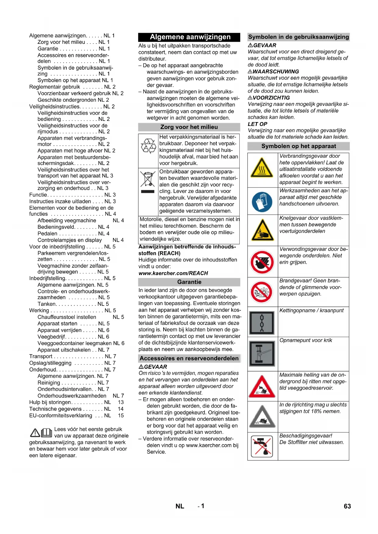 Prodotto: Spazzatrice aspirante uomo a bordo Modello: KM 120/250 R D 1.186-000.0 Direttive UE pertinenti 2006/42/CE (+2009/127/CE) 2014/30/UE 2000/14/CE Norme armonizzate applicate EN 60335–1 EN 60335–2–72 EN 55012: 2007 + A1: 2009 EN 61000–6–2: 2005 EN 62233: 2008 Procedura di valutazione della confor- mità applicata 2000/14/CE: Allegato V Livello di potenza sonora dB(A) Misurato: 97 Garantito: 99 Chairman of the Board of Management Director Regulatory Affairs & Certification 62 IT- 1 Lees vóór het eerste gebruik van uw apparaat deze originele gebruiksaanwijzing, ga navenant te werk en bewaar hem voor later gebruik of voor een latere eigenaar. Als u bij het uitpakken transportschade constateert, neem dan contact op met uw distributeur. – De op het apparaat aangebrachte waarschuwings- en aanwijzingsborden geven aanwijzingen voor gebruik zon- der gevaar. – Naast de aanwijzingen in de gebruiks- aanwijzingen moeten de algemene vei- ligheidsvoorschriften en voorschriften ter vermijding van ongevallen van de wetgever in acht genomen worden. Aanwijzingen betreffende de inhouds- stoffen (REACH) Huidige informatie over de inhoudsstoffen vindt u onder: www.kaercher.com/REACH In ieder land zijn de door ons bevoegde verkoopkantoor uitgegeven garantiebepa- lingen van toepassing. Eventuele storingen aan het apparaat verhelpen wij zonder kos- ten binnen de garantietermijn, mits een ma- teriaal of fabrieksfout de oorzaak van deze storing is. Neem bij klachten binnen de ga- rantietermijn contact op met uw leverancier of de dichtstbijzijnde klantenservicewerk- plaats en neem uw aankoopbewijs mee. GEVAAR Om risico 's te vermijden, mogen reparaties en het vervangen van onderdelen aan het apparaat alleen worden uitgevoerd door een erkende klantendienst. – Er mogen alleen toebehoren en onder- delen gebruikt worden, die door de fa- brikant zijn goedgekeurd. Origineel toe- behoren en originele onderdelen staan er borg voor dat het apparaat veilig en storingsvrij gebruikt kan worden. – Verdere informatie over reserveonder- delen vindt u op www.kaercher.com bij Service. GEVAAR Waarschuwt voor een direct dreigend ge- vaar, dat tot ernstige lichamelijke letsels of de dood leidt. 몇 WAARSCHUWING Waarschuwt voor een mogelijk gevaarlijke situatie, die tot ernstige lichamelijke letsels of de dood zou kunnen leiden. 몇 VOORZICHTIG Verwijzing naar een mogelijk gevaarlijke si- tuatie, die tot lichte letsels of materiële schades kan leiden. LET OP Verwijzing naar een mogelijke gevaarlijke situatie die tot materiele schade kan leiden. Algemene aanwijzingen. . . . . . NL 1 Zorg voor het milieu . . . . NL 1 Garantie . . . . . . . . . . . . . NL 1 Accessoires en reserveonder- delen . . . . . . . . . . . . . . . NL 1 Symbolen in de gebruiksaanwij- zing . . . . . . . . . . . . . . . . NL 1 Symbolen op het apparaat NL 1 Reglementair gebruik . . . . . . . NL 2 Voorzienbaar verkeerd gebruik NL 2 Geschikte ondergronden NL 2 Veiligheidsinstructies. . . . . . . . NL 2 Veiligheidsinstructies voor de bediening . . . . . . . . . . . . NL 2 Veiligheidsinstructies voor de rijmodus . . . . . . . . . . . . . NL 2 Apparaten met verbrandings- motor . . . . . . . . . . . . . . . NL 2 Apparaten met hoge afvoer NL 2 Apparaten met bestuurdersbe- schermingsdak. . . . . . . . NL 2 Veiligheidsinstructies over het transport van het apparaat NL 3 Veiligheidsinstructies over ver- zorging en onderhoud . . NL 3 Functie. . . . . . . . . . . . . . . . . . . NL 3 Instructies inzake uitladen . . . . NL 3 Elementen voor de bediening en de functies . . . . . . . . . . . . . . . . . . NL 4 Afbeelding veegmachine NL 4 Bedieningsveld. . . . . . . . NL 4 Pedalen . . . . . . . . . . . . . NL 4 Controlelampjes en display NL 4 Voor de inbedrijfstelling . . . . . . NL 5 Parkeerrem vergrendelen/los- zetten . . . . . . . . . . . . . . . NL 5 Veegmachine zonder zelfaan- drijving bewegen . . . . . . NL 5 Inbedrijfstelling. . . . . . . . . . . . . NL 5 Algemene aanwijzingen. NL 5 Controle- en onderhoudswerk- zaamheden . . . . . . . . . . NL 5 Tanken. . . . . . . . . . . . . . NL 5 Werking . . . . . . . . . . . . . . . . . . NL 5 Chauffeursstoel instellen NL 5 Apparaat starten . . . . . . NL 5 Apparaat verrijden . . . . . NL 6 Veegbedrijf. . . . . . . . . . . NL 6 Veeggoedcontainer leegmaken NL 6 Apparaat uitschakelen . . NL 7 Transport . . . . . . . . . . . . . . . . . NL 7 Opslag/stillegging . . . . . . . . . . NL 7 Onderhoud. . . . . . . . . . . . . . . . NL 7 Algemene aanwijzingen. NL 7 Reiniging . . . . . . . . . . . . NL 7 Onderhoudsintervallen. . NL 7 Onderhoudswerkzaamheden NL 7 Hulp bij storingen. . . . . . . . . . . NL 13 Technische gegevens . . . . . . . NL 14 EU-conformiteitsverklaring . . . NL 15 Algemene aanwijzingen Zorg voor het milieu Het verpakkingsmateriaal is her- bruikbaar. Deponeer het verpak- kingsmateriaal niet bij het huis- houdelijk afval, maar bied het aan voor hergebruik. Onbruikbaar geworden appara- ten bevatten waardevolle materi- alen die geschikt zijn voor recy- cling. Lever ze daarom in voor hergebruik. Verwijder afgedankte apparaten daarom via daarvoor geëigende verzamelsystemen. Motorolie, diesel en benzine mogen niet in het milieu terechtkomen. Bescherm de bodem en verwijder oude olie op milieu- vriendelijke wijze. Garantie Accessoires en reserveonderdelen Symbolen in de gebruiksaanwijzing Symbolen op het apparaat Verbrandingsgevaar door hete oppervlakken! Laat de uitlaatinstallatie voldoende afkoelen voordat u aan het apparaat begint te werken. Werkzaamheden aan het ap- paraat altijd met geschikte handschoenen uitvoeren. Knelgevaar door vastklem- men tussen bewegende voertuigonderdelen Verwondingsgevaar door be- wegende onderdelen. Niet erin grijpen. Brandgevaar! Geen bran- dende of glimmende voor- werpen opzuigen. Kettingopname / kraanpunt Opnamepunt voor krik Maximale helling van de on- dergrond bij ritten met opge- tild veeggoedreservoir. In de rijrichting mag u slechts stijgingen tot 18% nemen. Beschadigingsg