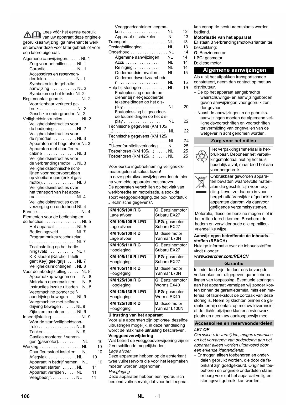 t transport van het appa- raat. . . . . . . . . . . . . . . . . NL 4 Veiligheidsinstructies over verzorging en onderhoud NL 4 Functie. . . . . . . . . . . . . . . . . . . NL 4 Elementen voor de bediening en de functies . . . . . . . . . . . . . . . . NL 5 Het apparaat . . . . . . . . . NL 5 Bedieningsveld. . . . . . . . NL 7 Programmakeuzeschakelaa r . . . . . . . . . . . . . . . . . . . NL 7 Taalinstelling op het bedie- ningsveld . . . . . . . . . . . . NL 7 KIK-sleutel (Kärcher Intelli- gent Key) geel/grijs . . . . NL 7 Veiligheidsinrichtingen . . NL 8 Voor de inbedrijfstelling . . . . . . NL 8 Apparaatkap wegnemen NL 8 Motorkap openen/sluiten NL 8 Instructies inzake uitladen NL 8 Veegmachine zonder zelf- aandrijving bewegen . . . NL 9 Veegmachine met zelfaan- drijving bewegen . . . . . . NL 9 Zijbezem monteren . . . . NL 9 Inbedrijfstelling. . . . . . . . . . . . . NL 9 Vóór de start/veiligheidscon- trole . . . . . . . . . . . . . . . . NL 9 Tanken. . . . . . . . . . . . . . NL 9 Gasfles monteren / vervan- gen (gasmotor). . . . . . . . NL 10 Werking . . . . . . . . . . . . . . . . . . NL 10 Chauffeursstoel instellen NL 10 Aflegvlak . . . . . . . . . . . . NL 10 Apparaat in bedrijf nemen NL 10 Apparaat starten . . . . . . NL 11 Apparaat verrijden . . . . . NL 11 Veegbedrijf. . . . . . . . . . . NL 11 Veeggoedcontainer leegma- ken . . . . . . . . . . . . . . . . NL 12 Apparaat uitschakelen . NL 13 Transport . . . . . . . . . . . . . . . . . NL 13 Opslag/stillegging . . . . . . . . . . . NL 13 Onderhoud . . . . . . . . . . . . . . . . NL 14 Algemene aanwijzingen NL 14 Accu . . . . . . . . . . . . . . . NL 14 Reiniging. . . . . . . . . . . . NL 14 Onderhoudsintervallen . NL 15 Onderhoudswerkzaamhede n . . . . . . . . . . . . . . . . . . NL 15 Hulp bij storingen . . . . . . . . . . . NL 19 Foutoplossing door de be- diener bij niet-gecodeerde tekstmeldingen op het dis- play . . . . . . . . . . . . . . . . NL 20 Foutoplossing bij gecodeer- de foutmeldingen op het dis- play . . . . . . . . . . . . . . . . NL 22 Technische gegevens (KM 105/ ...) . . . . . . . . . . . . . . . . . . . . . . . NL 22 Technische gegevens (KM 125/ ...) . . . . . . . . . . . . . . . . . . . . . . . NL 24 EU-conformiteitsverklaring . . . . NL 25 Toebehoren (KM 105/...) . . . . . NL 25 Toebehoren (KM 125/...) . . . . . NL 25 KM 105/100 R G Lage afvoer G: Benzinemotor Subaru EX27