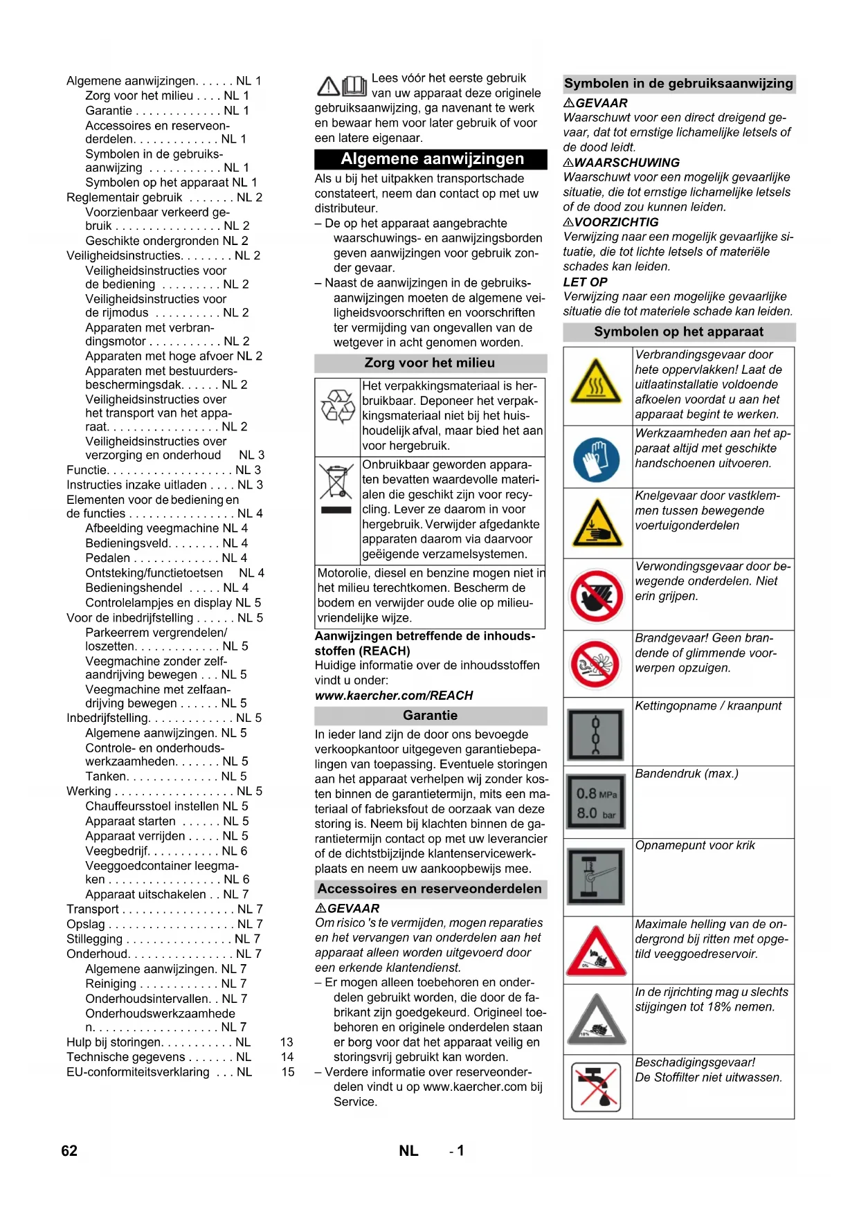 Procedura di valutazione della confor- mità applicata 2000/14/CE: Allegato V Livello di potenza sonora dB(A) Misurato: 99 Garantito: 102 Chairman of the Board of Management Director Regulatory Affairs & Certification 61IT- 1 Lees vóór het eerste gebruik van uw apparaat deze originele gebruiksaanwijzing, ga navenant te werk en bewaar hem voor later gebruik of voor een latere eigenaar. Als u bij het uitpakken transportschade constateert, neem dan contact op met uw distributeur. – De op het apparaat aangebrachte waarschuwings- en aanwijzingsborden geven aanwijzingen voor gebruik zon- der gevaar. – Naast de aanwijzingen in de gebruiks- aanwijzingen moeten de algemene vei- ligheidsvoorschriften en voorschriften ter vermijding van ongevallen van de wetgever in acht genomen worden. Aanwijzingen betreffende de inhouds- stoffen (REACH) Huidige informatie over de inhoudsstoffen vindt u onder: www.kaercher.com/REACH In ieder land zijn de door ons bevoegde verkoopkantoor uitgegeven garantiebepa- lingen van toepassing. Eventuele storingen aan het apparaat verhelpen wij zonder kos- ten binnen de garantietermijn, mits een ma- teriaal of fabrieksfout de oorzaak van deze storing is. Neem bij klachten binnen de ga- rantietermijn contact op met uw leverancier of de dichtstbijzijnde klantenservicewerk- plaats en neem uw aankoopbewijs mee. GEVAAR Om risico 's te vermijden, mogen reparaties en het vervangen van onderdelen aan het apparaat alleen worden uitgevoerd door een erkende klantendienst. – Er mogen alleen toebehoren en onder- delen gebruikt worden, die door de fa- brikant zijn goedgekeurd. Origineel toe- behoren en originele onderdelen staan er borg voor dat het apparaat veilig en storingsvrij gebruikt kan worden. – Verdere informatie over reserveonder- delen vindt u op www.kaercher.com bij Service. GEVAAR Waarschuwt voor een direct dreigend ge- vaar, dat tot ernstige lichamelijke letsels of de dood leidt. 몇 WAARSCHUWING Waarschuwt voor een mogelijk gevaarlijke situatie, die tot ernstige lichamelijke letsels of de dood zou kunnen leiden. 몇 VOORZICHTIG Verwijzing naar een mogelijk gevaarlijke si- tuatie, die tot lichte letsels of materiële schades kan leiden. LET OP Verwijzing naar een mogelijke gevaarlijke situatie die tot materiele schade kan leiden. Algemene aanwijzingen. . . . . . NL 1 Zorg voor het milieu . . . . NL 1 Garantie . . . . . . . . . . . . . NL 1 Accessoires en reserveon- derdelen. . . . . . . . . . . . . NL 1 Symbolen in de gebruiks- aanwijzing . . . . . . . . . . . NL 1 Symbolen op het apparaat NL 1 Reglementair gebruik . . . . . . . NL 2 Voorzienbaar verkeerd ge- bruik . . . . . . . . . . . . . . . . NL 2 Geschikte ondergronden NL 2 Veiligheidsinstructies. . . . . . . . NL 2 Veiligheidsinstructies voor de bediening . . . . . . . . . NL 2 Veiligheidsinstructies voor de rijmodus . . . . . . . . . . NL 2 Apparaten met verbran- dingsmotor . . . . . . . . . . . NL 2 Apparaten met hoge afvoer NL 2 Apparaten met bestuurders- beschermingsdak. . . . . . NL 2 Veiligheidsinstructies over het transport van het appa- raat. . . . . . . . . . . . . . . . . NL 2 Veiligheidsinstructies over verzorging en onderhoud NL 3 Functie. . . . . . . . . . . . . . . . . . . NL 3 Instructies inzake uitladen . . . . NL 3 Elementen voor de bediening en de functies . . . . . . . . . . . . . . . . NL 4 Afbeelding veegmachine NL 4 Bedieningsveld. . . . . . . . NL 4 Pedalen . . . . . . . . . . . . . NL 4 Ontsteking/functietoetsen NL 4 Bedieningshendel . . . . . NL 4 Controlelampjes en display NL 5 Voor de inbedrijfstelling . . . . . . NL 5 Parkeerrem vergrendelen/ loszetten. . . . . . . . . . . . . NL 5 Veegmachine zonder zelf- aandrijving bewegen . . . NL 5 Veegmachine met zelfaan- drijving bewegen . . . . . . NL 5 Inbedrijfstelling. . . . . . . . . . . . . NL 5 Algemene aanwijzingen. NL 5 Controle- en onderhouds- werkzaamheden. . . . . . . NL 5 Tanken. . . . . . . . . . . . . . NL 5 Werking . . . . . . . . . . . . . . . . . . NL 5 Chauffeursstoel instellen NL 5 Apparaat starten . . . . . . NL 5 Apparaat verrijden . . . . . NL 5 Veegbedrijf. . . . . . . . . . . NL 6 Veeggoedcontainer leegma- ken . . . . . . . . . . . . . . . . . NL 6 Apparaat uitschakelen . . NL 7 Transport . . . . . . . . . . . . . . . . . NL 7 Opslag . . . . . . . . . . . . . . . . . . . NL 7 Stillegging . . . . . . . . . . . . . . . . NL 7 Onderhoud. . . . . . . . . . . . . . . . NL 7 Algemene aanwijzingen. NL 7 Reiniging . . . . . . . . . . . . NL 7 Onderhoudsintervallen. . NL 7 Onderhoudswerkzaamhede n. . . . . . . . . . . . . . . . . . . NL 7 Hulp bij storingen. . . . . . . . . . . NL 13 Technische gegevens . . . . . . . NL 14 EU-conformiteitsverklaring . . . NL 15 Algemene aanwijzingen Zorg voor het milieu Het verpakkingsmateriaal is her- bruikbaar. Deponeer het verpak- kingsmateriaal niet bij het huis- houdelijk afval, maar bied het aan voor hergebruik. Onbruikbaar geworden appara- ten bevatten waardevolle materi- alen die geschikt zijn voor recy- cling. Lever ze daarom in voor hergebruik. Verwijder afgedankte apparaten daarom via daarvoor geëigende verzamelsystemen. Motorolie, diesel en benzine mogen niet in het milieu terechtkomen. Bescherm de bodem en verwijder oude olie op milieu- vriendelijke wijze. Garantie Accessoires en reserveonderdelen Symbolen in de gebruiksaanwijzing Symbolen op het apparaat Verbrandingsgevaar door hete oppervlakken! Laat de uitlaatinstallatie voldoende afkoelen voordat u aan het apparaat begint te werken. Werkzaamheden aan het ap- paraat altijd met geschikte handschoenen uitvoeren. Knelgevaar door vastklem- men tussen bewegende voertuigonderdelen Verwondingsgevaar door be- wegende onderdelen. Niet erin grijpen. Brandgevaar! Geen bran- dende of glimmende voor- werpen opzuigen. Kettingopname / kraanpunt Bandendruk (max.) Opnamepunt voor krik Maximale helling van de on- dergrond bij ritten met opge- tild veeggoedreservoir. In de rijrichting mag u slechts stijgingen tot 18% nemen. Beschadigingsgevaar!