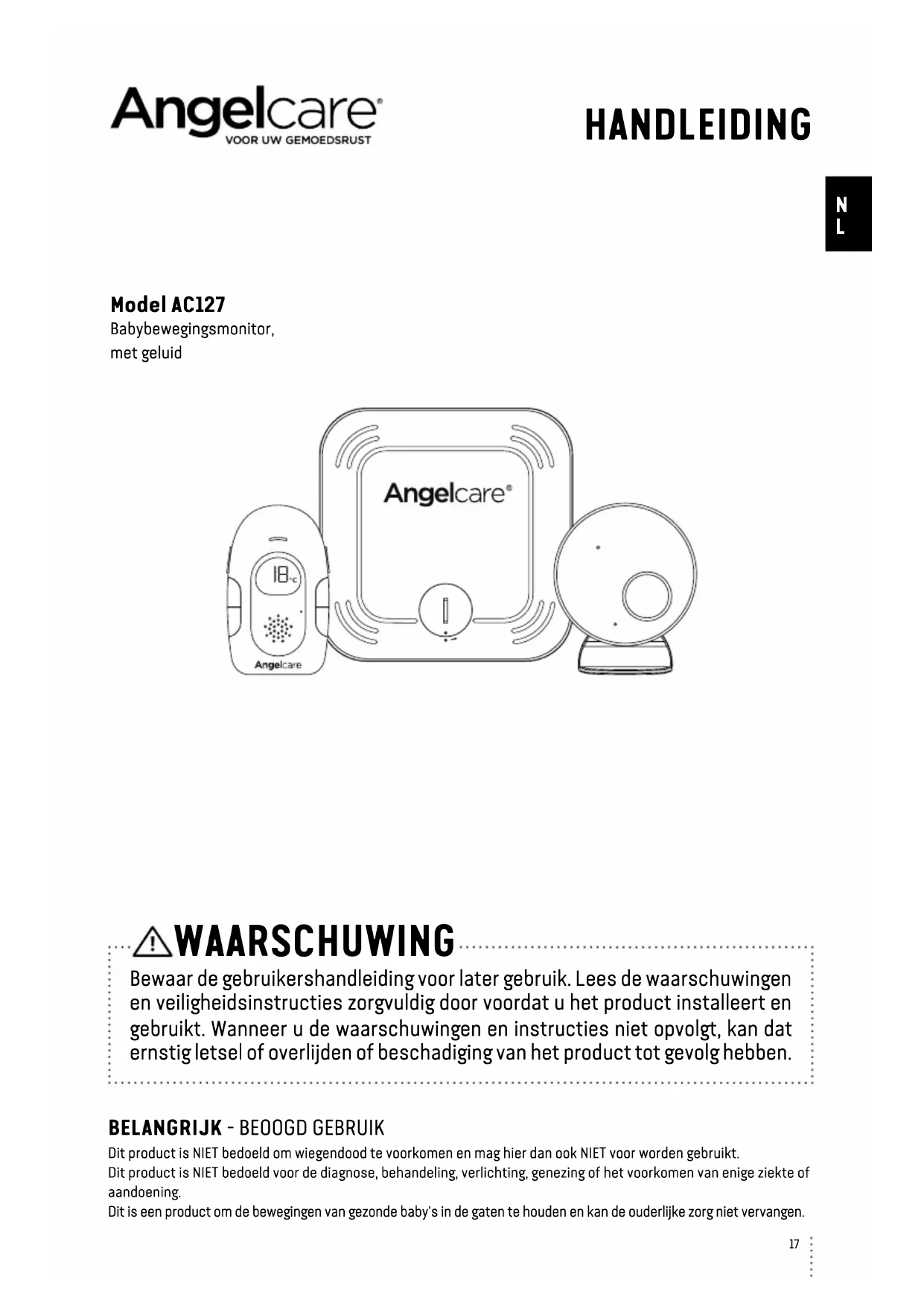 Bewaar de gebruikershandleiding voor later gebruik. Lees de waarschuwingen en veiligheidsinstructies zorgvuldig door voordat u het product installeert en gebruikt. Wanneer u de waarschuwingen en instructies niet opvolgt, kan dat ernstig letsel of overlijden of beschadiging van het product tot gevolg hebben. WAARSCHUWING Model AC127 Babybewegingsmonitor, met geluid HANDLEIDING