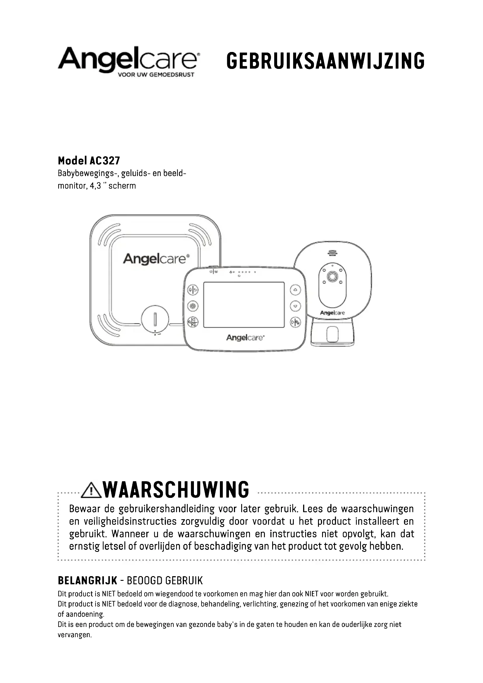 Dit product is NIET bedoeld om wiegendood te voorkomen en mag hier dan ook NIET voor worden gebruikt. Dit product is NIET bedoeld voor de diagnose, behandeling, verlichting, genezing of het voorkomen van enige ziekte of aandoening. Dit is een product om de bewegingen van gezonde baby's in de gaten te houden en kan de ouderlijke zorg niet vervangen. Model AC327 Babybewegings-, geluids- en beeld- monitor, 4,3 ‘’ scherm18