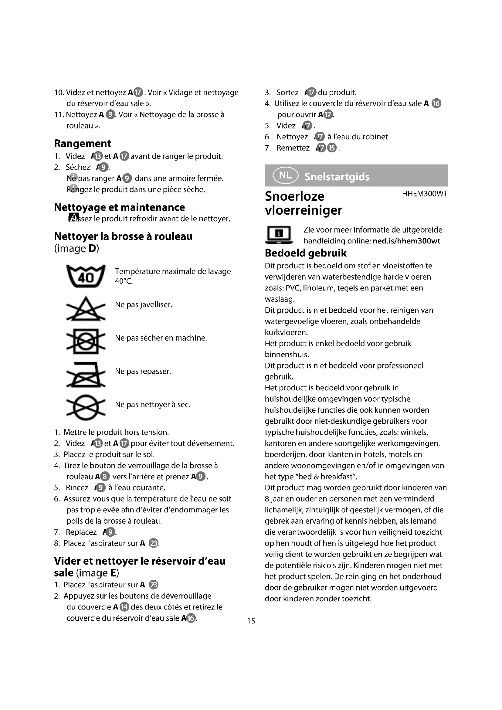 Snelstartgids Snoerloze vloerreiniger HHEM300WTZie voor meer informatie de uitgebreide handleiding online: ned.is/hhem300wt Bedoeld gebruik Dit product is bedoeld om stof en vloeistoen te verwijderen van waterbestendige harde vloeren zoals: PVC, linoleum, tegels en parket met een waslaag.Dit product is niet bedoeld voor het reinigen van watergevoelige vloeren, zoals onbehandelde kurkvloeren.Het product is enkel bedoeld voor gebruik binnenshuis.Dit product is niet bedoeld voor professioneel gebruik.Het product is bedoeld voor gebruik in huishoudelijke omgevingen voor typische huishoudelijke functies die ook kunnen worden gebruikt door niet-deskundige gebruikers voor typische huishoudelijke functies, zoals: winkels, kantoren en andere soortgelijke werkomgevingen, boerderijen, door klanten in hotels, motels en andere woonomgevingen en/of in omgevingen van het type “bed & breakfast”.Dit product mag worden gebruikt door kinderen van 8 jaar en ouder en personen met een verminderd lichamelijk, zintuiglijk of geestelijk vermogen, of die gebrek aan ervaring of kennis hebben, als iemand die verantwoordelijk is voor hun veiligheid toezicht op hen houdt of hen is uitgelegd hoe het product veilig dient te worden gebruikt en ze begrijpen wat de potentiële risico's zijn. Kinderen mogen niet met het product spelen. De reiniging en het onderhoud door de gebruiker mogen niet worden uitgevoerd door kinderen zonder toezicht.10. Videz et nettoyez A . Voir «Vidage et nettoyage du réservoir d’eau sale».11. Nettoyez A . Voir « Nettoyage de la brosse à rouleau ». Rangement
