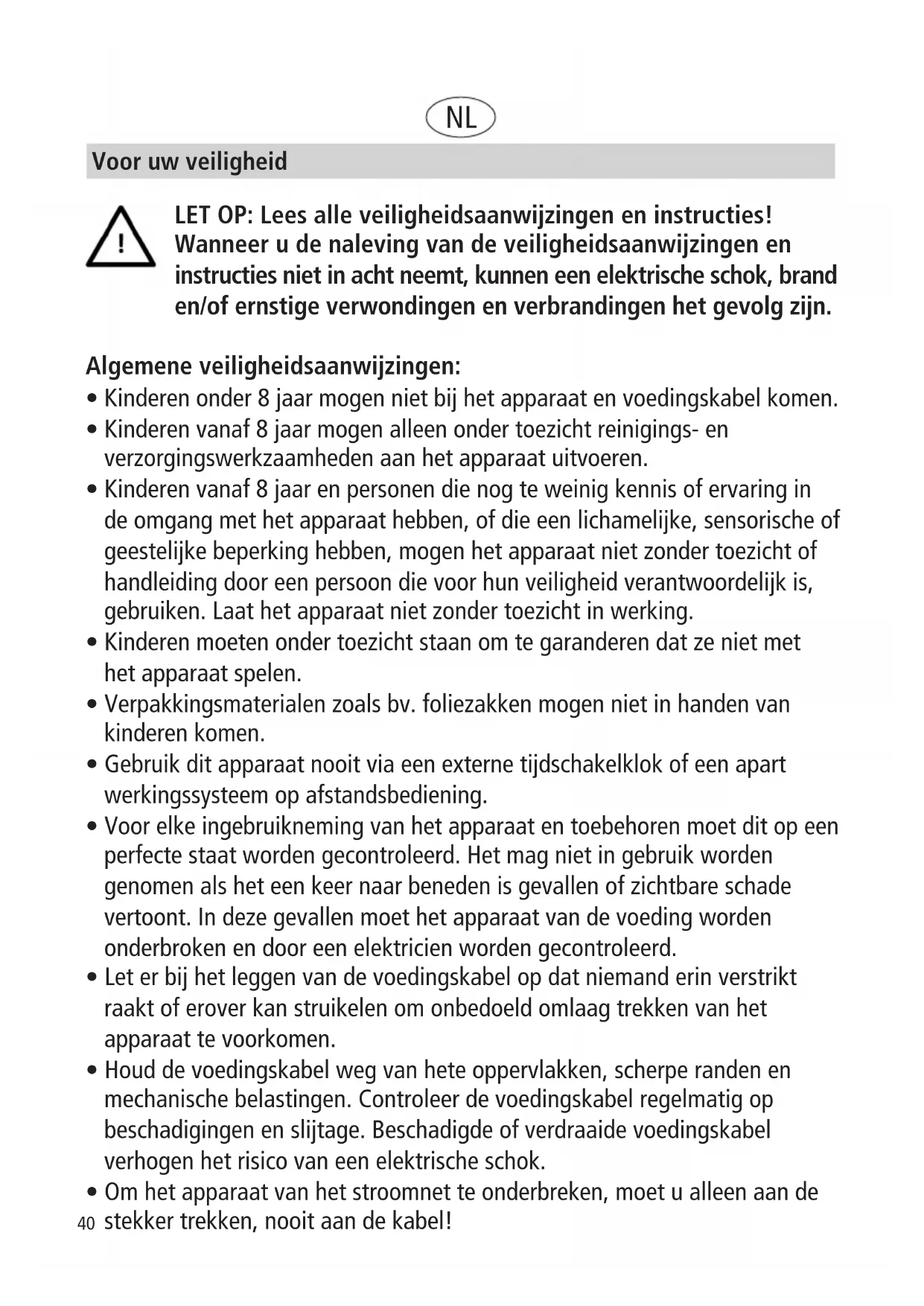 LET OP: Lees alle veiligheidsaanwijzingen en instructies! Wanneer u de naleving van de veiligheidsaanwijzingen en instructies niet in acht neemt, kunnen een elektrische schok, brand en/of ernstige verwondingen en verbrandingen het gevolg zijn. Algemene veiligheidsaanwijzingen: