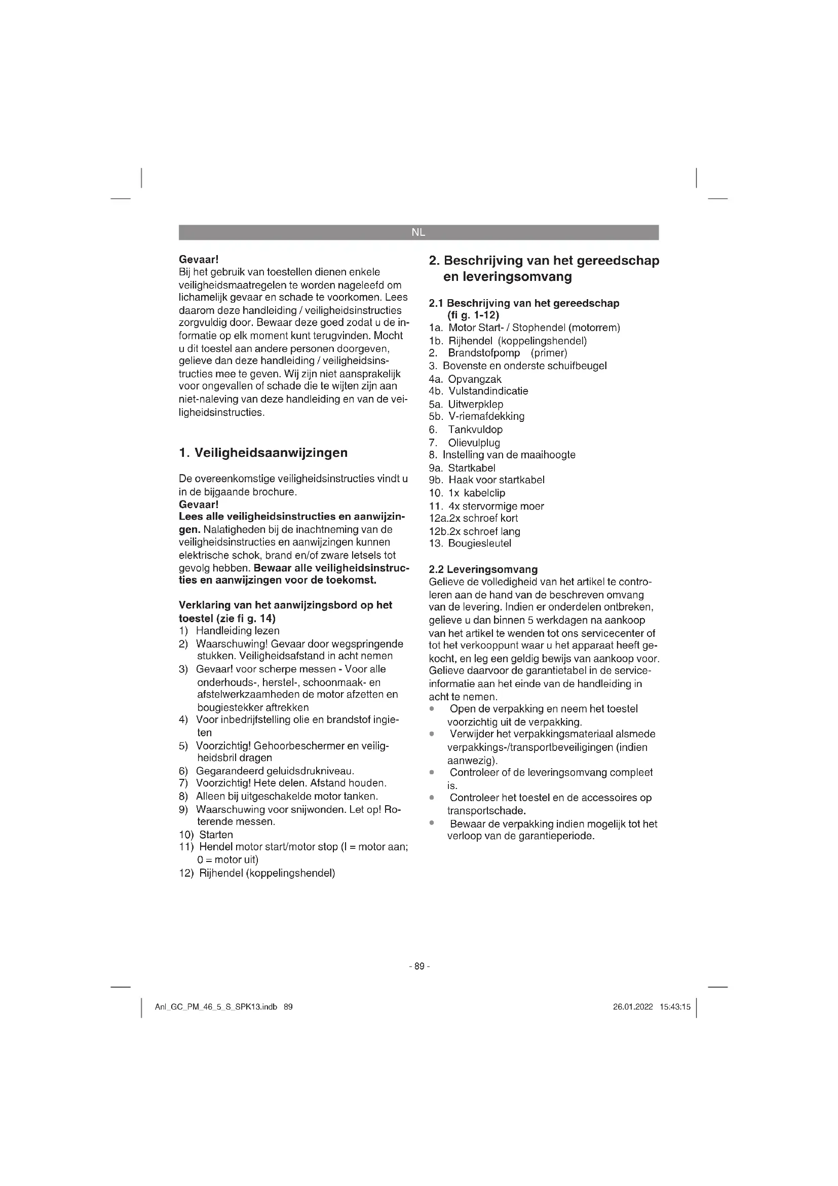 Vergewis u er na een reparatie of onderhoudsbe- urt van dat alle veiligheidstechnische onderdelen aangebracht en in foutloze staat zijn. Delen die verwondingen kunnen veroorzaken, moeten voor andere personen en kinderen on- toegankelijk worden bewaard. Aanwijzing! Volgens de wet productaanspra- kelijkheid zijn wij niet aansprakelijk voor schade als gevolg van ondeskundige reparatie, of als bij onderdelen geen originele of door ons vrijge- geven delen worden gebruikt. Wij zijn evenmin aansprakelijk voor schade die te wijten is aan on- Anl_GC_PM_46_5_S_SPK13.indb 94Anl_GC_PM_46_5_S_SPK13.indb 94 26.01.2022 15:43:1626.01.2022 15:43:16NL