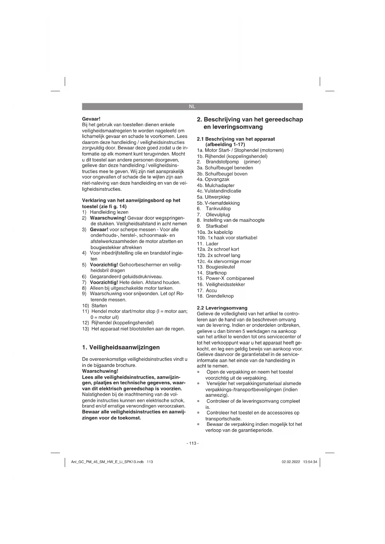 aangesloten aan de bougie. Veiligheidscontrole motorstart-/motorsto- phendel Om een ongewild starten van de grasmaaier te vermijden en te garanderen dat motor en mes bij gevaar snel stoppen, is deze uitgerust met een motorstart-/motorstophendel (fi g. 5a, pos. 1a). Deze moet geactiveerd worden (fi g. 5b), voordat de grasmaaier wordt gestart. Bij het loslaten van de motorstart-/motorstophendel moet deze terug- keren in zijn uitgangspositie (fi g. 5a). Voordat u de motor start, moet u deze procedure meermaals uitvoeren om er zeker van te zijn dat hendel en trekkabels correct functioneren. Herhaal deze test nog eens bij gestarte motor. Na loslaten van de motorstart-/motorstophendel moet de motor binnen enkele seconden stoppen. Is dit niet het geval, wend u dan tot de klanten- service. Gevaar: Het maaimes roteert als de motor wordt gestart. Anl_GC_PM_46_SM_HW_E_Li_SPK13.indb 116Anl_GC_PM_46_SM_HW_E_Li_SPK13.indb 116 02.02.2022 13:54:3502.02.2022 13:54:35NL