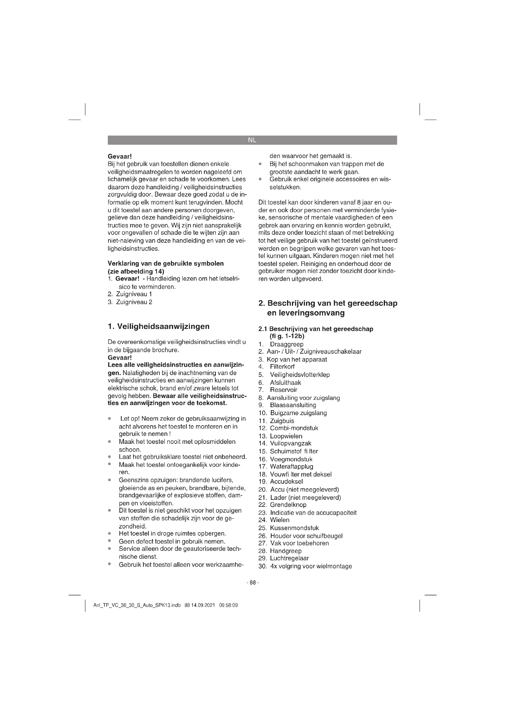 Schakelaarstand 0: Uit Schakelaarstand I: zuigniveau 1 Schakelaarstand II: zuigniveau 2 Anl_TP_VC_36_30_S_Auto_SPK13.indb 91 14.09.2021 09:58:09NL