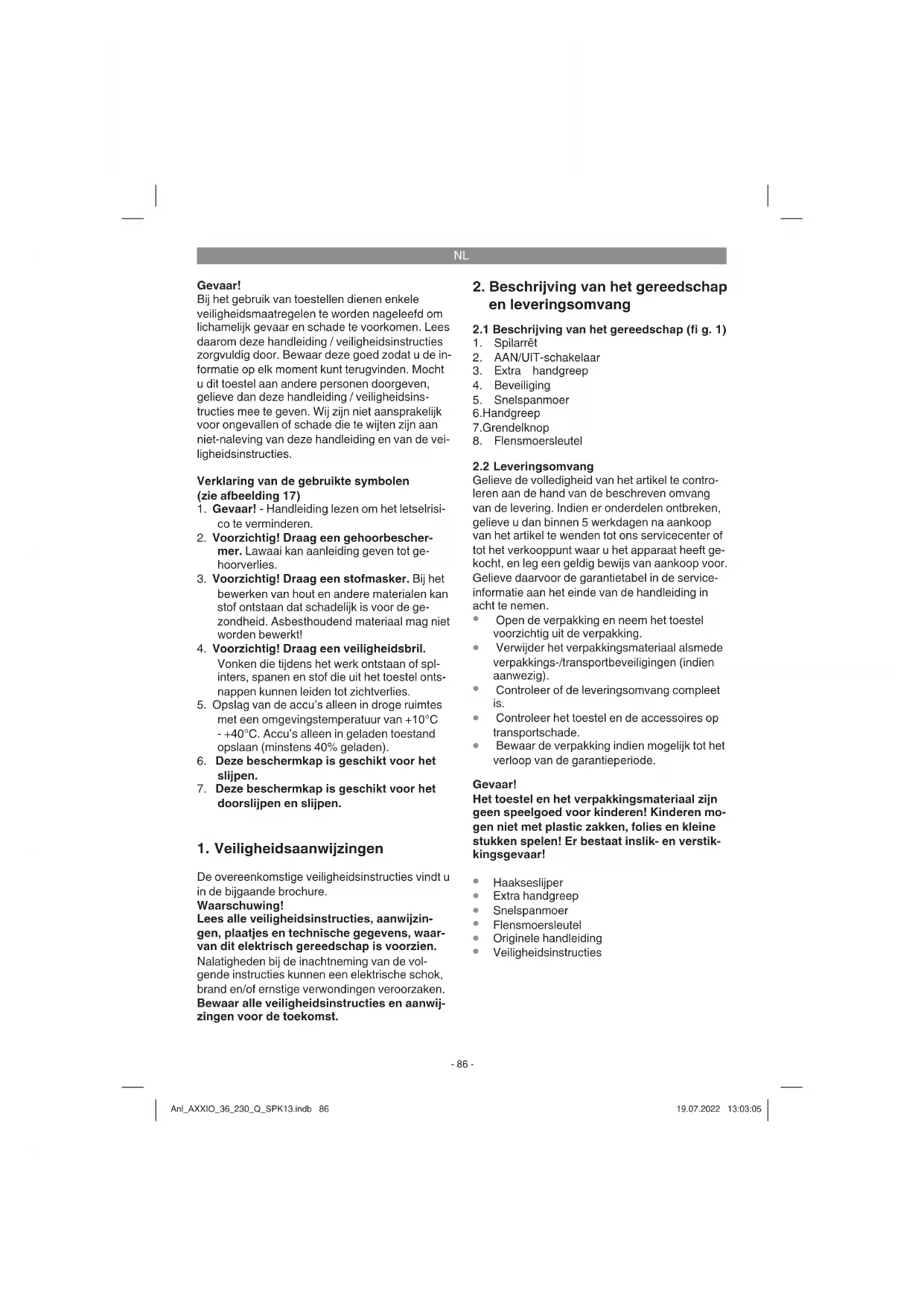 uit hand-arm-trillingen indien het toestel lang zonder onderbreking wordt gebruikt of niet naar behoren wordt gehanteerd en onder- houden. Anl_AXXIO_36_230_Q_SPK13.indb 87Anl_AXXIO_36_230_Q_SPK13.indb 87 19.07.2022 13:03:0519.07.2022 13:03:05NL