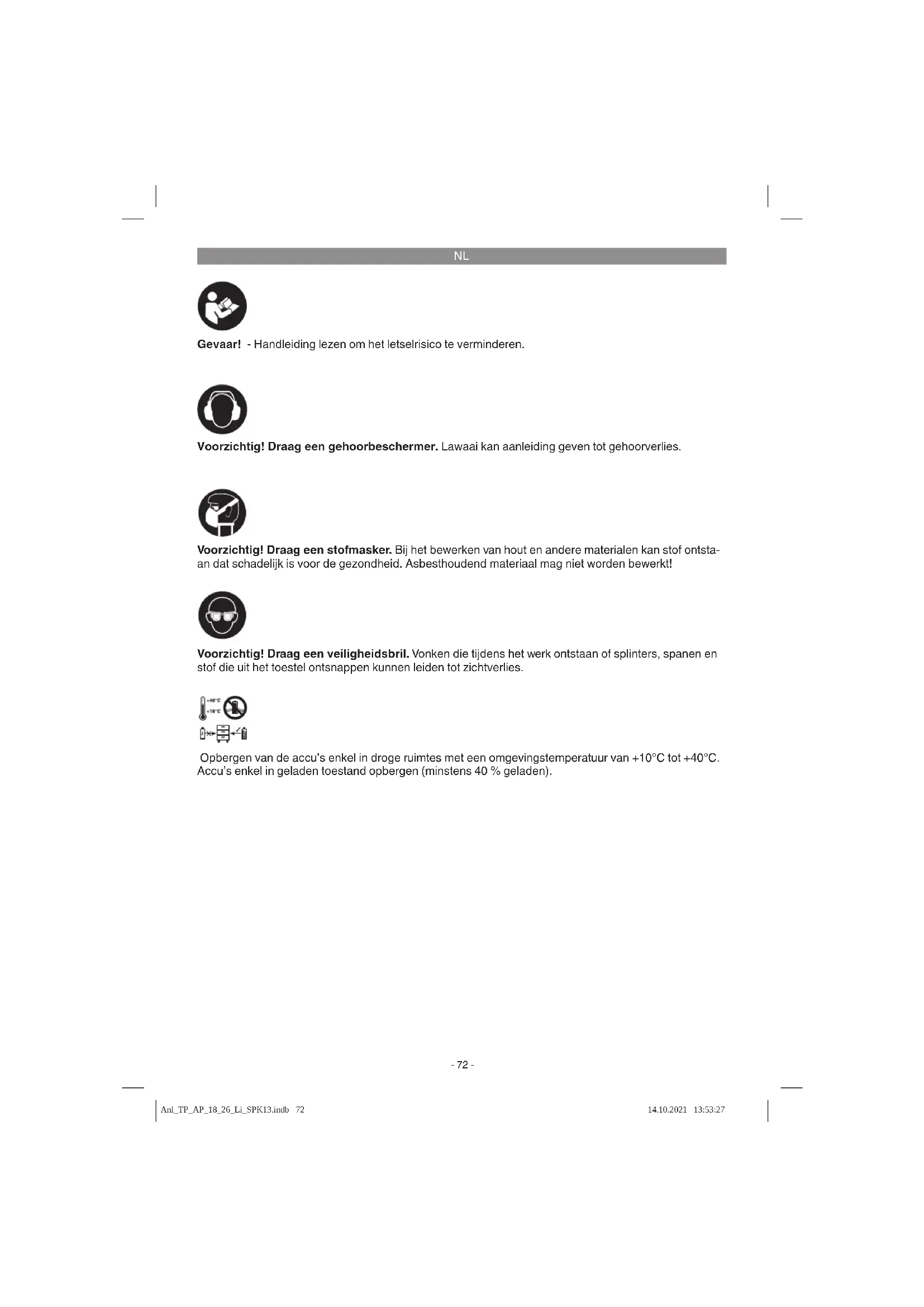 Gevaar! - Handleiding lezen om het letselrisico te verminderen. Voorzichtig! Draag een gehoorbeschermer. Lawaai kan aanleiding geven tot gehoorverlies. Voorzichtig! Draag een veiligheidsbril. Vonken die tijdens het werk ontstaan of splinters, spanen en stof die uit het toestel ontsnappen kunnen leiden tot zichtverlies. Voorzichtig! Draag een stofmasker. Bij het bewerken van hout en andere materialen kan stof ontsta- an dat schadelijk is voor de gezondheid. Asbesthoudend materiaal mag niet worden bewerkt! Opbergen van de accu’s enkel in droge ruimtes met een omgevingstemperatuur van +10°C tot +40°C. Accu’s enkel in geladen toestand opbergen (minstens 40 % geladen). Anl_TP_AP_18_26_Li_SPK13.indb 72Anl_TP_AP_18_26_Li_SPK13.indb 72 14.10.2021 13:53:2714.10.2021 13:53:27NL