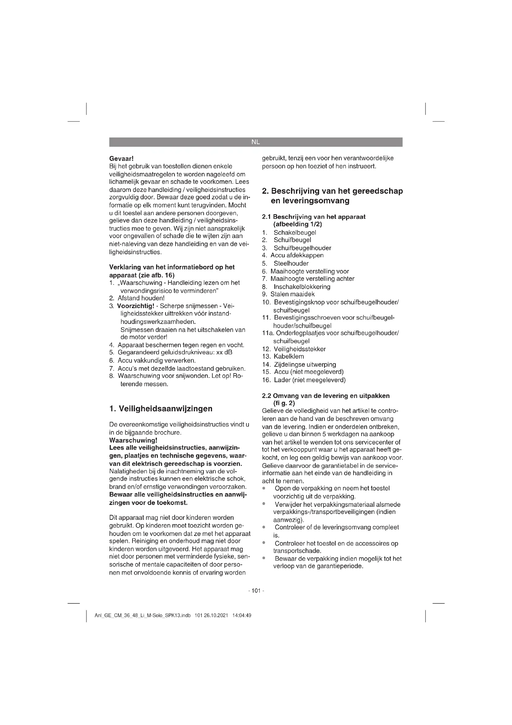 en de accupack op te sturen aan onze klantendienst. Voor een deskundige verzending verzoeken wij u contact op te nemen met onze klan- tendienst of het verkooppunt waar u het ap- paraat heeft aangekocht. Zorg er bij de verzending of verwerking van accu’s resp. het accu apparaat voor dat deze afzonderlijk worden verpakt in plastic zakken, om kortsluitingen en brand te vermijden! In het belang van een lange levensduur van de accupack is het raadzaam om op tijd voor het herladen van de accupack te zorgen. Dit is in elk geval noodzakelijk, wanneer u vaststelt dat het vermogen van het apparaat afneemt. Ontlaad de accupack nooit helemaal. Dat leidt tot een defect van de accupack! Montage van de accu (afb. 14) Open het accudeksel (pos. 4). Dan de accu´s zo- als getoond in afb. 14 in de houders steken. De beste resultaten voor levensduur en maai- vermogen bereikt u altijd, wanneer accu‘s met dezelfde capaciteit vanaf 2,5 Ah worden ingezet. Daarnaast bestaat de mogelijkheid om de tege- nover elkaar gelegen accuhouders A en B (afb. 2) uit te rusten met verschillende accucapaciteiten. Houd er echter rekening mee dat een accubank altijd moet worden gevoed door accu‘s met de- zelfde capaciteit (afb 15). Zo kunt u bijvoorbeeld een accubank uitrusten met 2x 4,0Ah accu’s, terwijl de accubank aan de tegenover gelegen zijde is uitgerust met 2x 3,0Ah accu‘s. Aanwijzing! Gebruik alleen accu´s met dezelfde vulstand, combineer nooit volle en halfvolle accu´s met el- kaar. Laad beide/alle accu´s altijd gelijktijdig op. De accu met de zwakkere laadtoestand bepaalt de looptijd van het apparaat. Vóór bedrijf moeten altijd beide/alle accu´s vol worden geladen. Sluit het accudeksel door het dicht te klappen en let erop dat het goed inklikt. Accu-capaciteitsindicatie (afb. 12) Druk op de schakelaar voor accu-capaciteitsindi- catie (afb. 12/pos. A). De accu-capaciteitsindicatie (afb. 12/pos. B) signaleert de laadtoestand van de accu aan de hand van 3 LEDs. Alle 3 LEDs branden: De accu is vol geladen. 2 of 1 LED(s) branden: De accu beschikt over voldoende restlading. 1 LED knippert: De accu is leeg, laad de accu op. Alle LEDs knipperen: De temperatuur van de accu is te laag. Verwijder de accu van het apparaat en laat de accu één dag liggen bij ruimtetemperatuur. Als de fout opnieuw optreedt, dan werd hij diep ontladen en is hij defect. Neem de accu van het apparaat. Een defecte accu mag niet meer gebruikt resp. gela- den worden. Voorzichtig! Parkeer de grasmaaier niet in de zon. Erin ge- plaatste accu‘s kunnen ontoelaatbaar warm worden. Anl_GE_CM_36_48_Li_M-Solo_SPK13.indb 104 26.10.2021 14:04:50NL