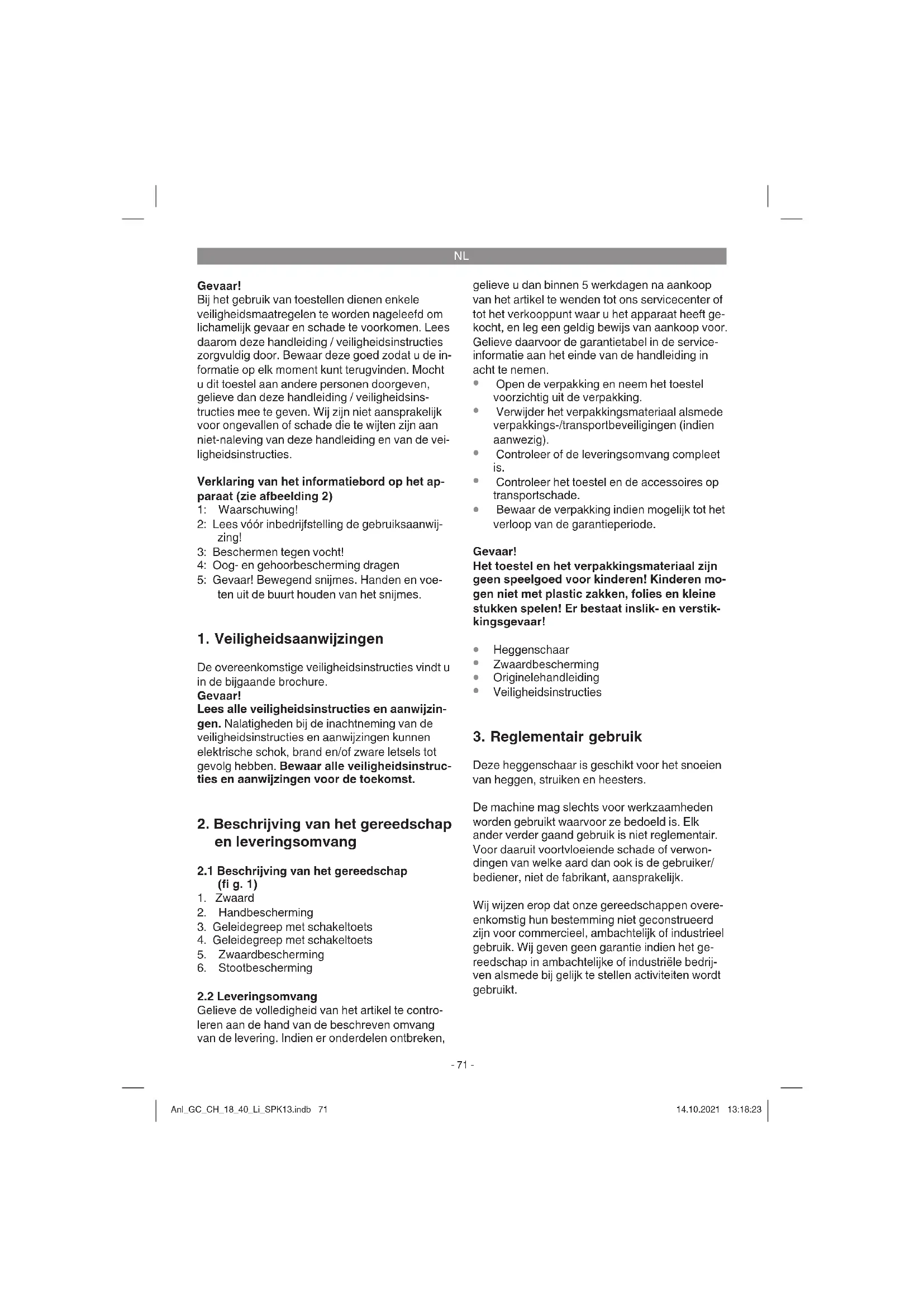 Deze heggenschaar is geschikt voor het snoeien van heggen, struiken en heesters. De machine mag slechts voor werkzaamheden worden gebruikt waarvoor ze bedoeld is. Elk ander verder gaand gebruik is niet reglementair. Voor daaruit voortvloeiende schade of verwon- dingen van welke aard dan ook is de gebruiker/ bediener, niet de fabrikant, aansprakelijk. Wij wijzen erop dat onze gereedschappen overe- enkomstig hun bestemming niet geconstrueerd zijn voor commercieel, ambachtelijk of industrieel gebruik. Wij geven geen garantie indien het ge- reedschap in ambachtelijke of industriële bedrij- ven alsmede bij gelijk te stellen activiteiten wordt gebruikt. Anl_GC_CH_18_40_Li_SPK13.indb 71Anl_GC_CH_18_40_Li_SPK13.indb 71 14.10.2021 13:18:2314.10.2021 13:18:23NL