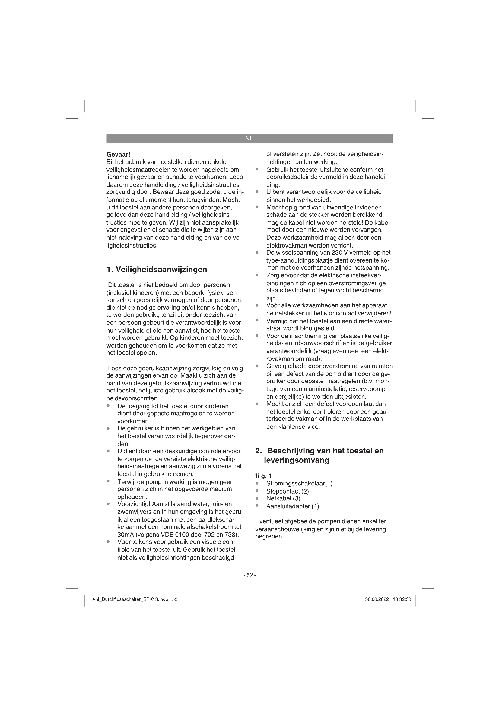 De stromingsschakelaar heeft geen instel- of schakelmogelijkheden; hij werkt volledig automa- tisch. Er wordt enkel de bedrijfstoestand door 3 LEDs (fi g. 2, pos. 8) gesignaleerd. Groene LED: De stromingsschakelaar is aangesloten op het stroomnet. Gele LED: De stromingsschakelaar heeft gereageerd, er staat spanning op het stopcontact (fi g. 1, pos. 2). Anl_Durchflussschalter_SPK13.indb 53Anl_Durchflussschalter_SPK13.indb 53 30.06.2022 13:32:3930.06.2022 13:32:39NL