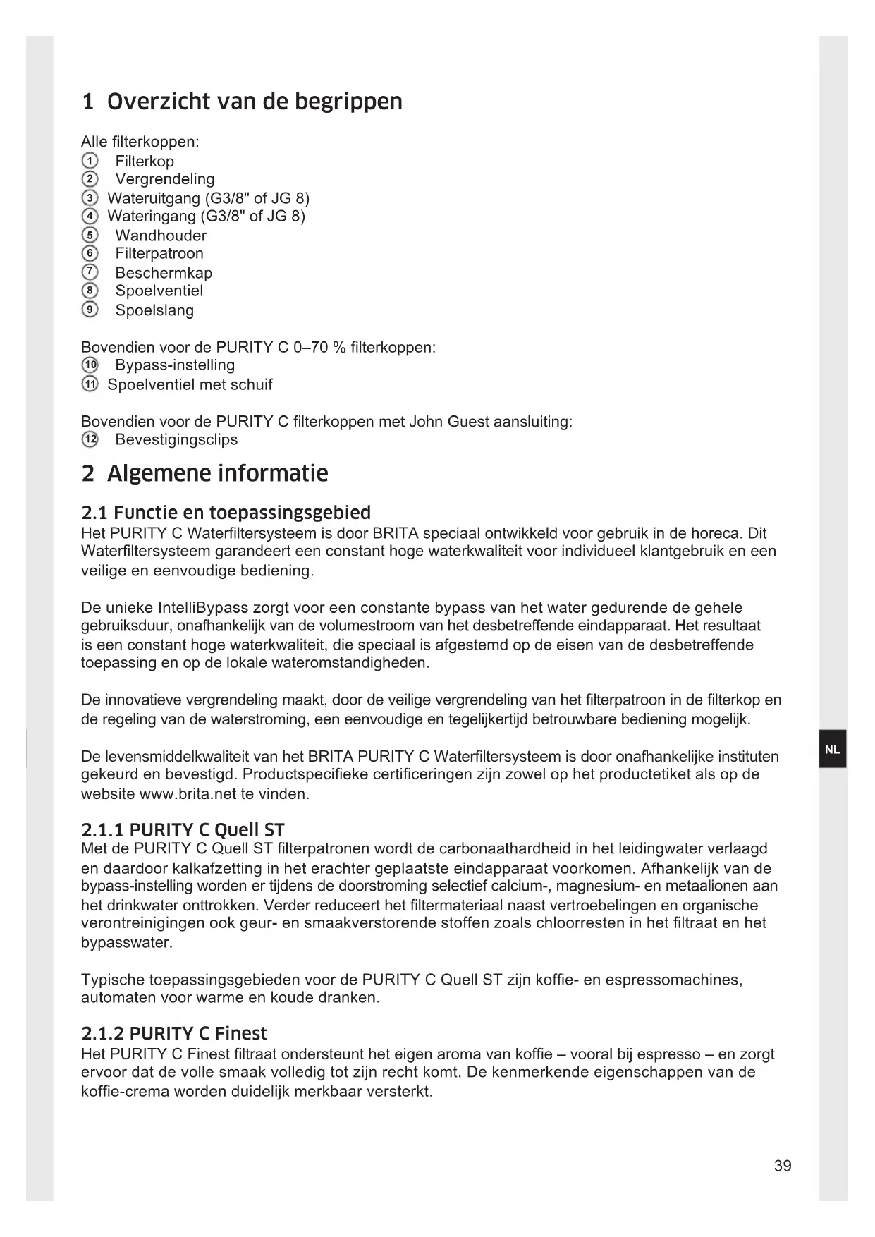 Het PURITY C Waterltersysteem is door BRITA speciaal ontwikkeld voor gebruik in de horeca. Dit Waterltersysteem garandeert een constant hoge waterkwaliteit voor individueel klantgebruik en een veilige en eenvoudige bediening. De unieke IntelliBypass zorgt voor een constante bypass van het water gedurende de gehele gebruiksduur, onafhankelijk van de volumestroom van het desbetreffende eindapparaat. Het resultaat is een constant hoge waterkwaliteit, die speciaal is afgestemd op de eisen van de desbetreffende toepassing en op de lokale wateromstandigheden. De innovatieve vergrendeling maakt, door de veilige vergrendeling van het lterpatroon in de lterkop en de regeling van de waterstroming, een eenvoudige en tegelijkertijd betrouwbare bediening mogelijk. De levensmiddelkwaliteit van het BRITA PURITY C Waterltersysteem is door onafhankelijke instituten gekeurd en bevestigd. Productspecieke certiceringen zijn zowel op het productetiket als op de website www.brita.net te vinden.