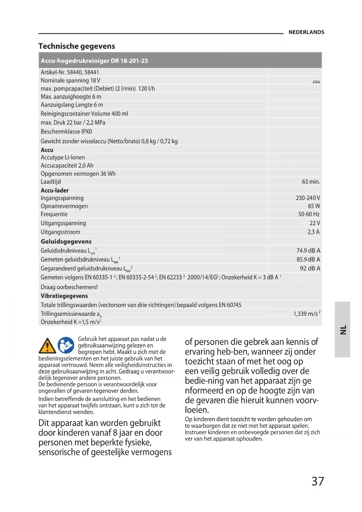 nen ook onzichtbare restrisico’s bestaan. Symbolen Waarschuwing / Opgelet! Gebruiksaanwijzing lezen Voor alle instel-, schoonmaak- en onde- rhoudswerkzaamheden aan de machine de wisselaccu uitemen. Stoom, Sproeinevel Draag veiligheidskleding. Draag een veiligheidsbril. Draag beschermende handschoenen. Kracht gebruiken Zich in de verpompte vloeistof ophouden is verboden Tegen vocht beschermen. Stel de machine niet bloot aan regen. Houd kinderen van de machine op afstand. Tegen koude beschermen Beschermklasse III CE Symbool Beschadigde en/of verwijderde elektrische of elektronische apparaten bij de daarvoor bestemde recyclingplaatsen aeveren Accu Gebruiksaanwijzing lezen Accu tegen temperaturen boven 40°C beschermen Accu tegen hitte en vuur beschermen. Accu tegen water en vocht beschermen Li-Ion Verwijder de accu’s niet in het huisafval! Geef de accu’s af op een verzamelplaats voor oude batterijen waar deze milieuvrien- delijk worden gerecycled. Accu-lader Waarschuwing / Opgelet! Gebruiksaanwijzing lezen Het laadapparaat uitsluitend in binnenruim- ten gebruiken Accu leeg Accu geladen Polariteit Beschermklasse II CE Symbool Beschadigde en/of verwijderde elektri- sche of elektronische apparaten bij de daarvoor bestemde recyclingplaatsen aeveren Verpakkingsoriëntering boven NL39 NEDERLANDS Veiligheidsaanwijzingen voor de accu- hogedrukreiniger Richt het apparaat nooit op uzelf of op andere perso- nen in uw omgeving. Draag een veiligheidsbril en geschikte beschermende kleding als bescherming tegen terugspattend water en vuil. Bij het werken met het apparaat moeten personen die zich in de directe omgeving bevinden beschermende kleding dragen. Houd kinderen en andere personen tijdens het gebruik van het elektrische gereedschap uit de buurt. Gebruik het apparaat niet in de buurt van ontvlambare vloeistoen of gassen. Bij kortsluiting bestaat brand- en explosiegevaar. Vernevel geen brandbare vloeistoen. Er bestaat explosiegevaar. Richt de straal van het apparaat niet op apparatuur met elektrische componenten, bijv. de binnenkant van een fornuis. Bij gebruik van het apparaat met de aanzuigslang ontstaat struikelgevaar. De aanzuigslang mag niet worden geknikt, platgedrukt of overreden. Er bestaat gevaar voor beschadiging en daaruit voortvloeiend gevaar voor letsel. Het apparaat mag niet in gebruik worden genomen als de aanzuigslang, de sproeiers of de sproeilans beschadigd zijn. Niet gebruiken voor het reinigen van vensters. Bescherm het apparaat tegen vorst en drooglopen. Draag stevige schoenen ter bescherming tegen elektri
