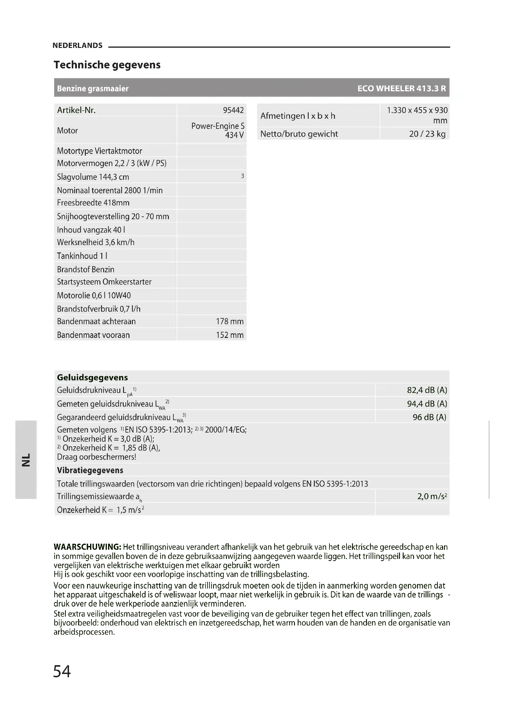 Netto/bruto gewicht 20 / 23 kg WAARSCHUWING: Het trillingsniveau verandert afhankelijk van het gebruik van het elektrische gereedschap en kan in sommige gevallen boven de in deze gebruiksaanwijzing aangegeven waarde liggen. Het trillingspeil kan voor het vergelijken van elektrische werktuigen met elkaar gebruikt worden Hij is ook geschikt voor een voorlopige inschatting van de trillingsbelasting. Voor een nauwkeurige inschatting van de trillingsdruk moeten ook de tijden in aanmerking worden genomen dat het apparaat uitgeschakeld is of weliswaar loopt, maar niet werkelijk in gebruik is. Dit kan de waarde van de trillings