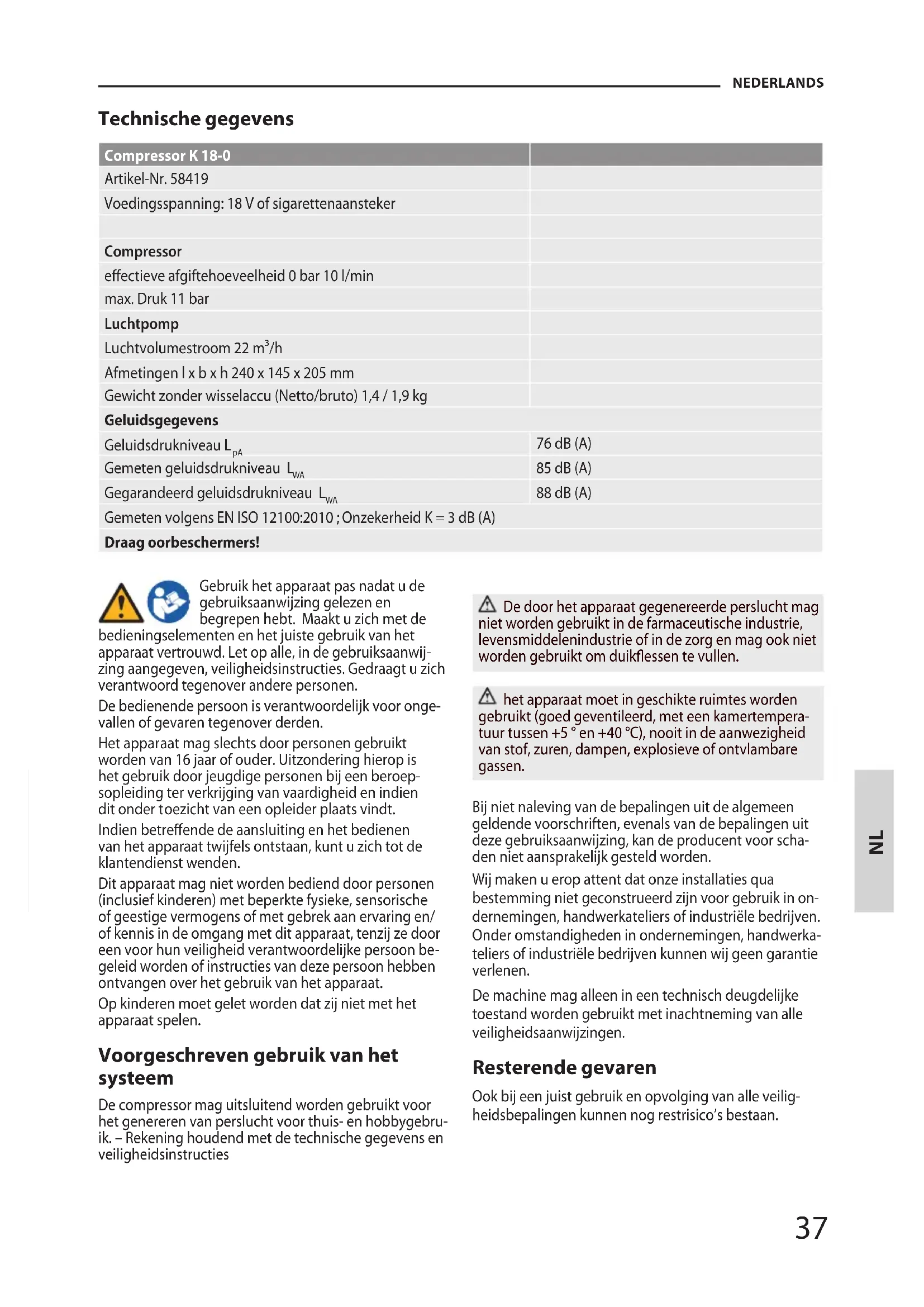 tvangen over het gebruik van het apparaat. Op kinderen moet gelet worden dat zij niet met het apparaat spelen. Voorgeschreven gebruik van het systeem De compressor mag uitsluitend worden gebruikt voor het genereren van perslucht voor thuis- en hobbygebru- ik. – Rekening houdend met de technische gegevens en veiligheidsinstructies De door het apparaat gegenereerde perslucht mag niet worden gebruikt in de farmaceutische industrie, levensmiddelenindustrie of in de zorg en mag ook niet worden gebruikt om duikessen te vullen. het apparaat moet in geschikte ruimtes worden gebruikt (goed geventileerd, met een kamertempera- tuur tussen +5 ° en +40 °C), nooit in de aanwezigheid van stof, zuren, dampen, explosieve of ontvlambare gassen. Bij niet naleving van de bepalingen uit de algemeen geldende voorschriften, evenals van de bepalingen uit deze gebruiksaanwijzing, kan de producent voor scha- den niet aansprakelijk gesteld worden.