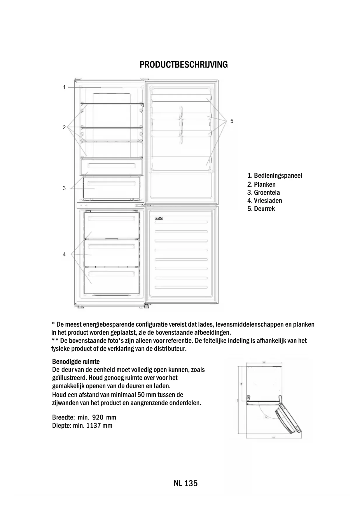 Benodigde ruimte De deur van de eenheid moet volledig open kunnen, zoals geïllustreerd. Houd genoeg ruimte over voor het gemakkelijk openen van de deuren en laden. Houd een afstand van minimaal 50 mm tussen de zijwanden van het product en aangrenzende onderdelen. Breedte: min. 920 mm Diepte: min. 1137 mmNL 136 A. Aan/uit-toets, gebruikt om het apparaat aan/uit te zetten. B. Wifitoets, gebruikt om de wifi in/uit te schakelen C. Mode-toets, gebruikt om de gewenste functie te selecteren D. TEMP-toets, gebruikt om de koelkast- en vriezertemperatuur te selecteren a. Pictogram voor koelkast-/vriezergedeelte, geeft aan welke ruimte van het apparaat is geselecteerd b. Pictogram voor supervriezen, geeft aan of de supervriesfunctie geactiveerd is c. Temperatuurniveaus van de vriezer, geven aan wat de geselecteerde temperatuur is d. Pictogram voor superkoelen, geeft aan of de superkoelfunctie geactiveerd is e. Temperatuurniveaus van de koelkast, geven aan wat de geselecteerd temperatuur is f. Pictogram aangepaste temperatuur, geeft aan of de temperatuur vanuit de app is geselecteerd g. Eco-moduspictogram, geeft aan of de Eco-modus geactiveerd is h. Vakantiefunctiepictogram, geeft aan of de vakantiefunctie geactiveerd is