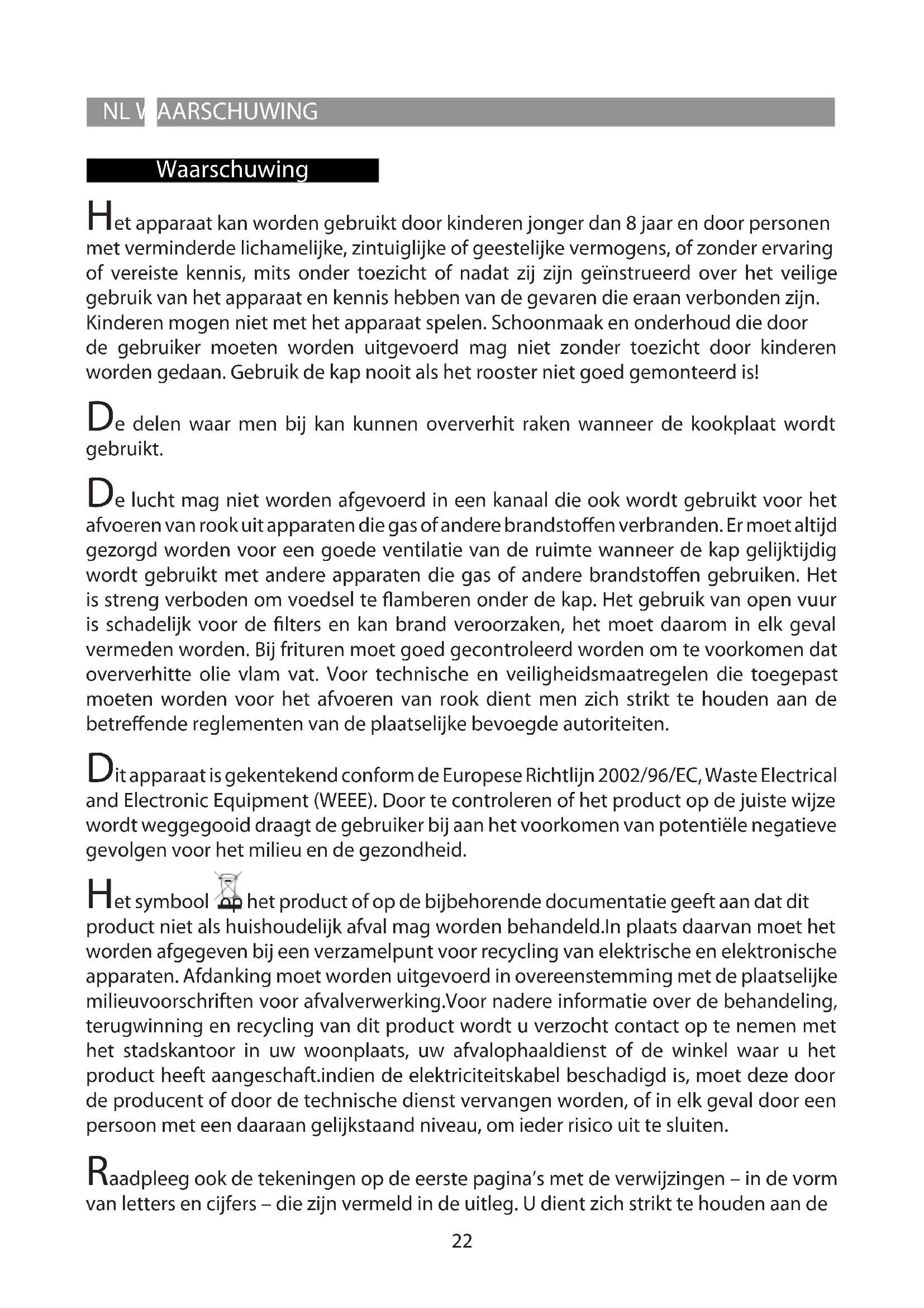 FENTRETIEN Entretien Veillez a débrancher la hotte du réseau électrique avant toute intervention sur celle- ci. Nettoyage La hotte doit être nettoyée fréquemment tant à l’intérieur (à l’exception de la zone derrière le ltre à graisse) qu’à l’extérieur. Pour le nettoyage, utilisez un chion avec des détergents liquides neutres. Évitez d’utiliser des produits à base d’abrasifs. Attention Le non respect des règles de nettoyage de la hotte, de la substitution et du nettoyage des ltres comporte des risques d’incendie. Nous recommandons donc vivement de respecter ces instructions. Filtre antigraisse doit être nettoyé une fois par mois avec un détergent non agressif, à la main ou dans le lave vaisselle à basse température et pendant un cycle court. Le lavage du ltre anti-graisse métallique au lave-vaisselle peut en provoquer la décoloration. Toutefois, les caractéristiques de ltrage ne seront en aucun cas modiées. Filtre à charbon (seulement pour les versions ltrantes) Le ltre à charbons actifs F n’est ni lavable ni recyclable. En cas d’usage normal, il doit être remplacé tous les 6 mois. Il retient les mauvaises odeurs issues de la cuisson. Réduction de l’impact environnemental: Pour contenir les consommations de l’électroménager, il est conseiller de toujours utiliser la vitesse d’aspiration la plus basse parmi celles les plus adaptées au type de cuisson en cours, de ne pas laisser le dispositif en fonction pour plus de 15 minutes après l’arrêt des feux et de toujours éteindre les lumières si le consommateur s’éloigne de la zone de cuisson. Changement de l’ampoule Attention! Avant de toucher les lampes, assurez-vous qu’elles soient froides. LAMPES À LED En cas de dysfonctionnement du groupe d’éclairage à leds, contactez le service d’assistance technique pour remplacer la totalité du groupe.22 Waarschuwing NL WAARSCHUWING Het apparaat kan worden gebruikt door kinderen jonger dan 8 jaar en door personen met verminderde lichamelijke, zintuiglijke of geestelijke vermogens, of zonder ervaring of vereiste kennis, mits onder toezicht of nadat zij zijn geïnstrueerd over het veilige gebruik van het apparaat en kennis hebben van de gevaren die eraan verbonden zijn. Kinderen mogen niet met het apparaat spelen. Schoonmaak en onderhoud die door de gebruiker moeten worden uitgevoerd mag niet zonder toezicht door kinderen worden gedaan. Gebruik de kap nooit als het rooster niet goed gemonteerd is! De delen waar men bij kan kunnen oververhit raken wanneer de kookplaat wordt gebruikt. De lucht mag niet worden afgevoerd in een kanaal die ook wordt gebruikt voor het afvoeren van rook uit apparaten die gas of andere brandstoen verbranden. Er moet altijd gezorgd worden voor een goede ventilatie van de ruimte wanneer de kap gelijktijdig wordt gebruikt met andere apparaten die gas of andere brandstoen gebruiken. Het is streng verboden om voedsel te amberen onder de kap. Het gebruik van open vuur is schadelijk voor de lters en kan brand veroorzaken, het moet daarom in elk geval vermeden worden. Bij frituren moet goed gecontroleerd worden om te voorkomen dat oververhitte olie vlam vat. Voor technische en veiligheidsmaatregelen die toegepast moeten worden voor het afvoeren van rook dient men zich strikt te houden aan de betreende reglementen van de plaatselijke bevoegde autoriteiten. Dit apparaat is gekentekend conform de Europese Richtlijn 2002/96/EC, Waste Electrical and Electronic Equipment (WEEE). Door te controleren of het product op de juiste wijze wordt weggegooid draagt de gebruiker bij aan het voorkomen van potentiële negatieve gevolgen voor het milieu en de gezondheid. Het symbool op het product of op de bijbehorende documentatie geeft aan dat dit product niet als huishoudelijk afval mag worden behandeld.In plaats daarvan moet het worden afgegeven bij een verzamelpunt voor recycling van elektrische en elektronische apparaten. Afdanking moet worden uitgevoerd in overeenstemming met de plaatselijke milieuvoorschriften voor afvalverwerking.Voor nadere informatie over de behandeling, terugwinning en recycling van dit product wordt u verzocht contact op te nemen met het stadskantoor in uw woonplaats, uw afvalophaaldienst of de winkel waar u het product heeft aangeschaft.indien de elektriciteitskabel beschadigd is, moet deze door de producent of door de technische dienst vervangen worden, of in elk geval door een persoon met een daaraan gelijkstaand niveau, om ieder risico uit te sluiten. Raadpleeg ook de tekeningen op de eerste pagina’s met de verwijzingen – in de vorm van letters en cijfers – die zijn vermeld in de uitleg. U dient zich strikt te houden aan deNLWAARSCHUWING aanwijzingen in deze gebruiksaanwijzing. Elke aansprakelijkheid voor eventuele ongelukken, schade of brand veroorzaakt door het apparaat, voortkomend uit het niet opvolgen van de instructies in deze gebruiksaanwijzing, wordt afgewezen. Aangeraden wordt om de kap niet te bevestigen aan een muur die het gewicht niet kan dragen, bijvoorbeeld een wand van gipskarton, en om het apparaat niet in een kast in te bouwen. In het geval van een elektrisch fornuis moet de afzuigkap minstens 60 cm van de kookplaat afgelegen zijn en 60 cm in geval van gas of gemengd fornuis. Indien in de installatie-aanwijzing van het gaskooktoestel een grotere afstand wordt aangegeven moet hiermee rekening worden gehouden. De afzuigkap is voorzien van een boven luchtafvoer B voor de afvoer van rook naar buiten in geval van modellen met schoorsteen C (Zuigversie A - afvoerbuis niet bijgeleverd). In het geval dat het niet mogelijk is dampen en rook naar buiten af te voeren ook al is men voorzien van het model met schoorsteen C, kan de afzuigkap in de lterversie F gebruikt worden door de montage van 1 koolstolter F, de rook en de dampen worden gerecycleerd door middel van het bovenrooster G. Controleer of er in de buurt van de kap een elektrisch stopcontact is en of de installatie voorzien i