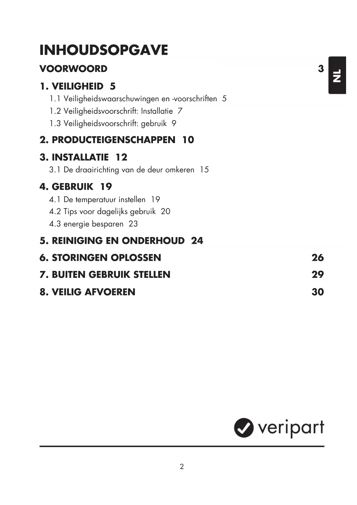Auteursrecht De in deze handleiding afgebeelde gegevens, waaronder begrepen teksten, foto’s, grasche tekeningen, beeldmerken, (handels)namen en logo’s, zijn eigendom van Coolblue B.V. en worden beschermd door het auteursrecht, merkenrecht en/ of enig ander intellectueel eigendomsrecht, tenzij deze gegevens toebehoren aan een derde. Het is u nimmer toegestaan de inhoud van de handleiding geheel of gedeeltelijk te reproduceren, over te dragen, te verspreiden, te bewaren of tegen vergoeding beschikbaar te stellen aan derden, zonder de voorafgaande schriftelijke toestemming van Coolblue B.V. en/of de derde waar de gegevens aan toebehoren. Contactgegevens Veripart Veripart is een geregistreerd merk van Coolblue B.V. De klantenservice kunt u bereiken via: www.coolblue.nl/klantenservice OPMERKING